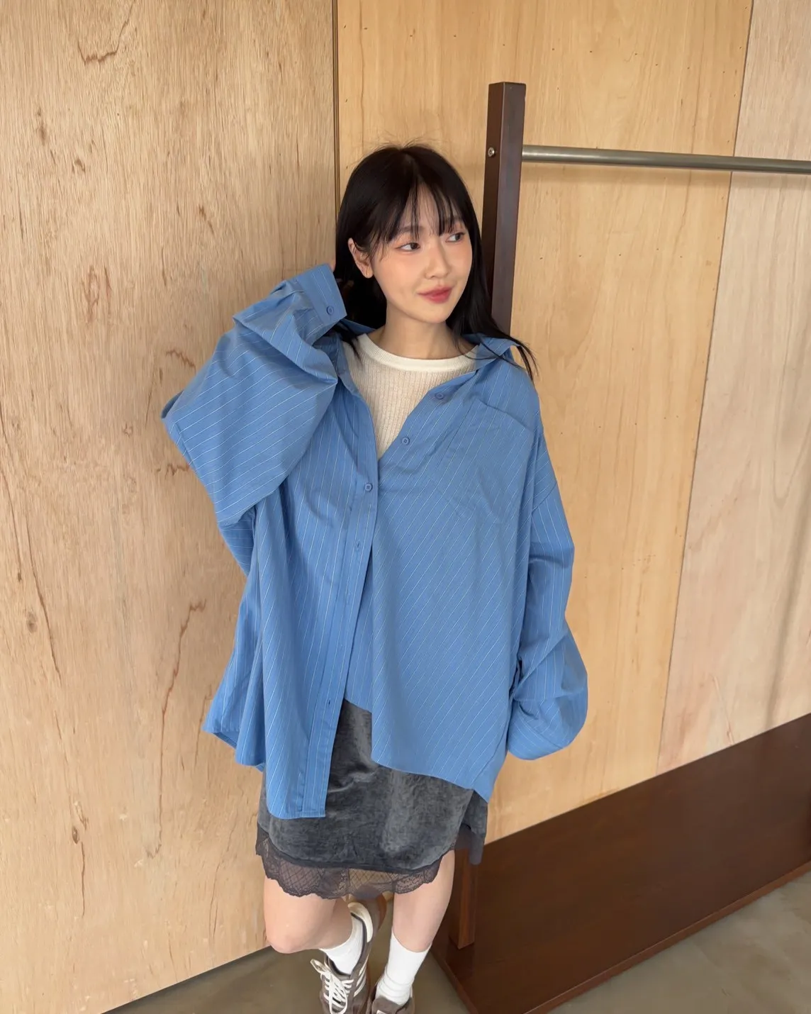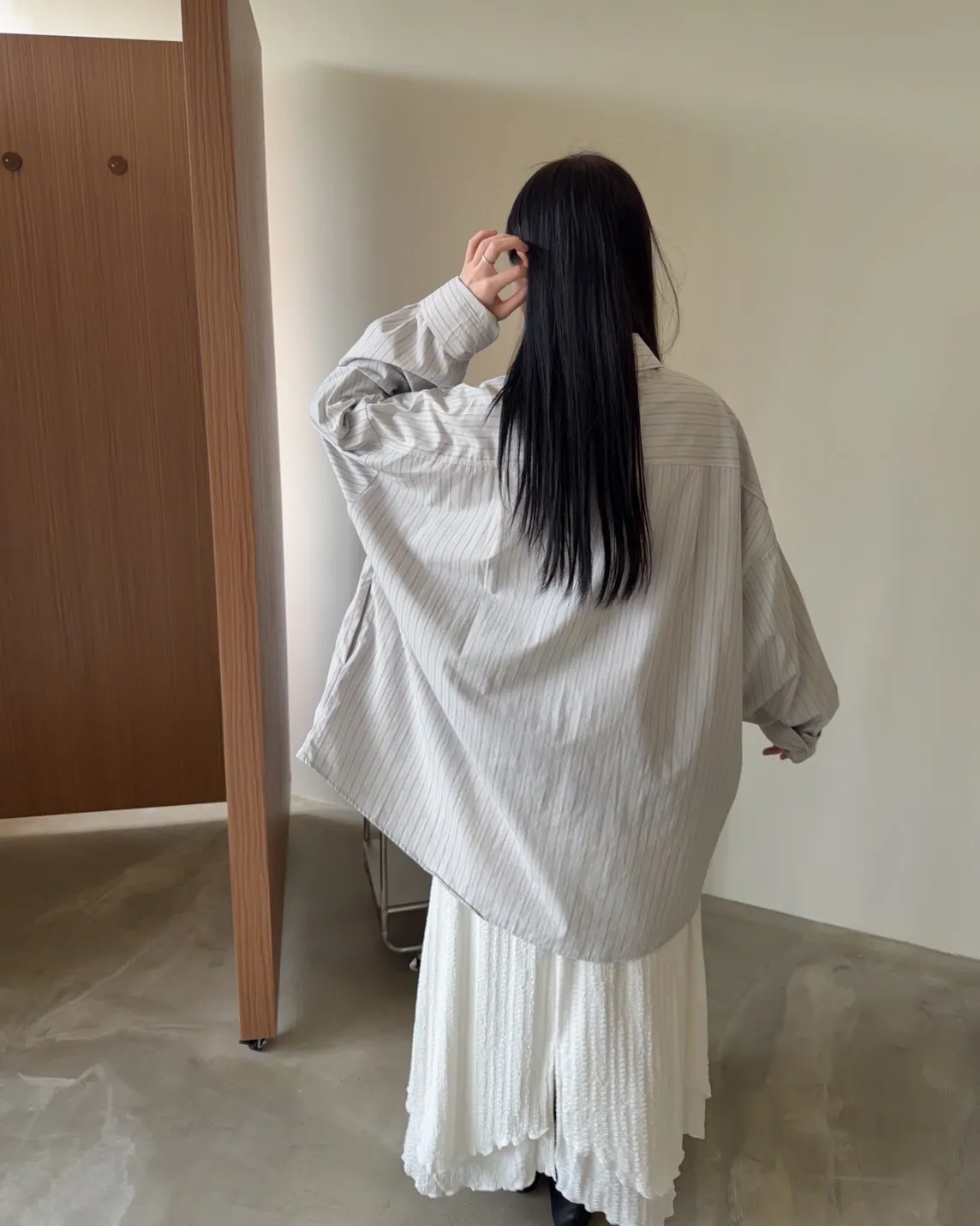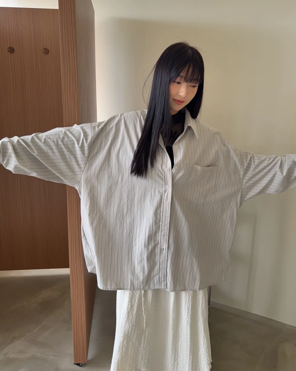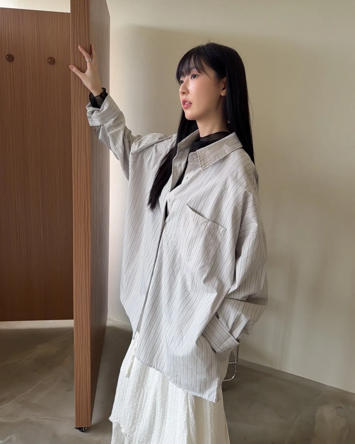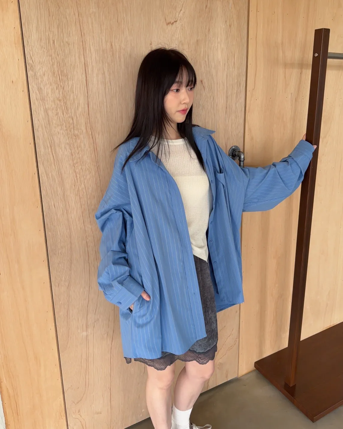 寬鬆落肩 直條紋 兩側口袋 前短後長