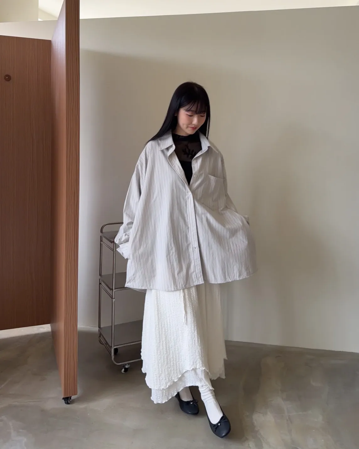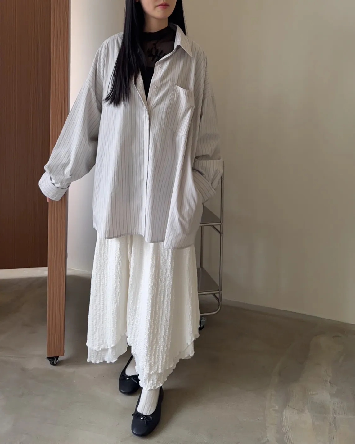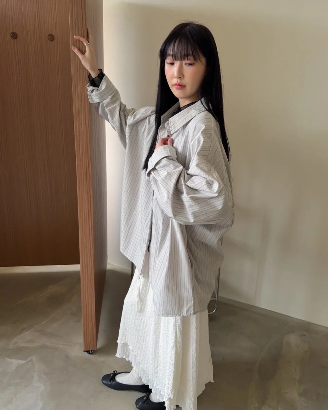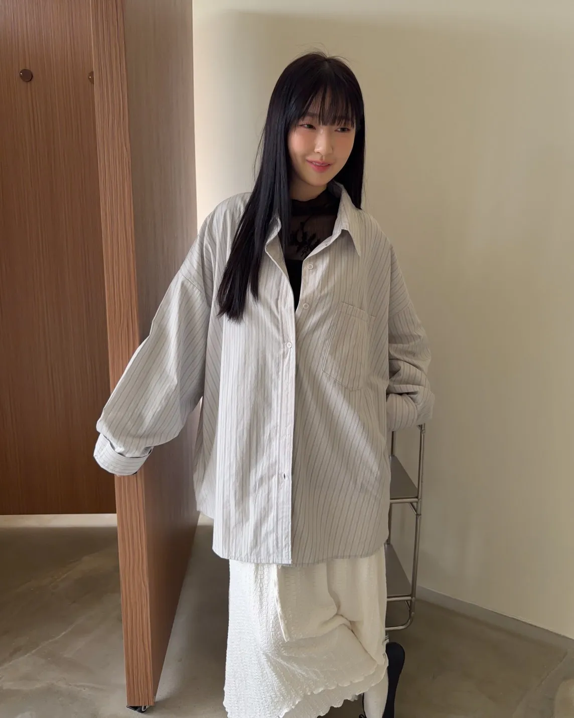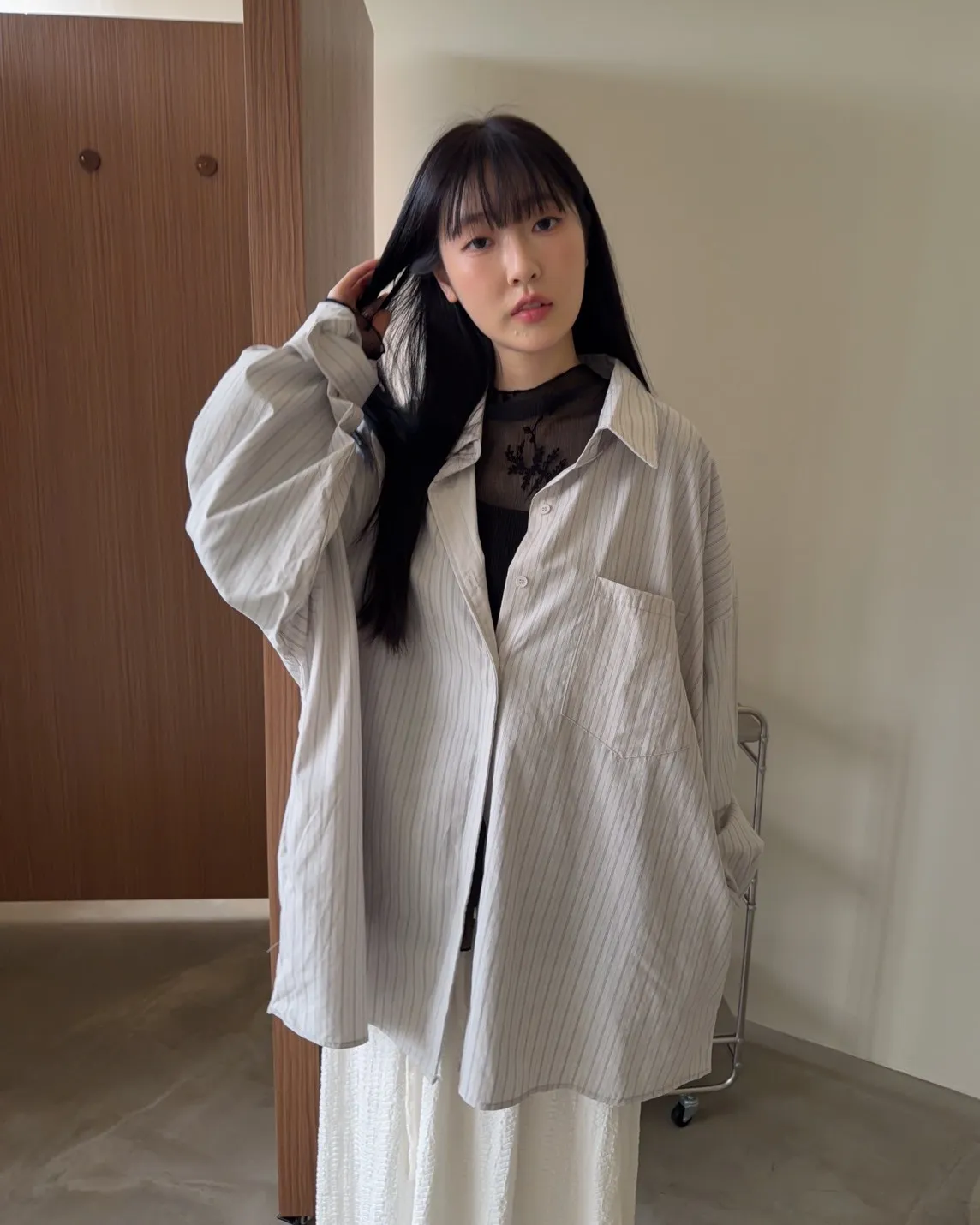 寬鬆落肩 直條紋 兩側口袋 前短後長