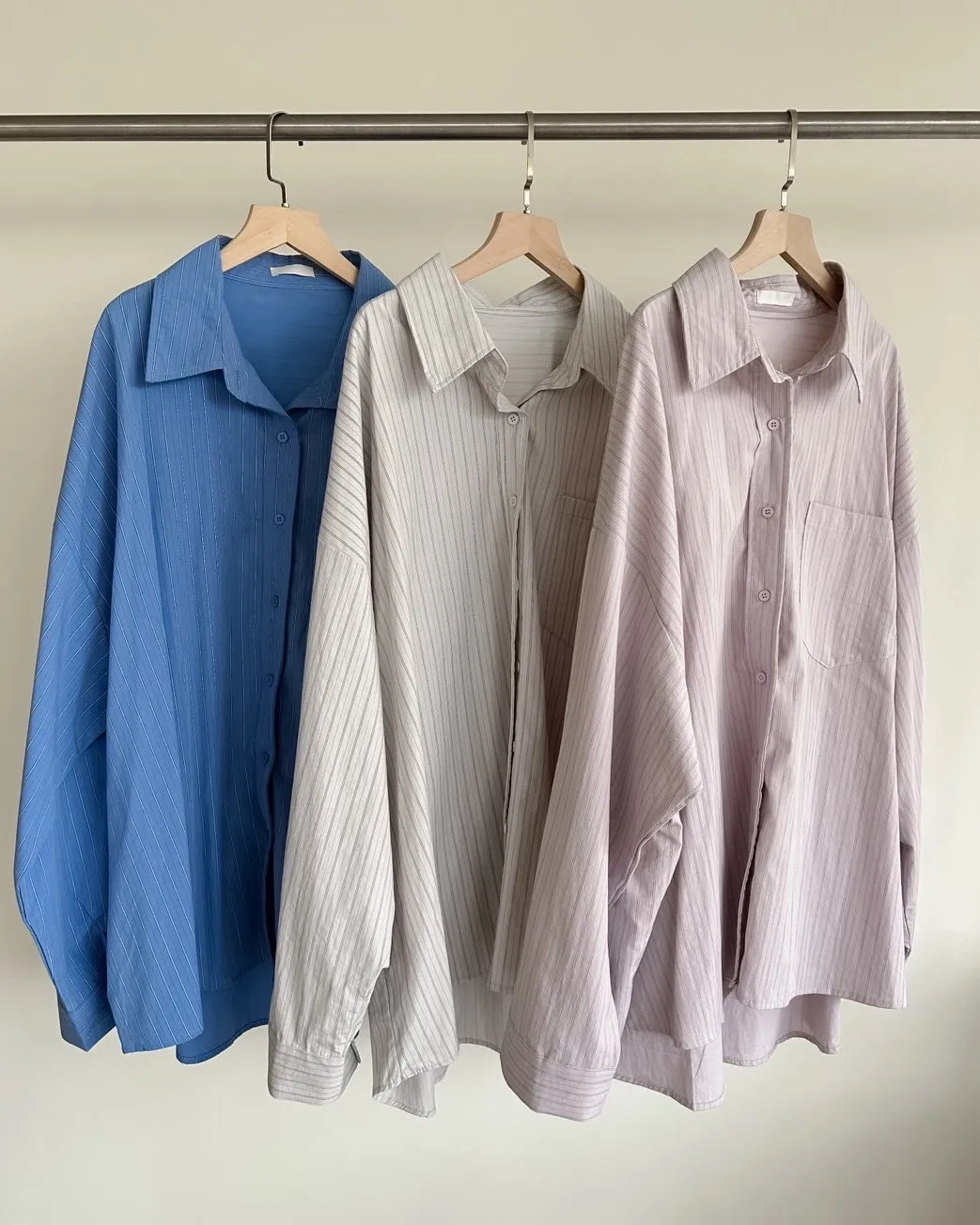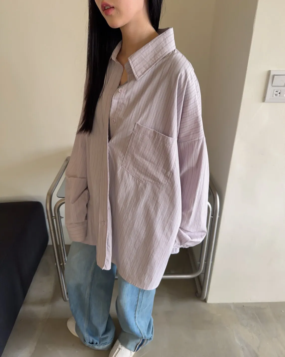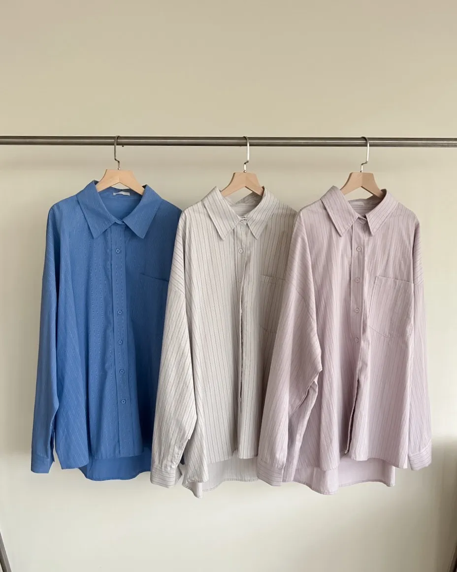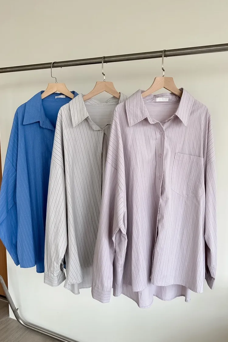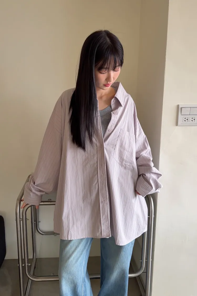 A0030簡約有口袋直條紋寬鬆襯衫(杏/粉紫/藍)