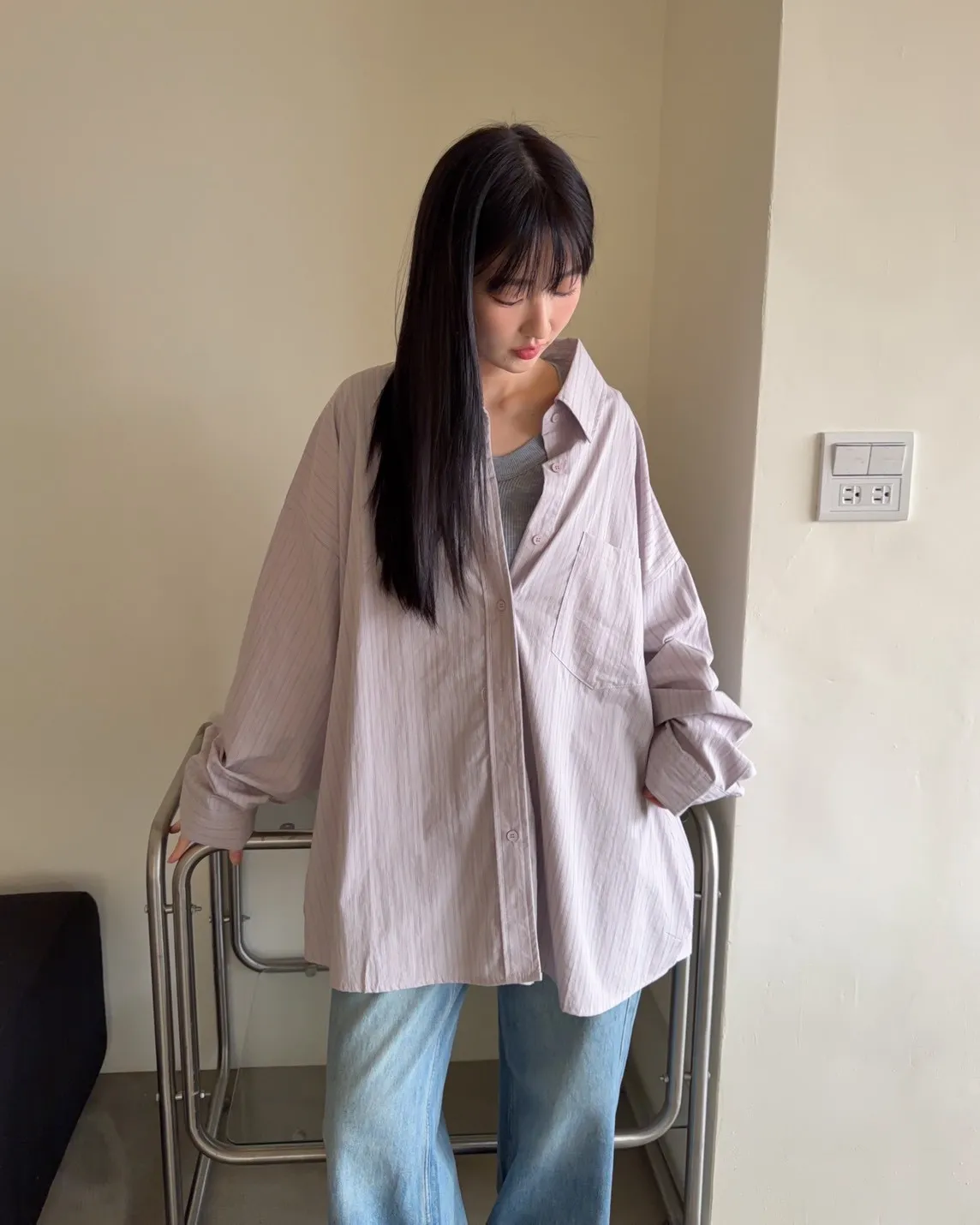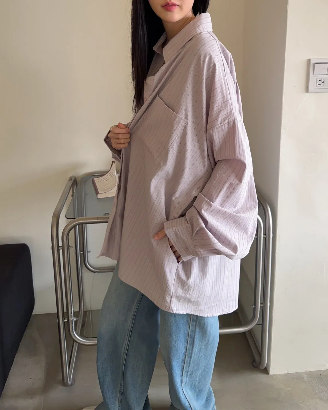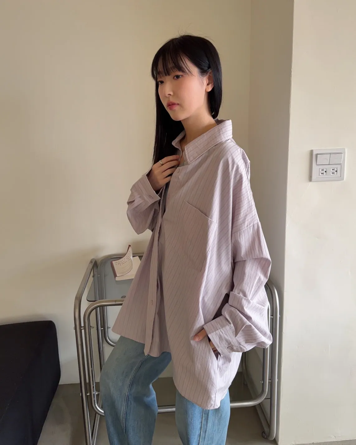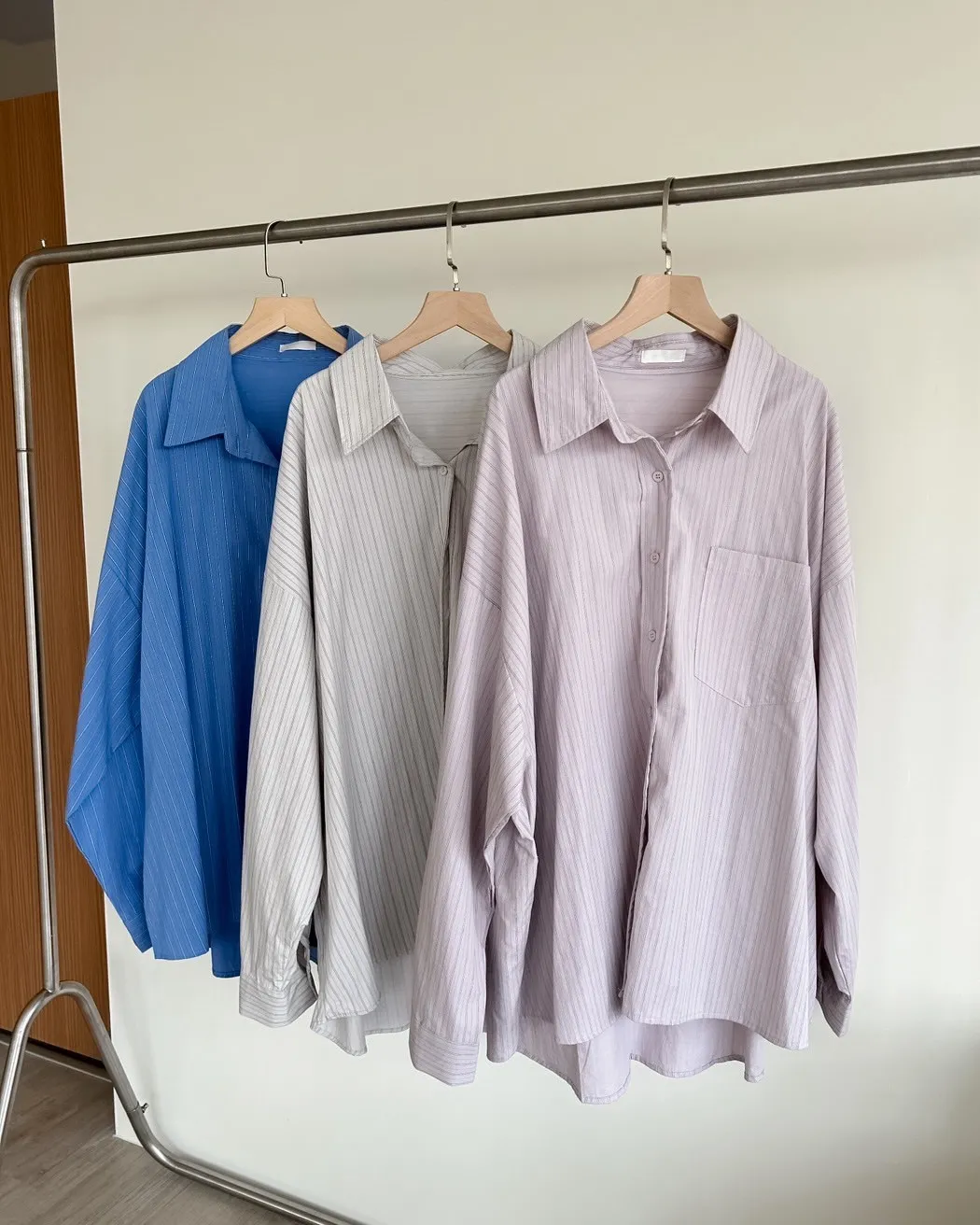 A0030簡約有口袋直條紋寬鬆襯衫(杏/粉紫/藍)