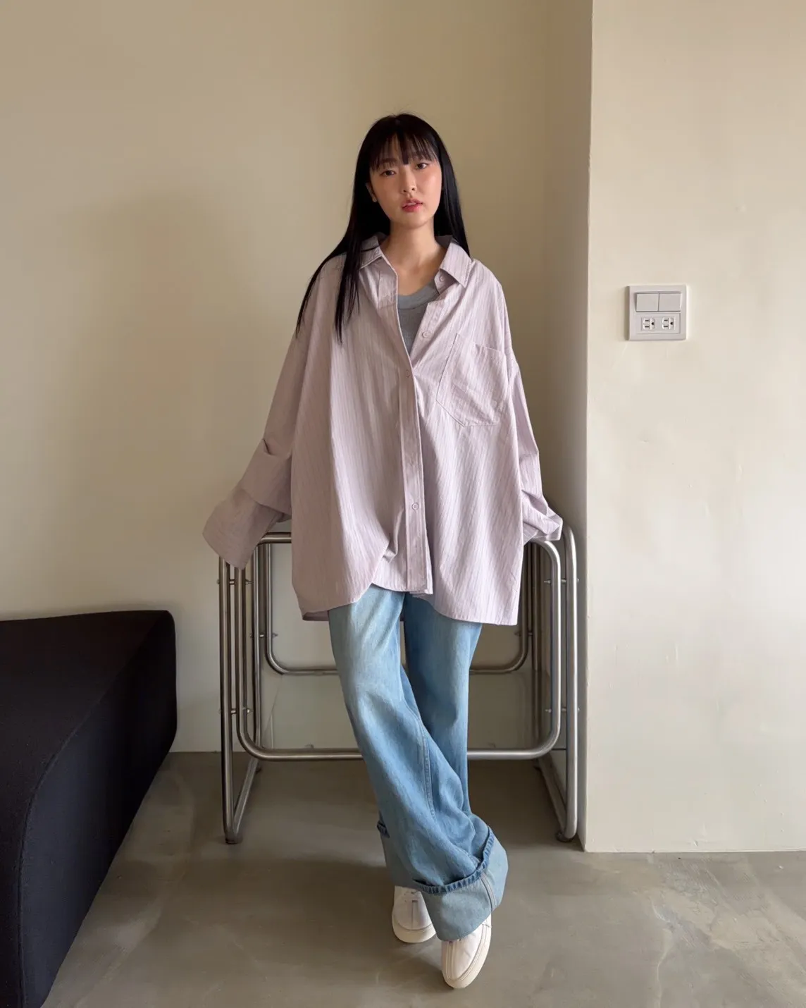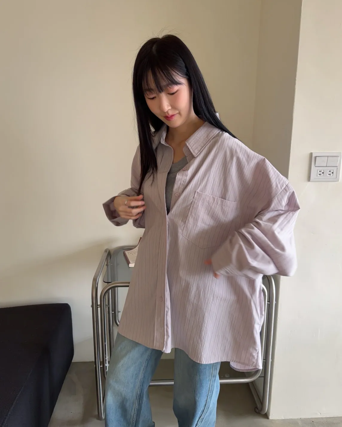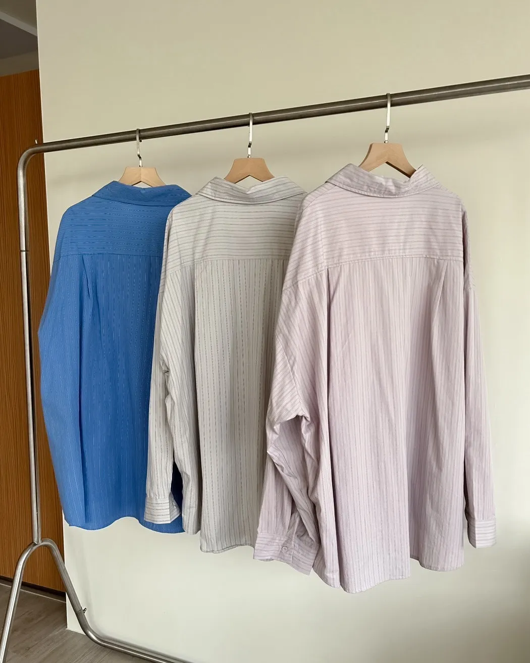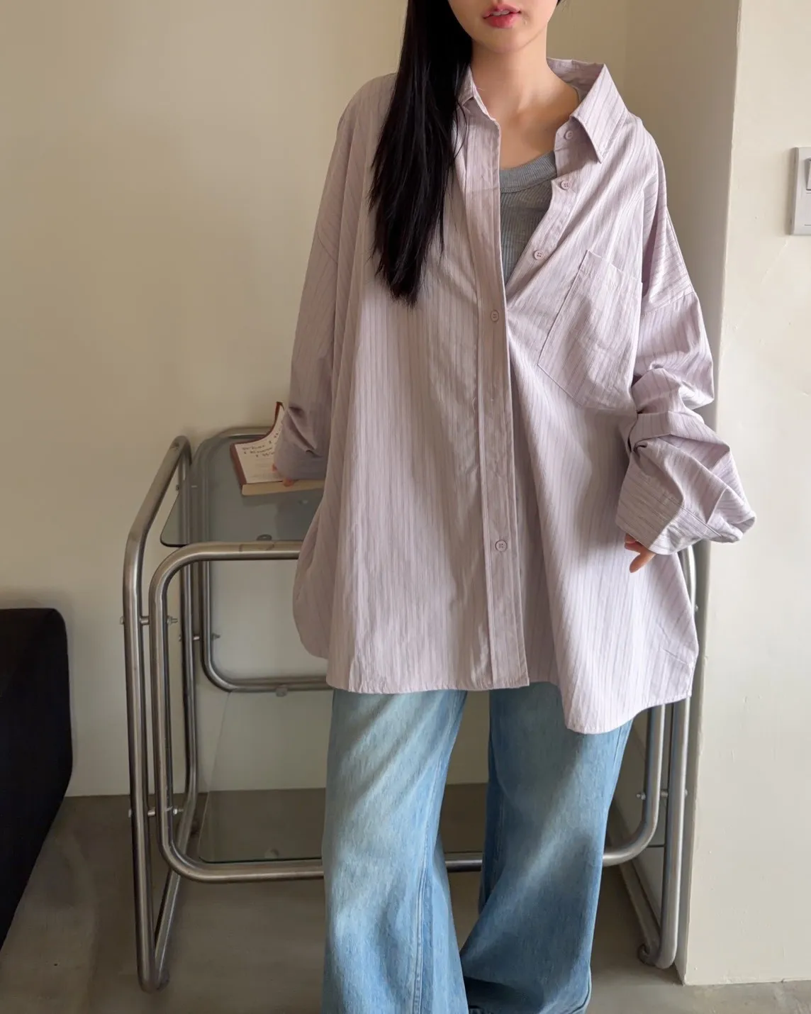 A0030簡約有口袋直條紋寬鬆襯衫(杏/粉紫/藍)