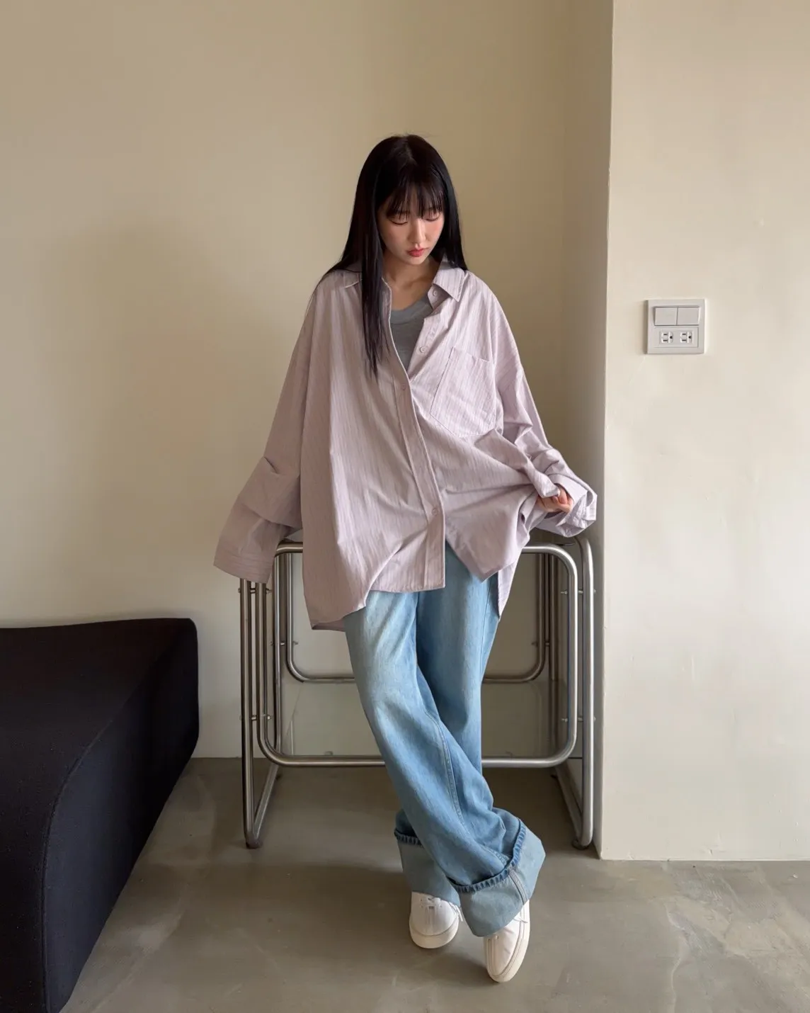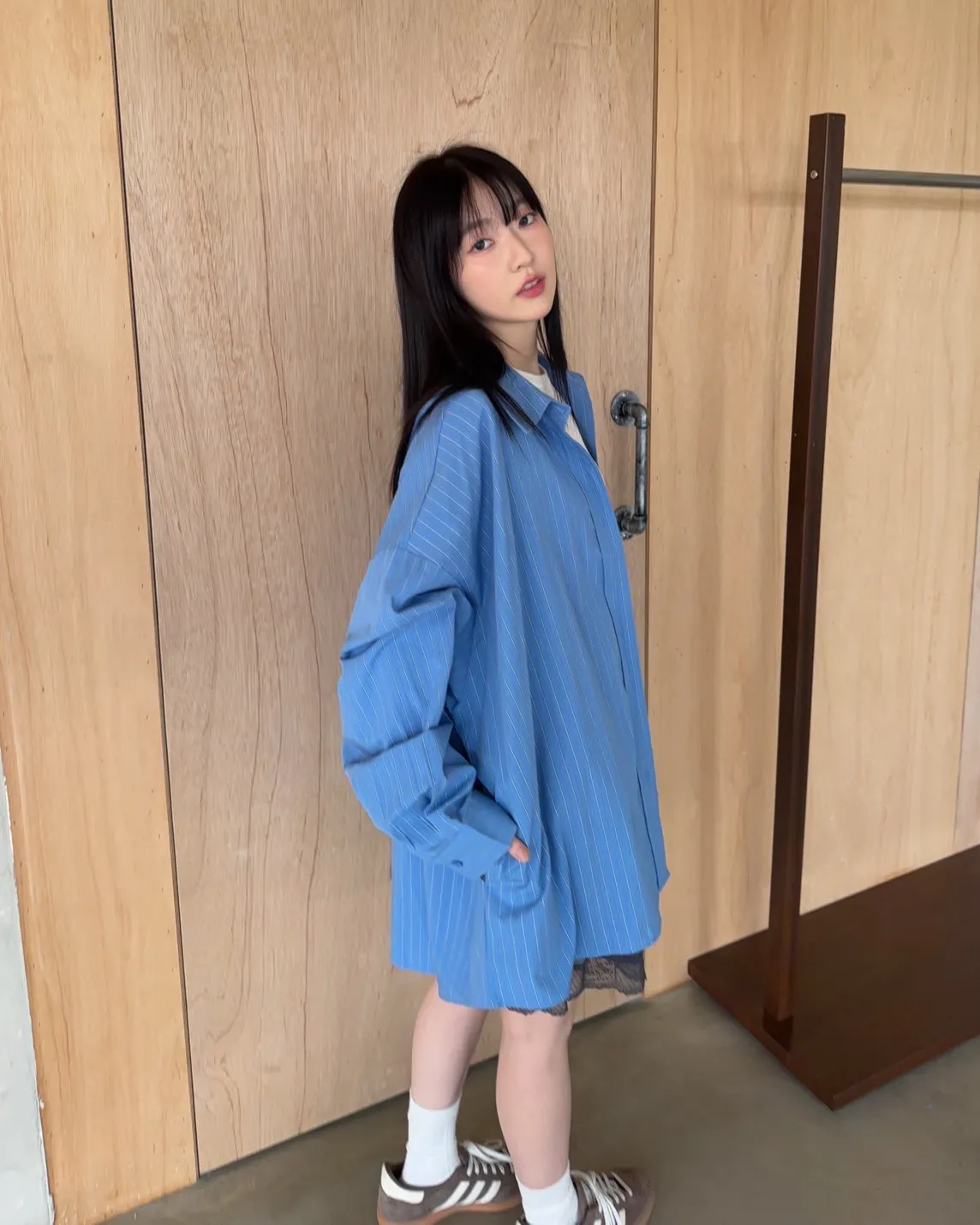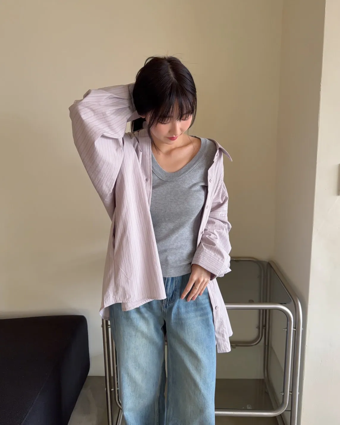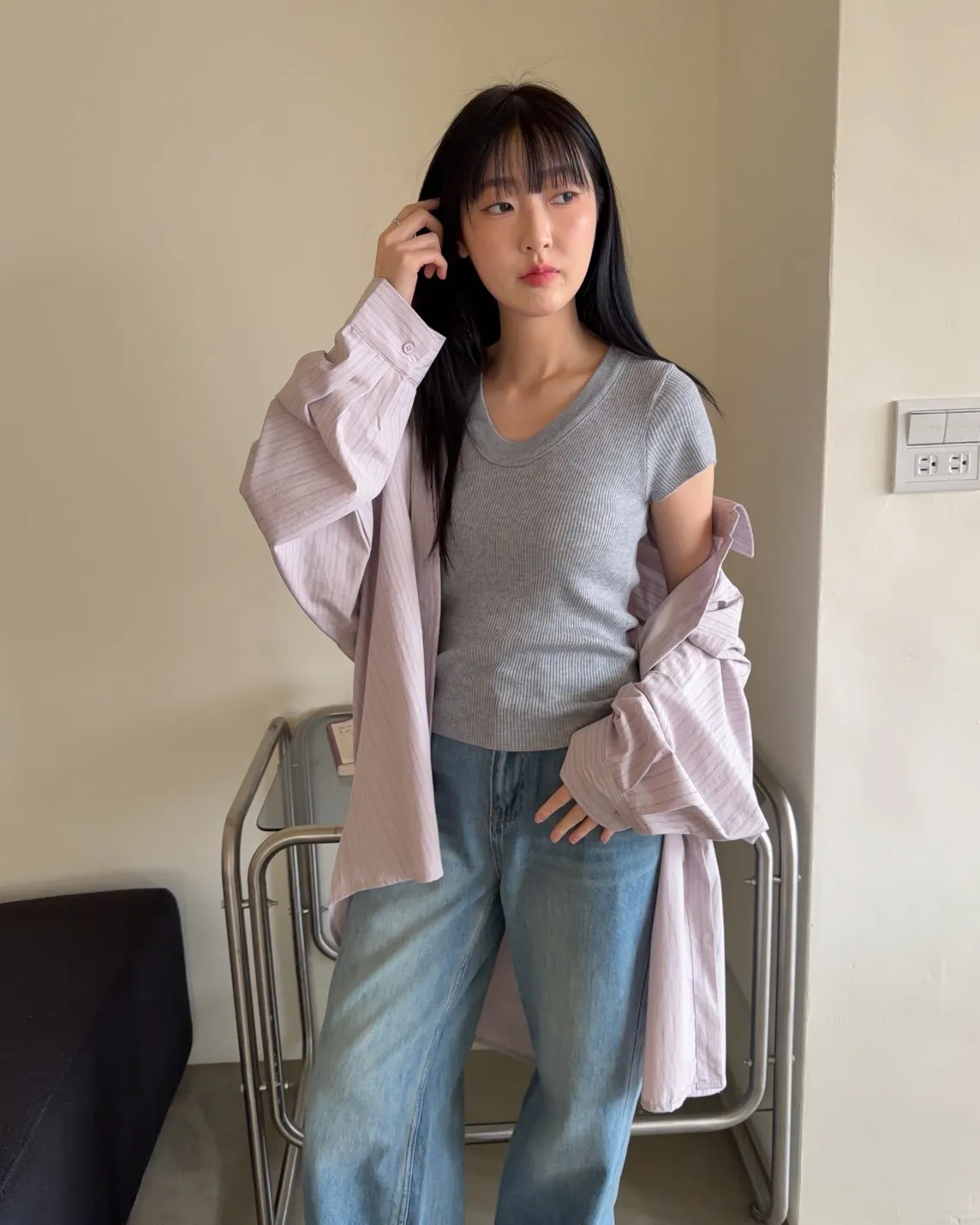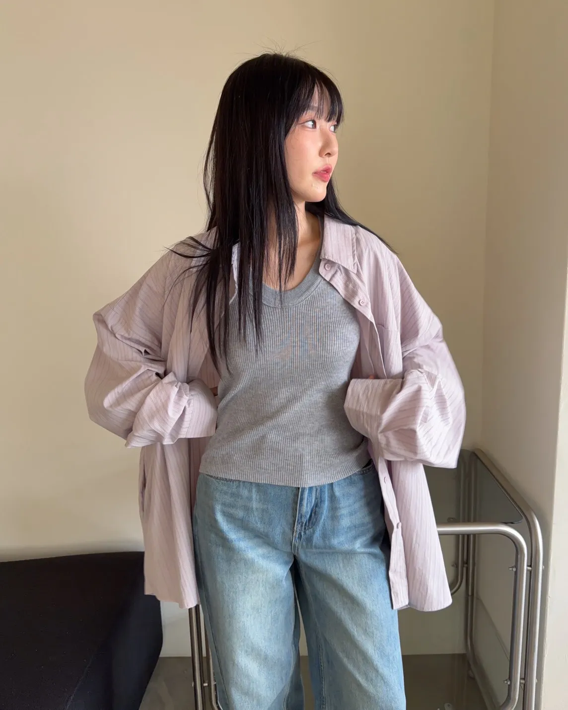 A0030簡約有口袋直條紋寬鬆襯衫(杏/粉紫/藍)
