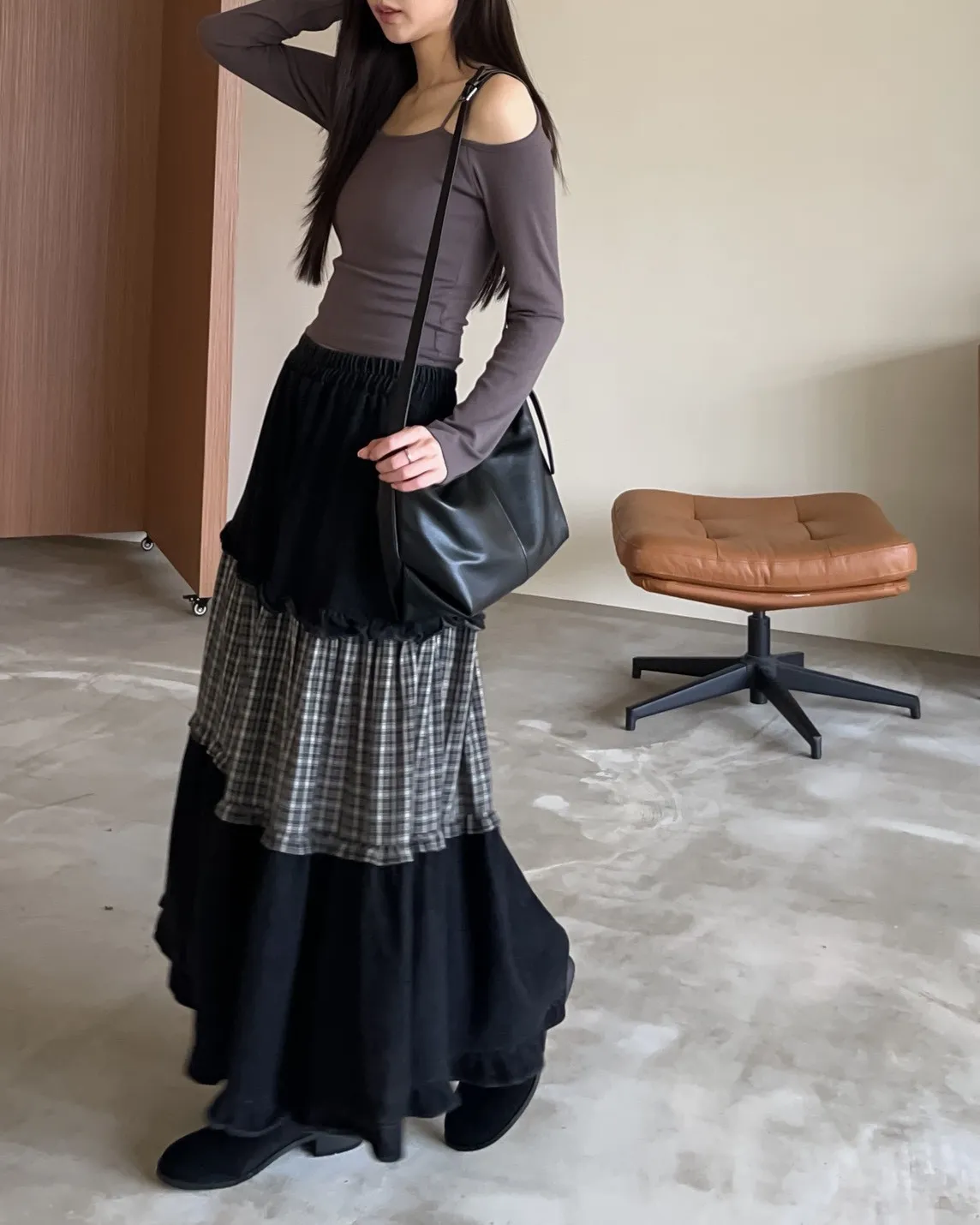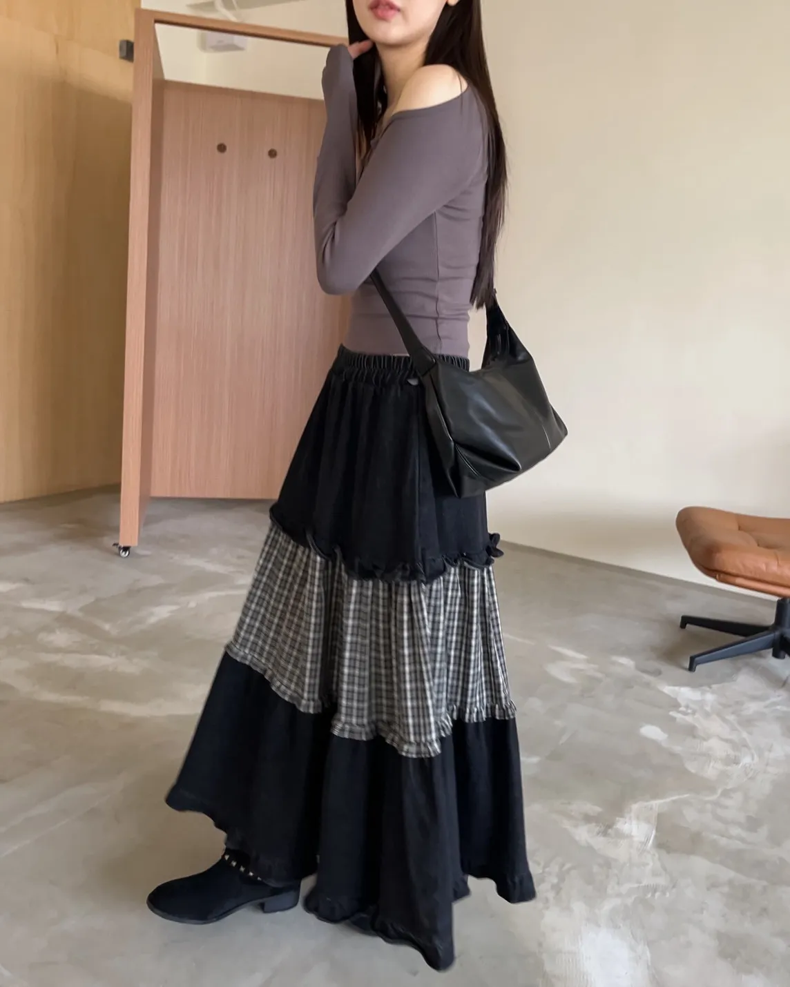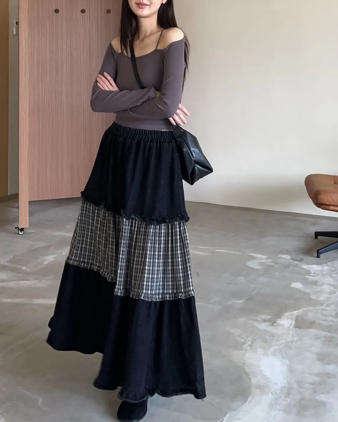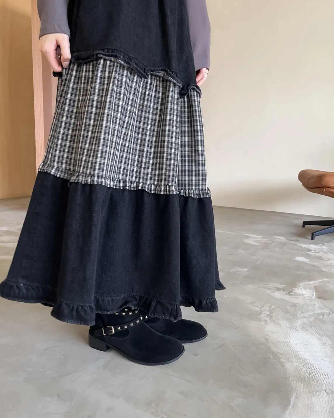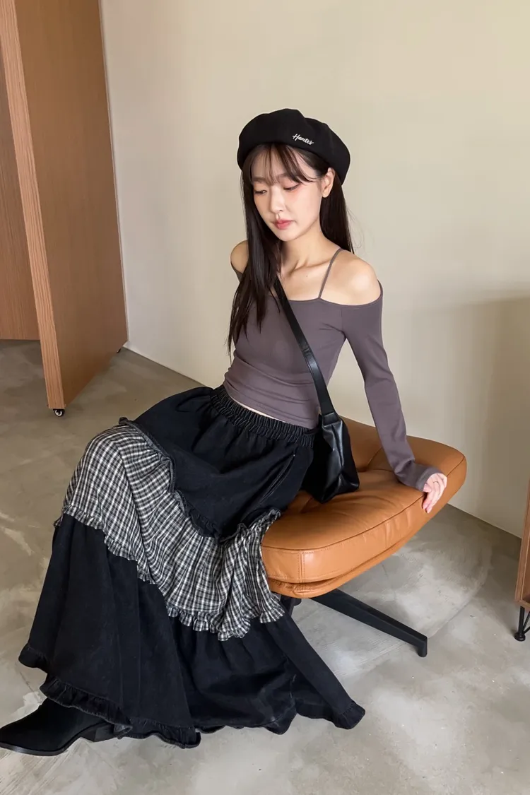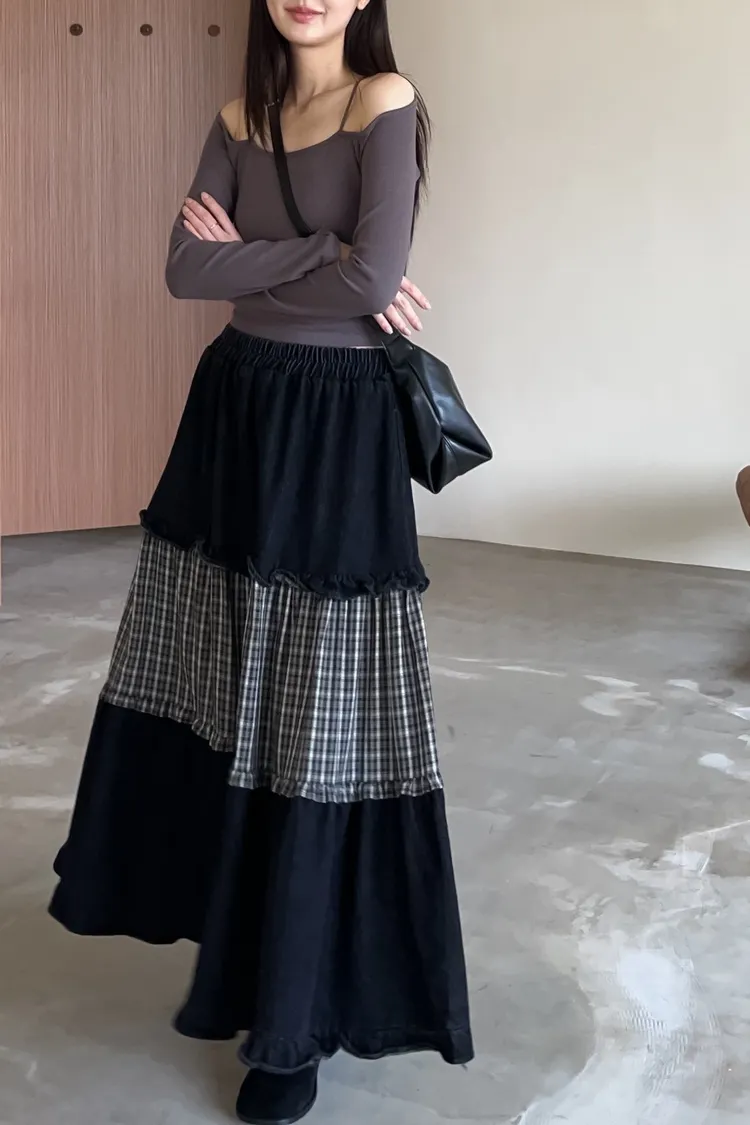W0020愛麗絲格紋拼接荷葉邊長裙