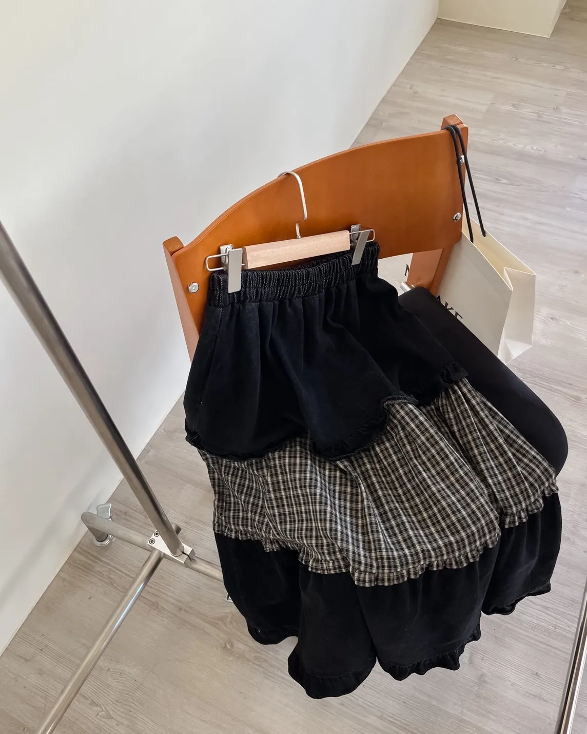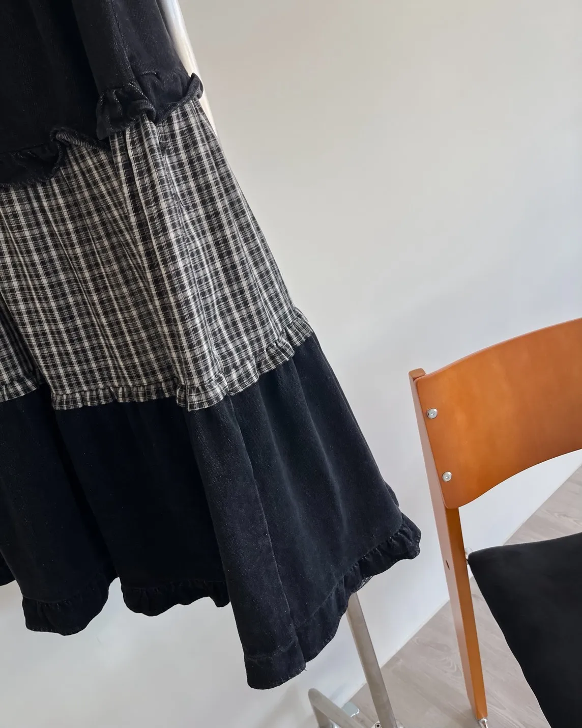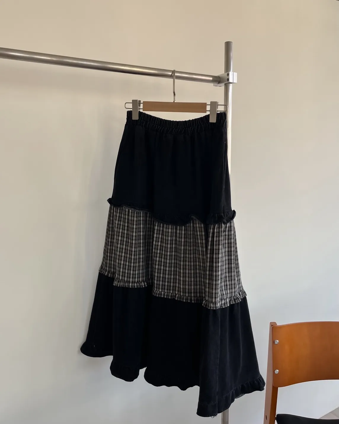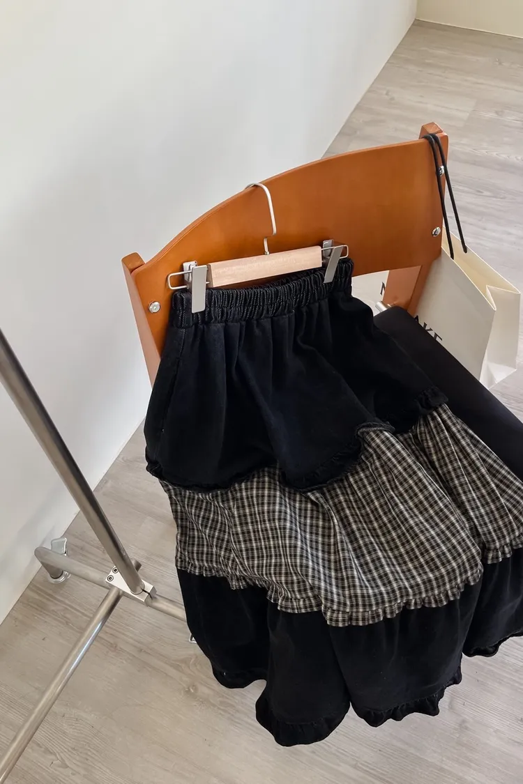 全鬆緊 建議尺寸S-大L 兩側口袋 牛仔布+格紋拼接 下擺荷葉邊 寬鬆傘擺 無內裡