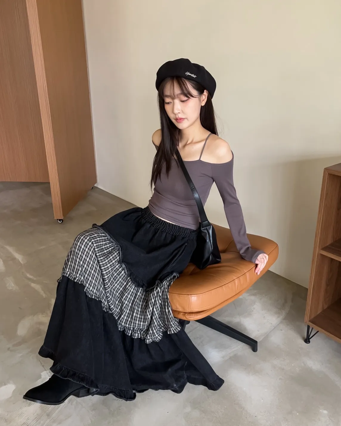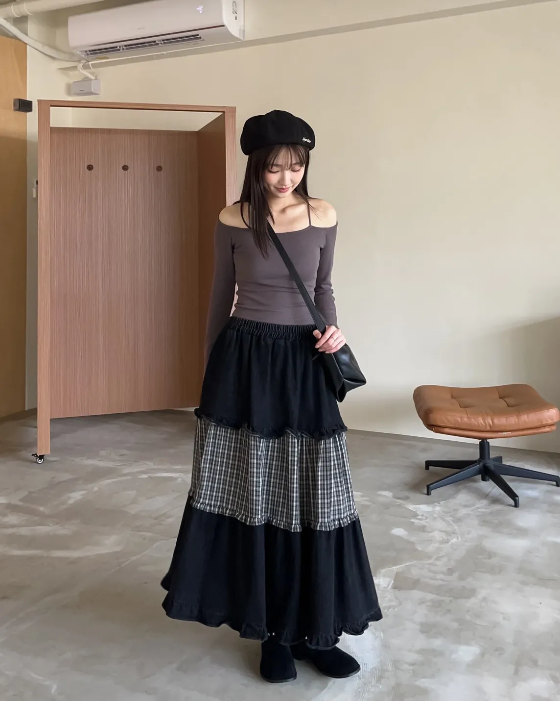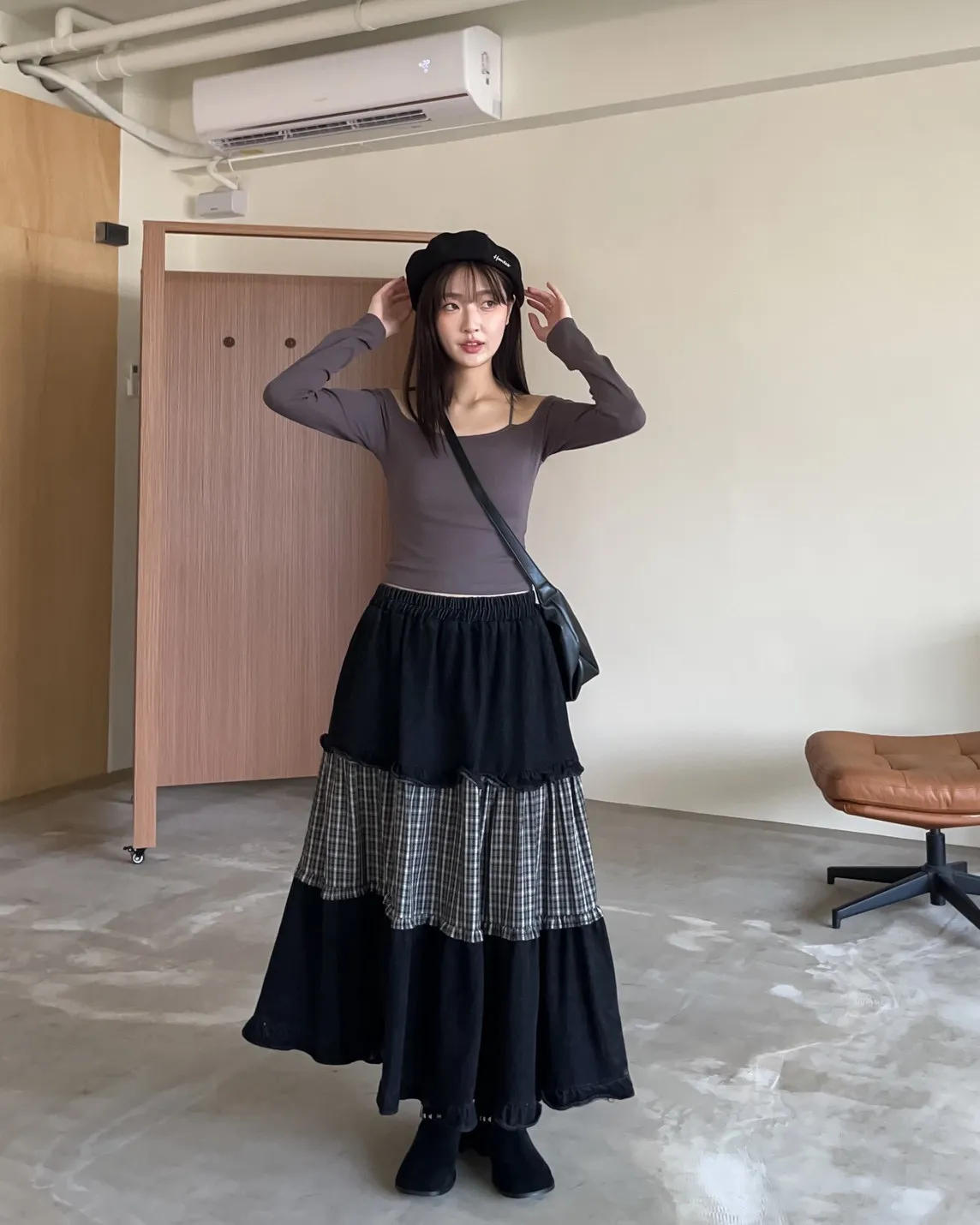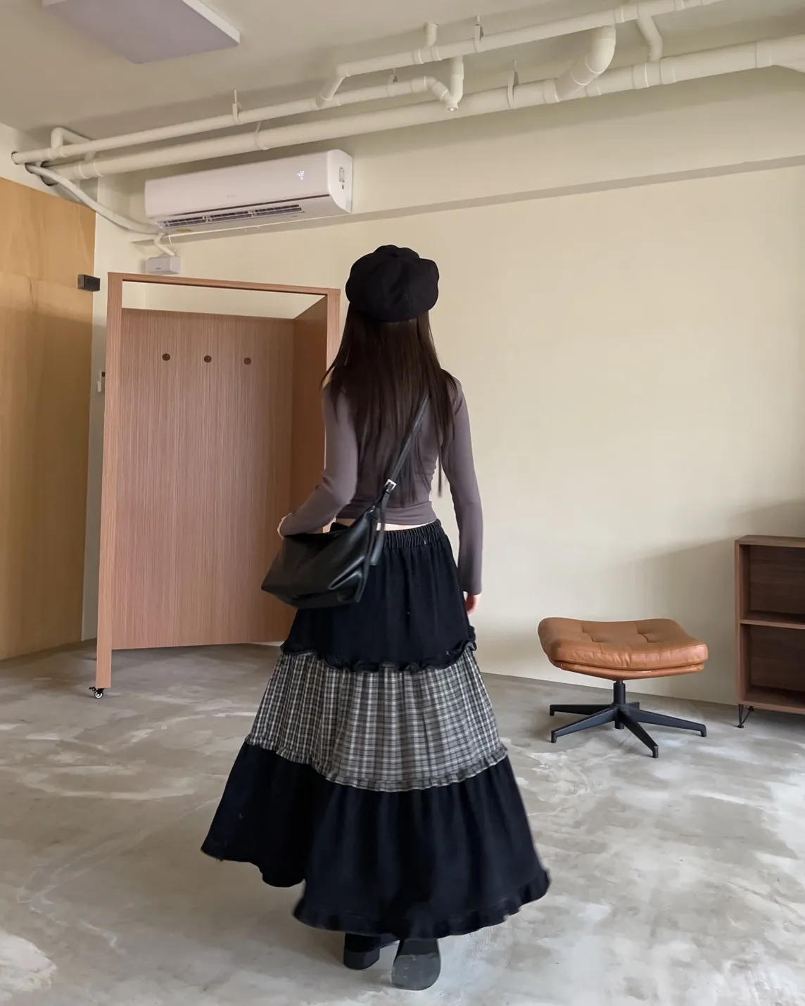 全鬆緊 建議尺寸S-大L 兩側口袋 牛仔布+格紋拼接 下擺荷葉邊 寬鬆傘擺 無內裡