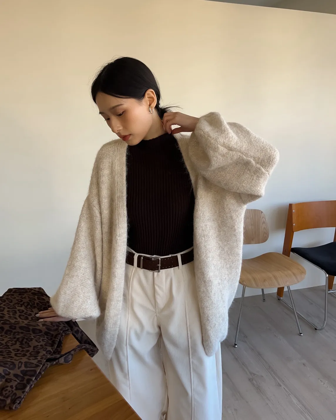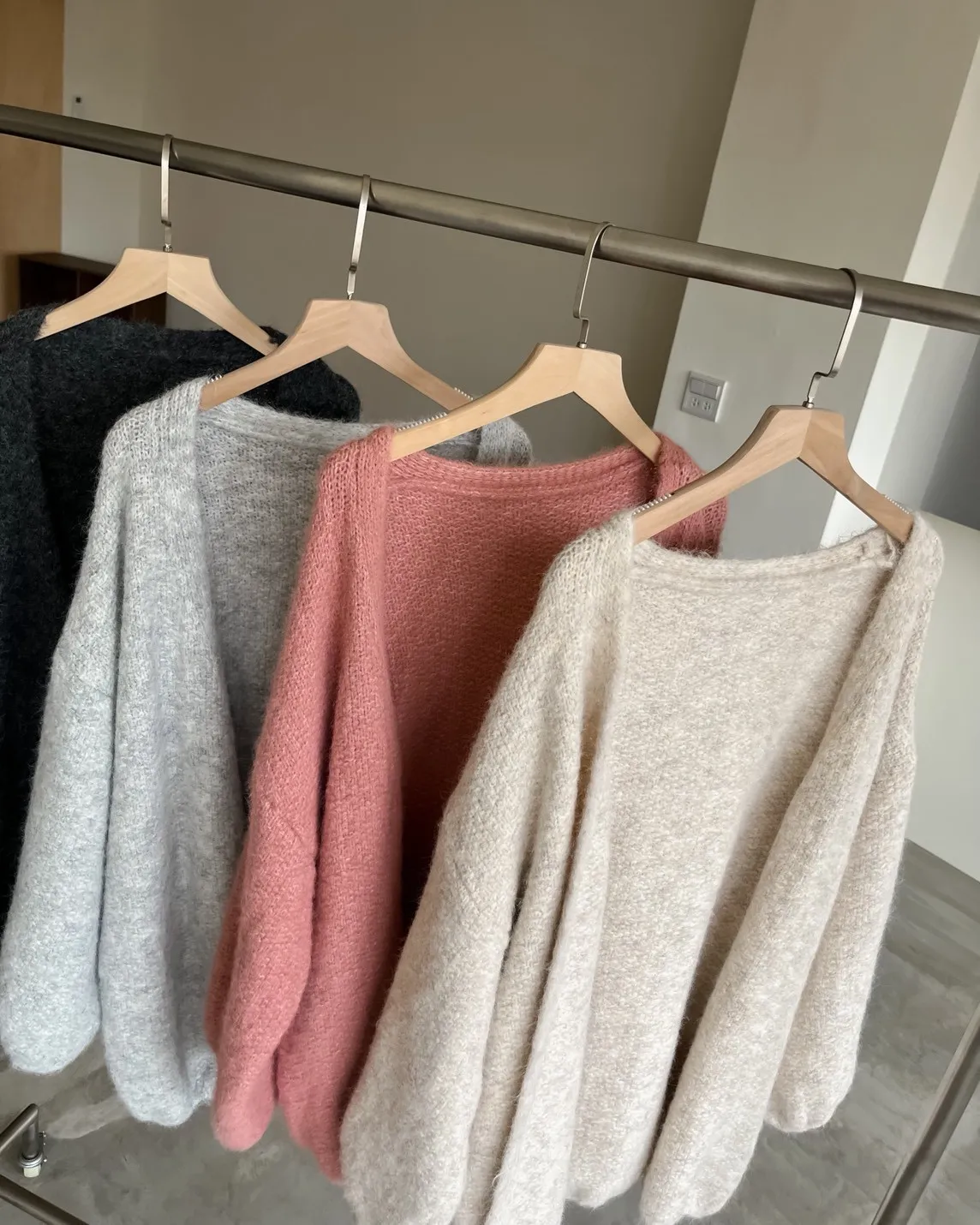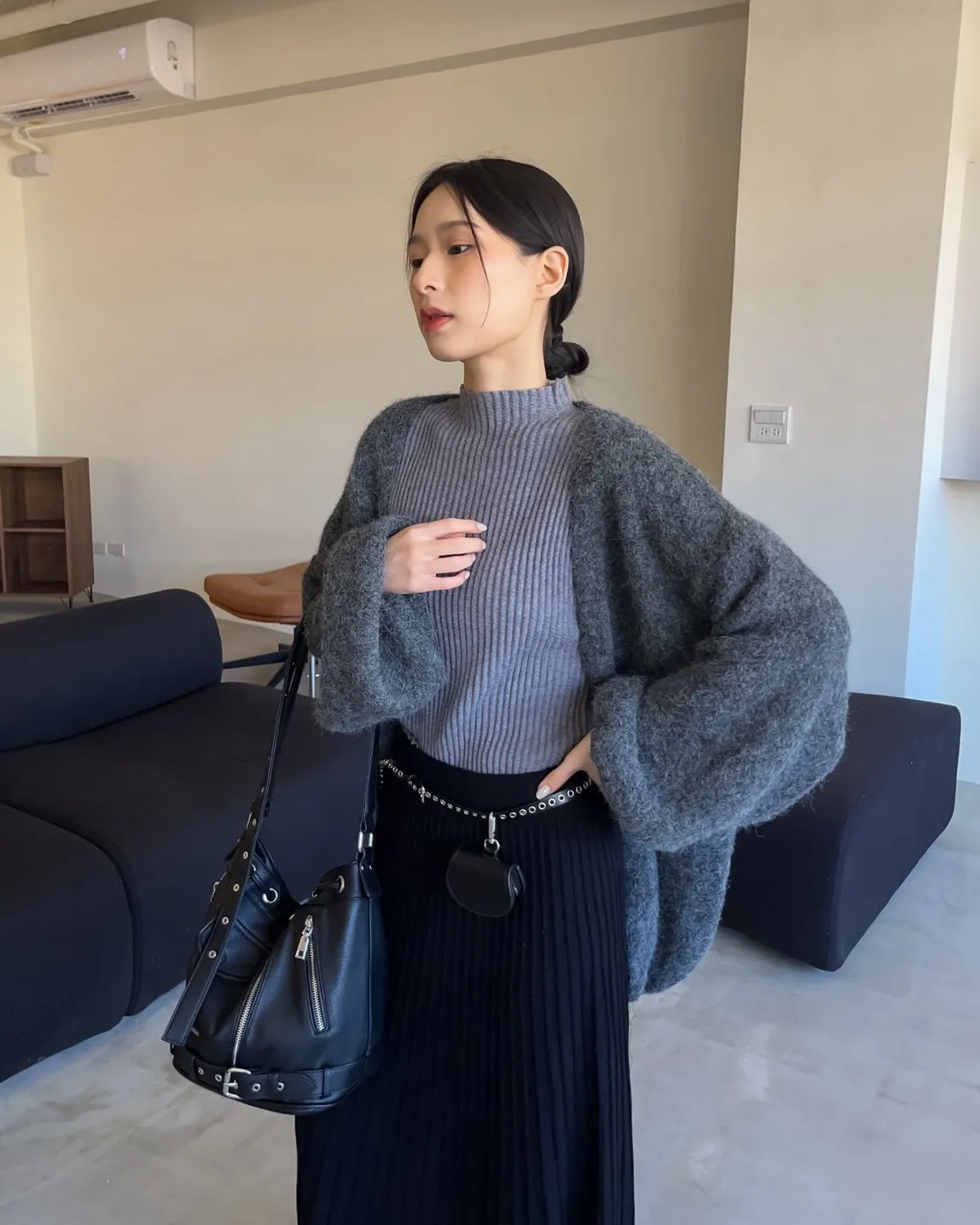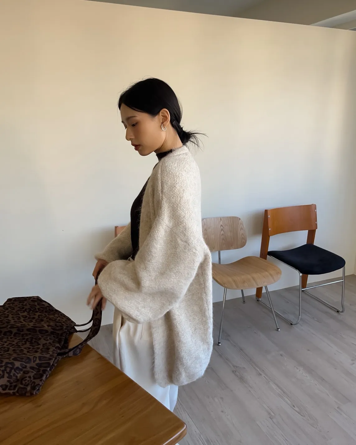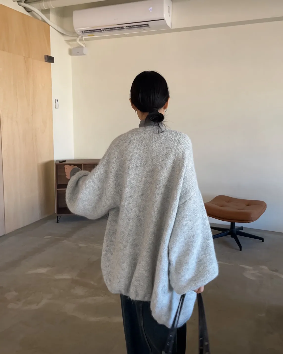 開襟 混毛針織 袖口/下擺可愛內縮 寬鬆落肩