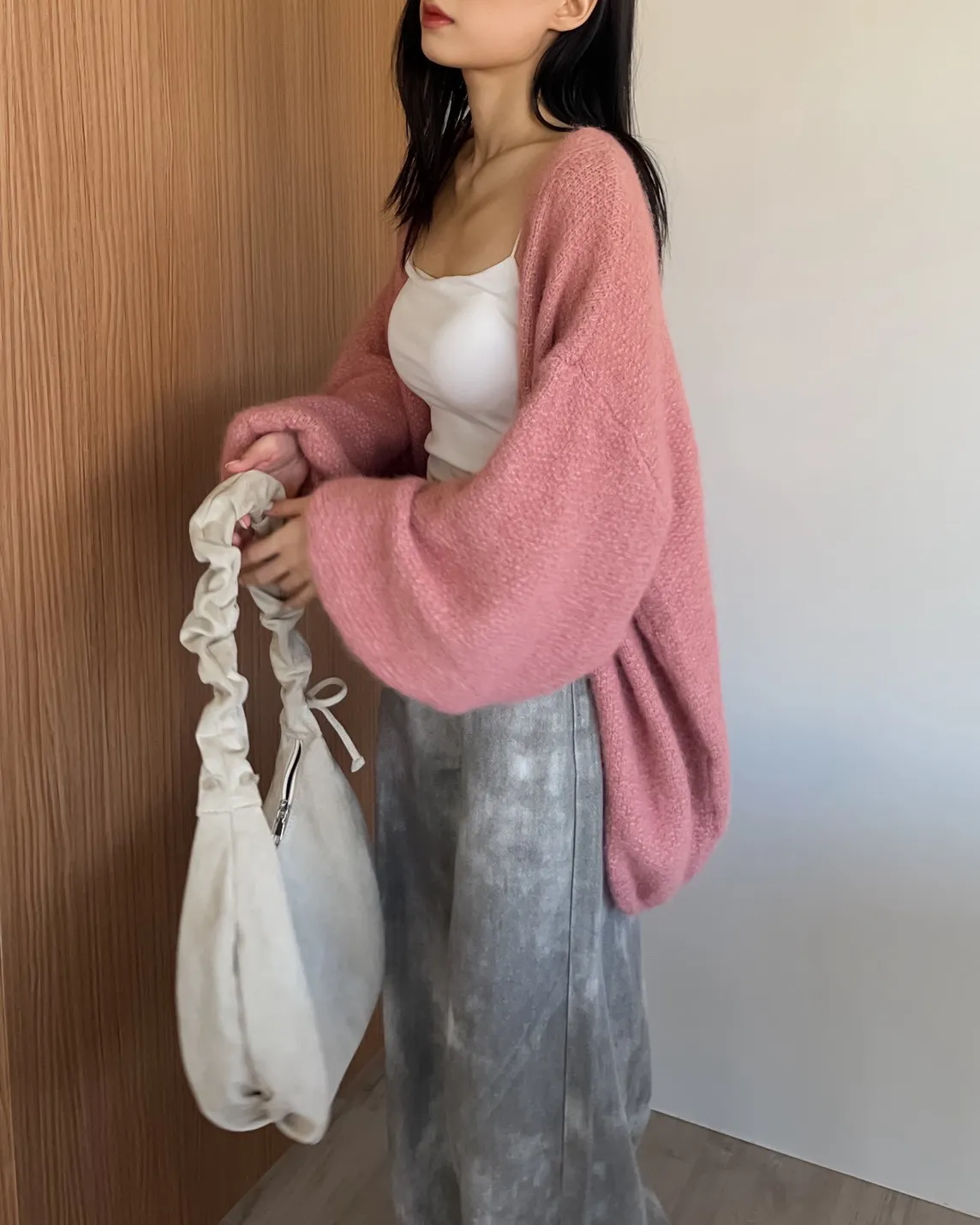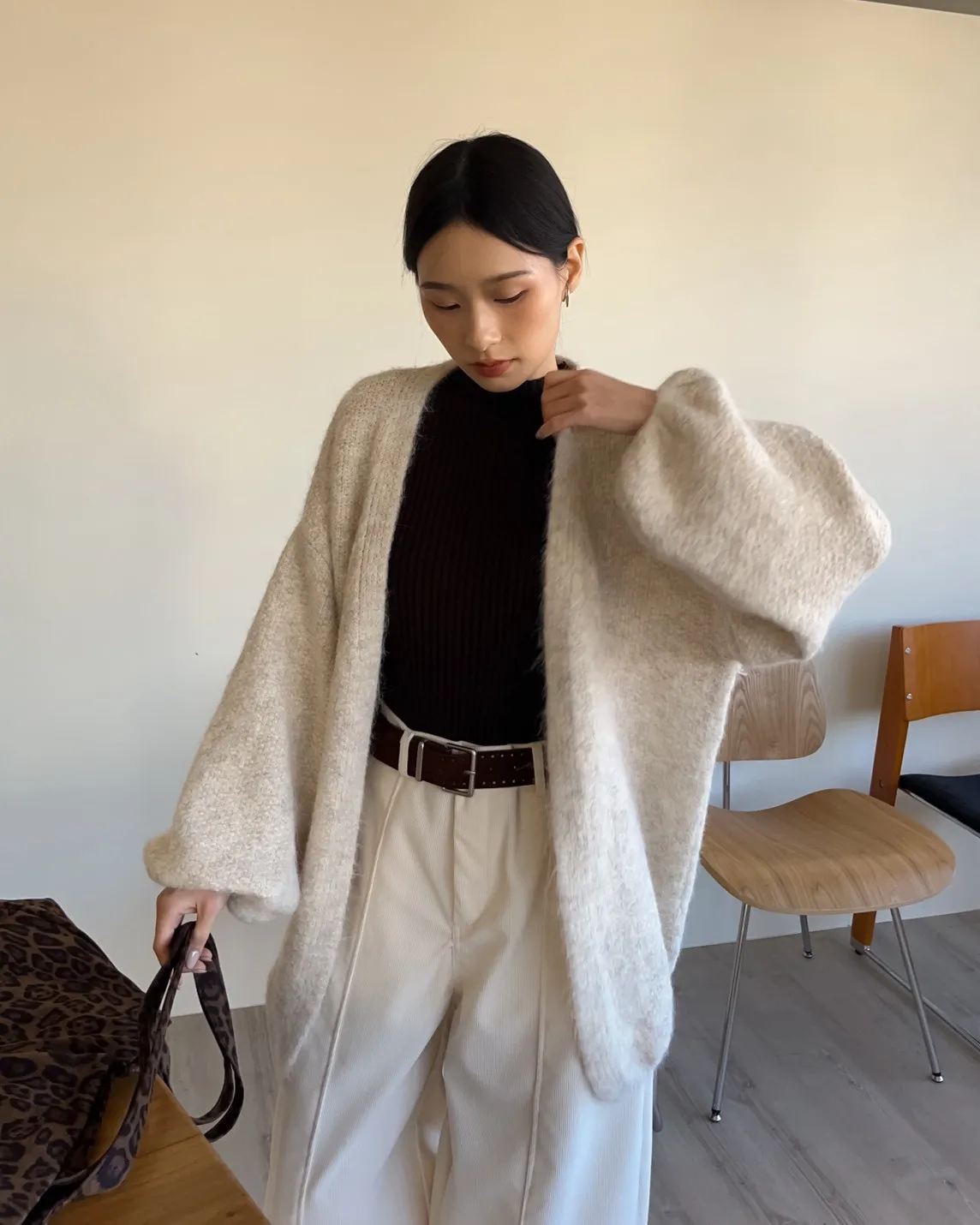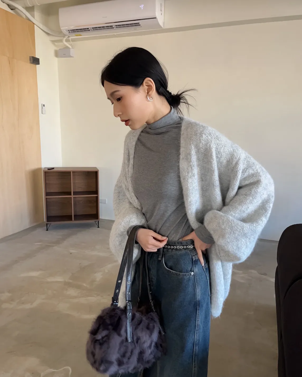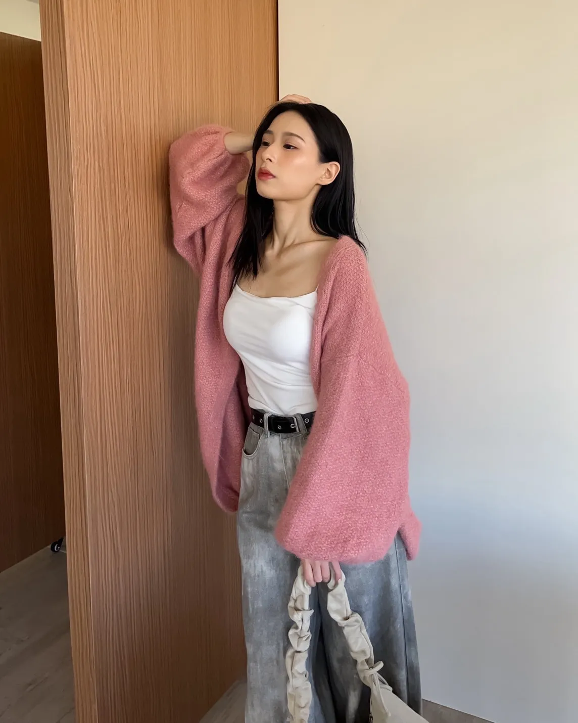 開襟 混毛針織 袖口/下擺可愛內縮 寬鬆落肩