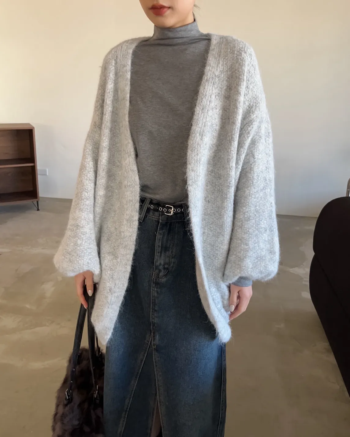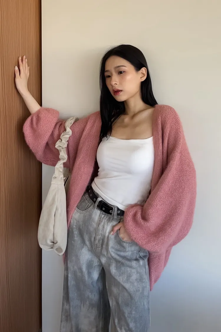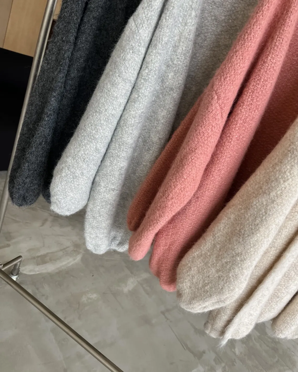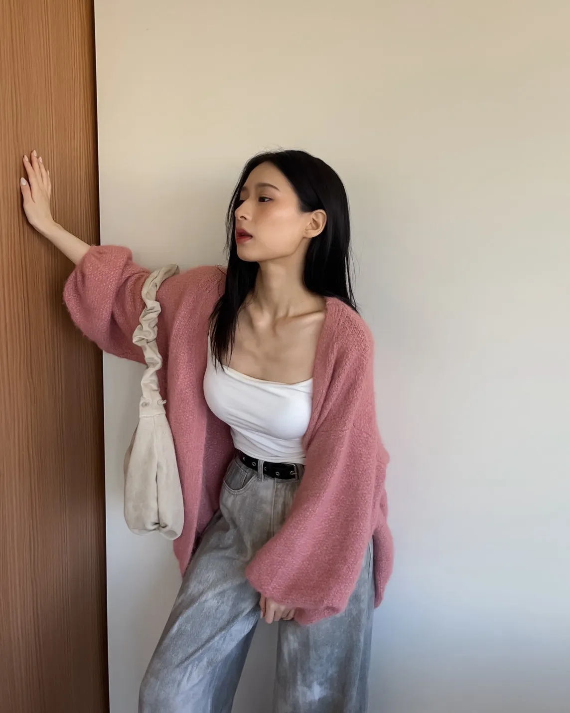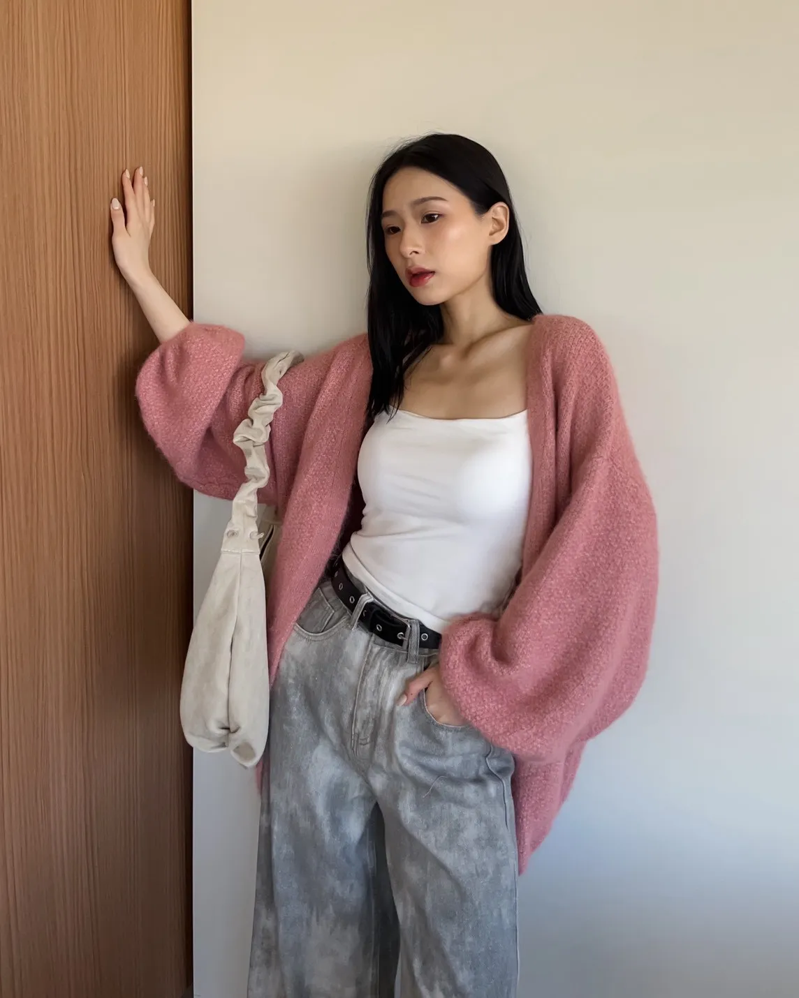 開襟 混毛針織 袖口/下擺可愛內縮 寬鬆落肩