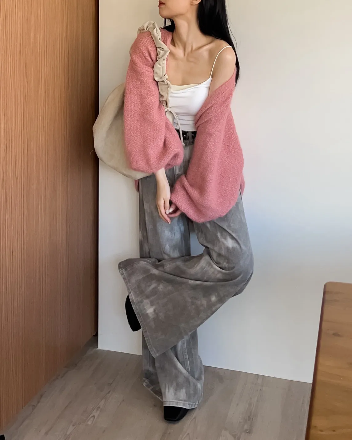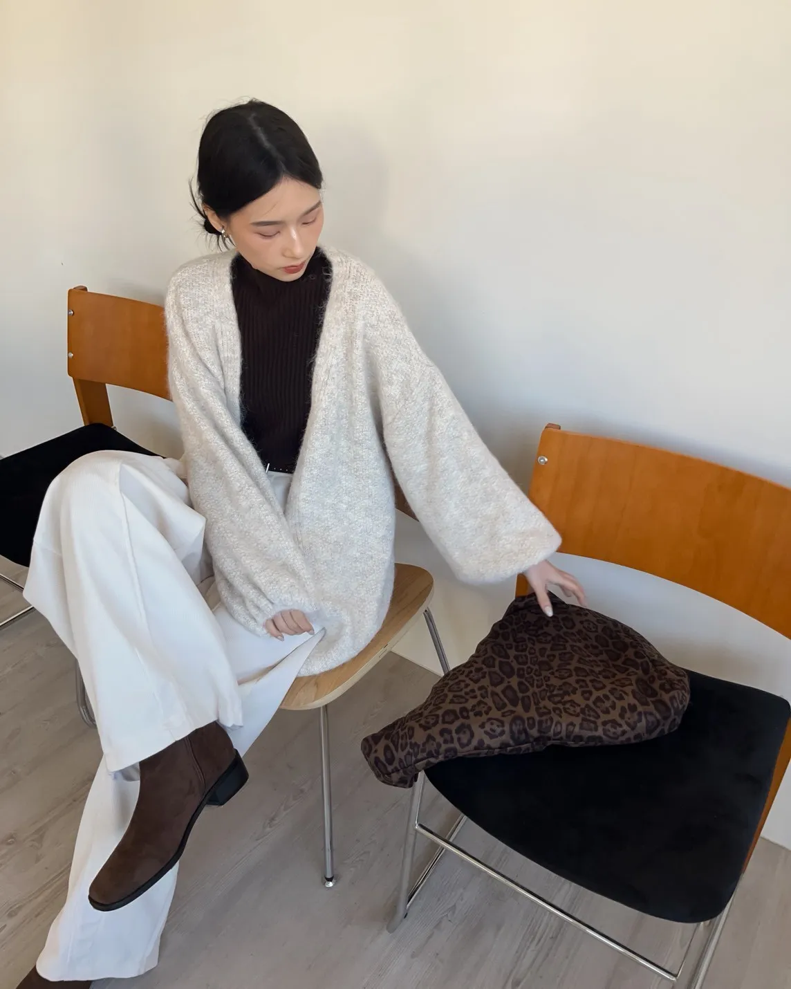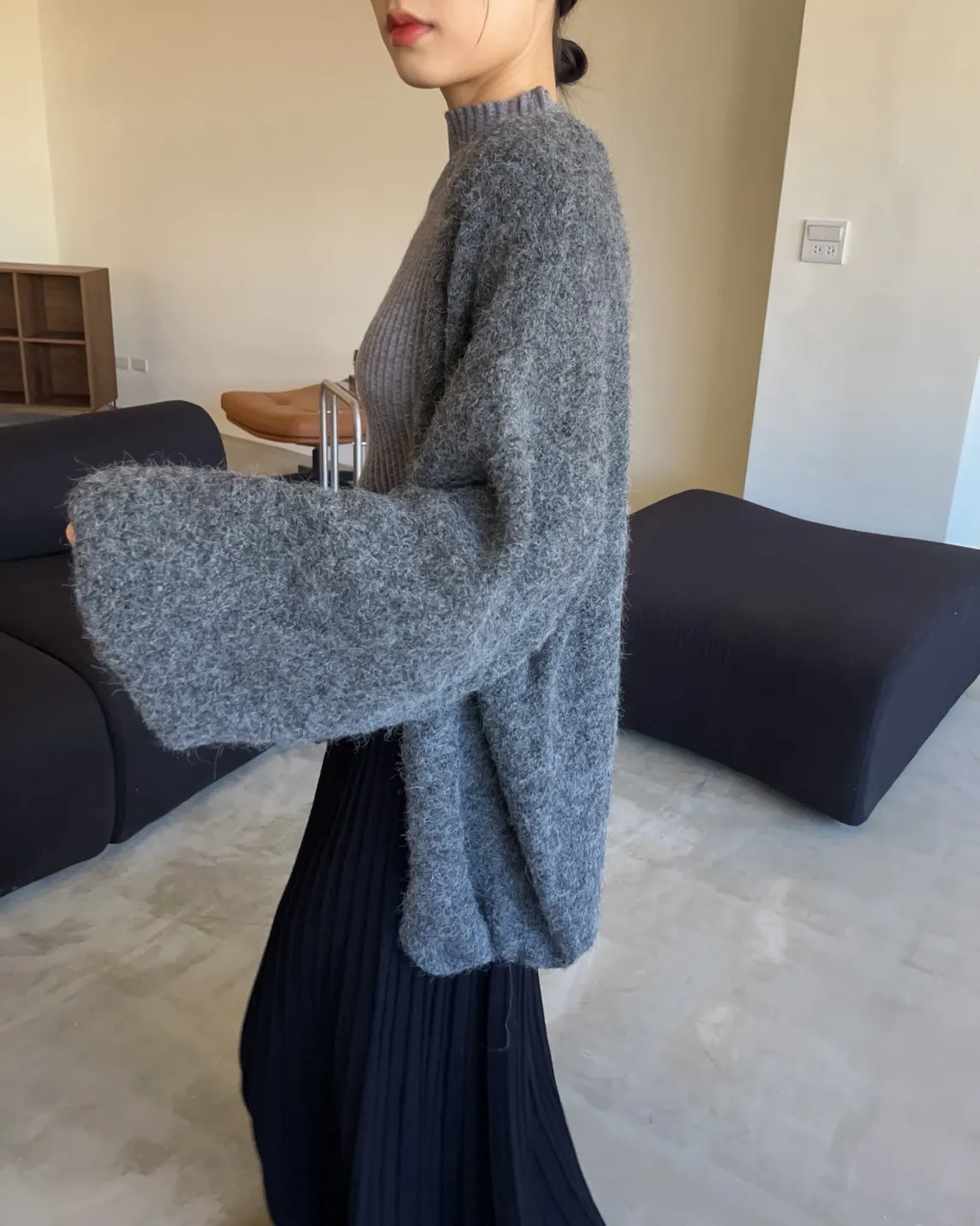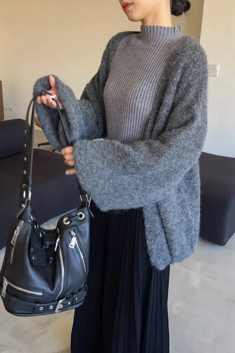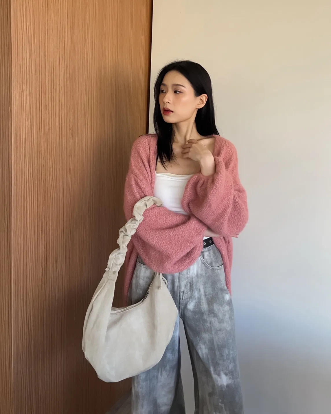 開襟 混毛針織 袖口/下擺可愛內縮 寬鬆落肩