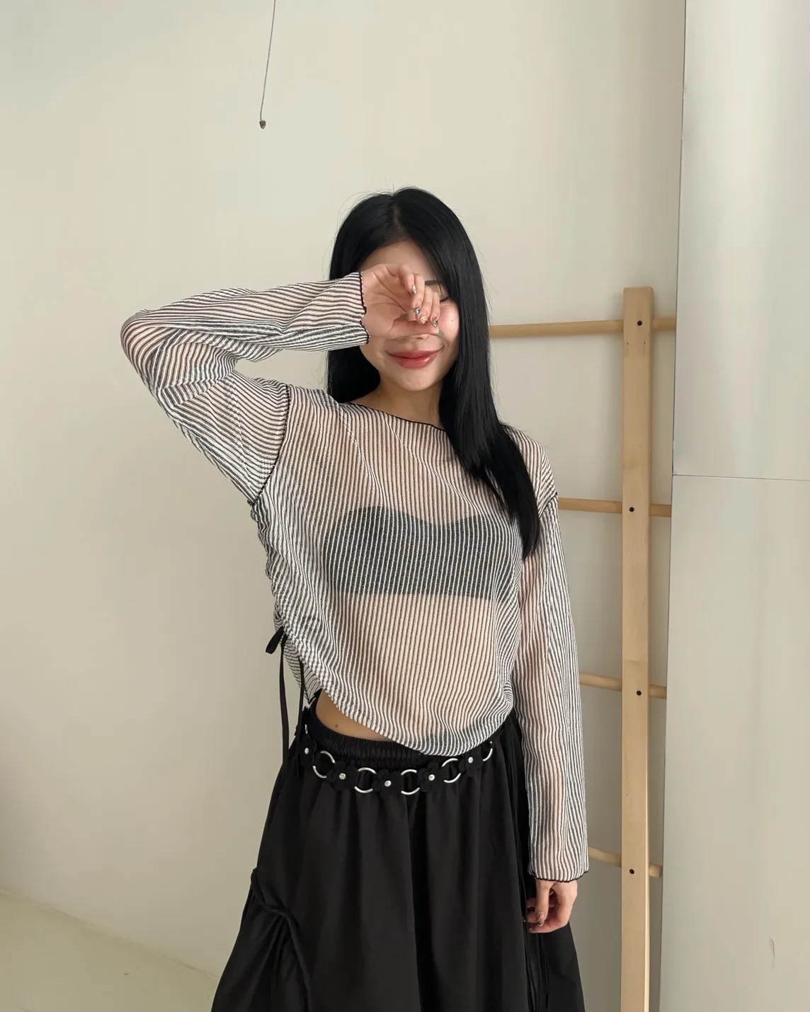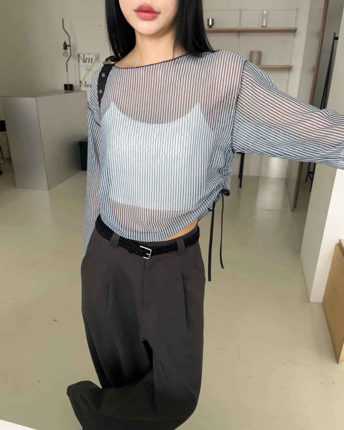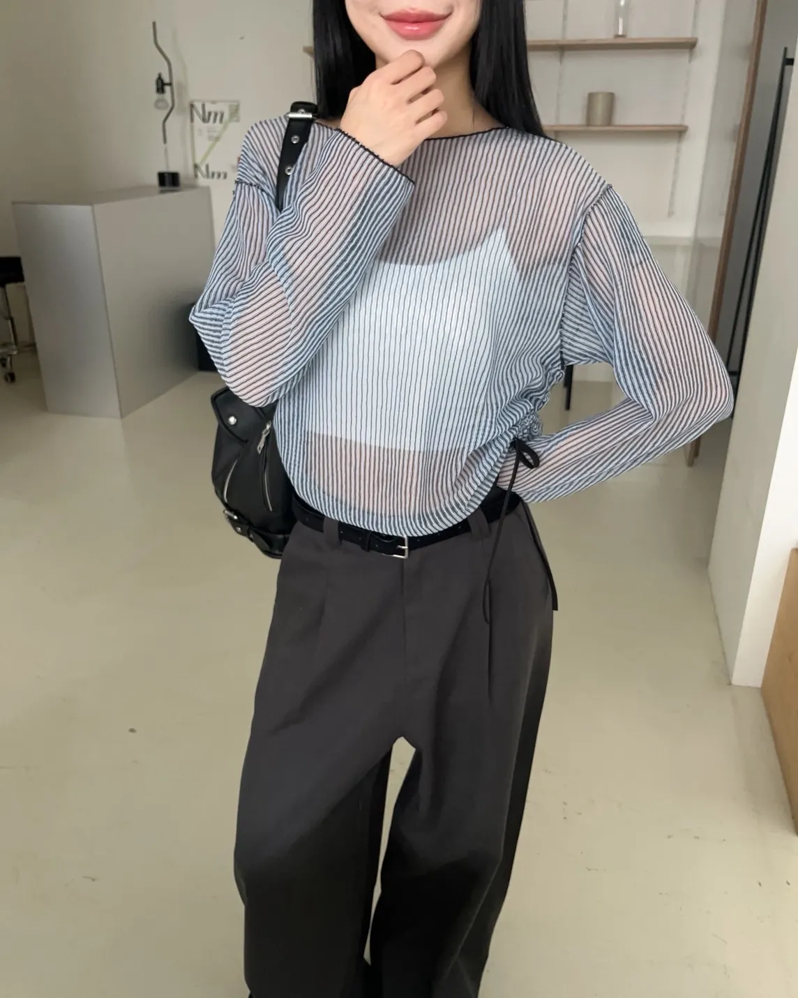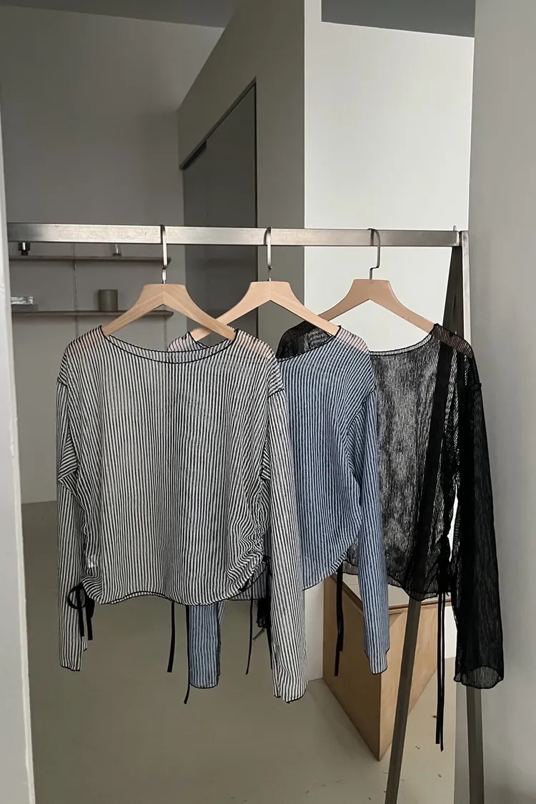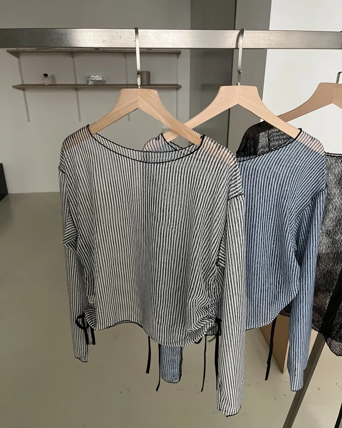 直條紋鏤空 船領小露鎖骨 兩側抽繩綁帶 寬版