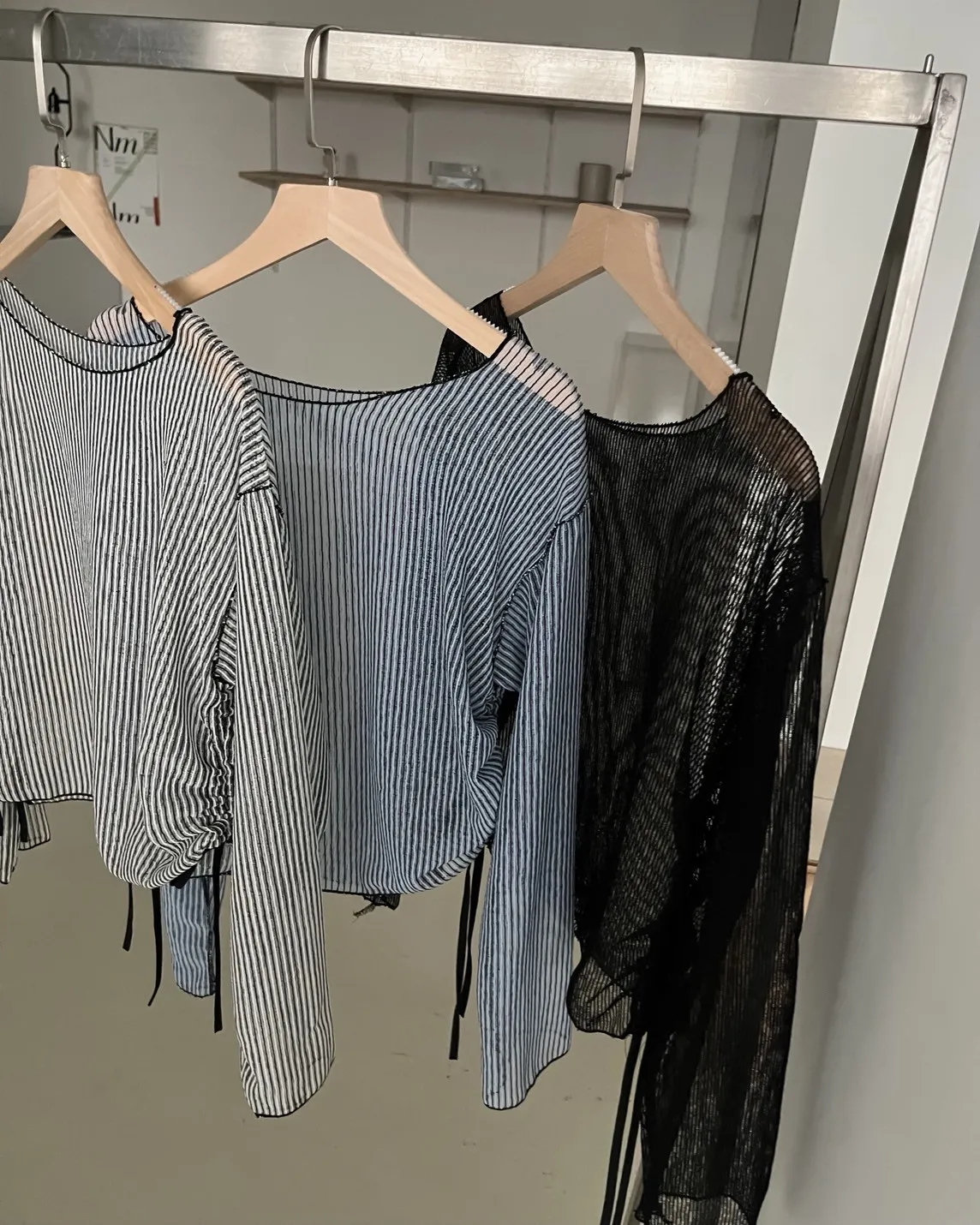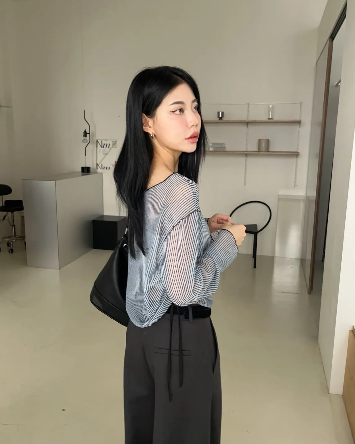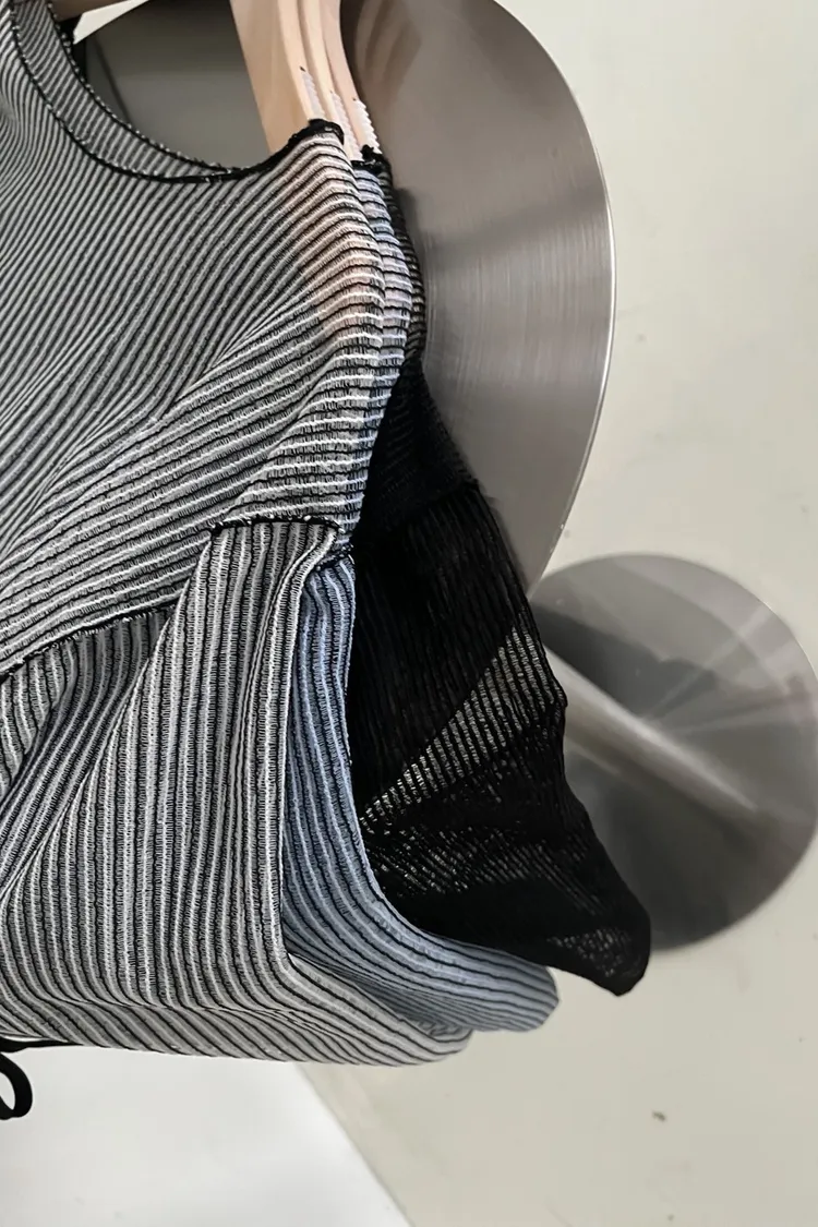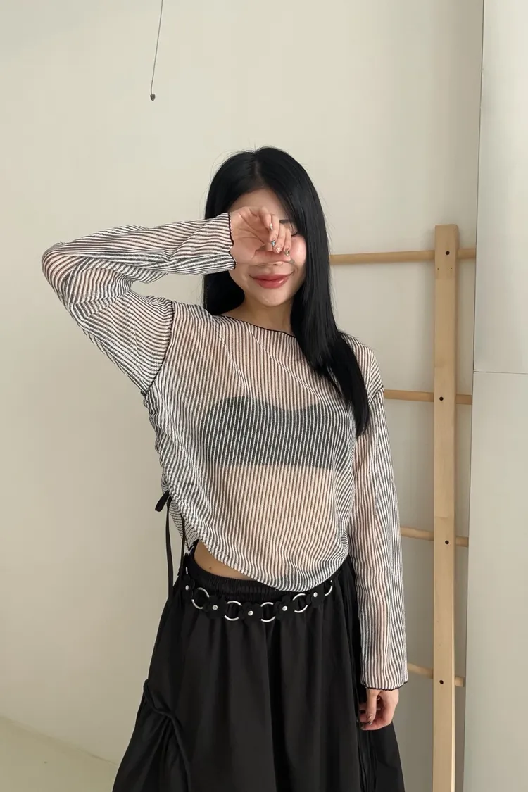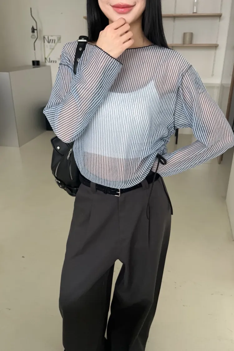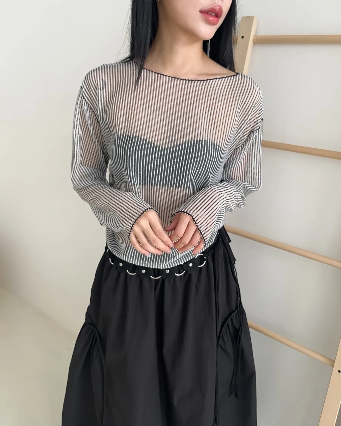 直條紋鏤空 船領小露鎖骨 兩側抽繩綁帶 寬版