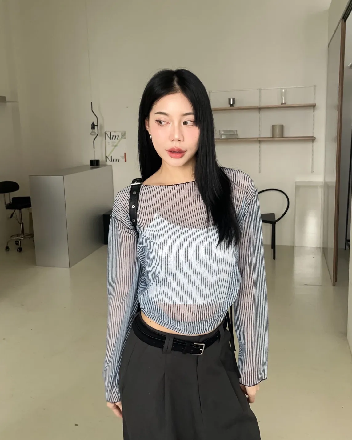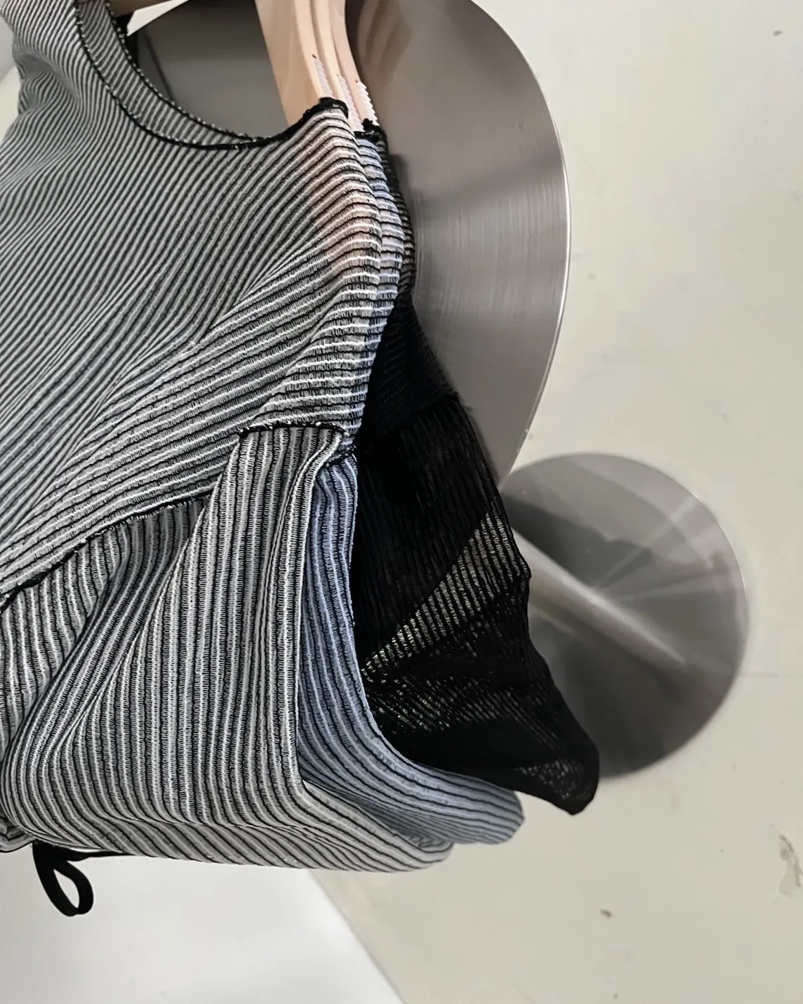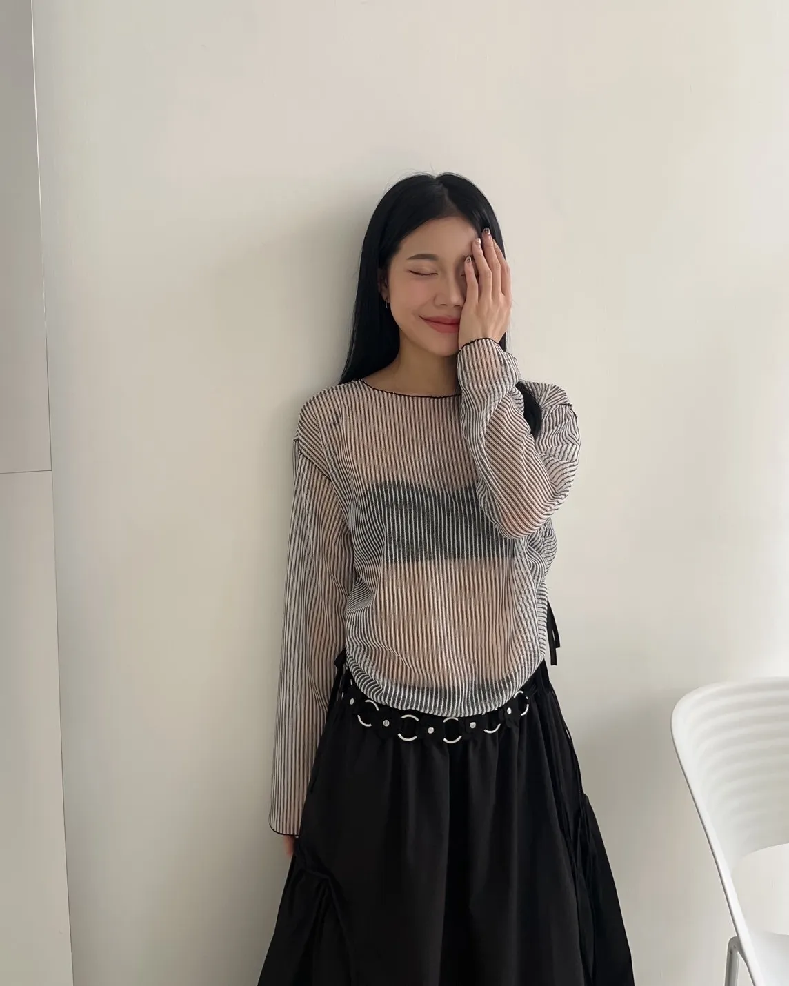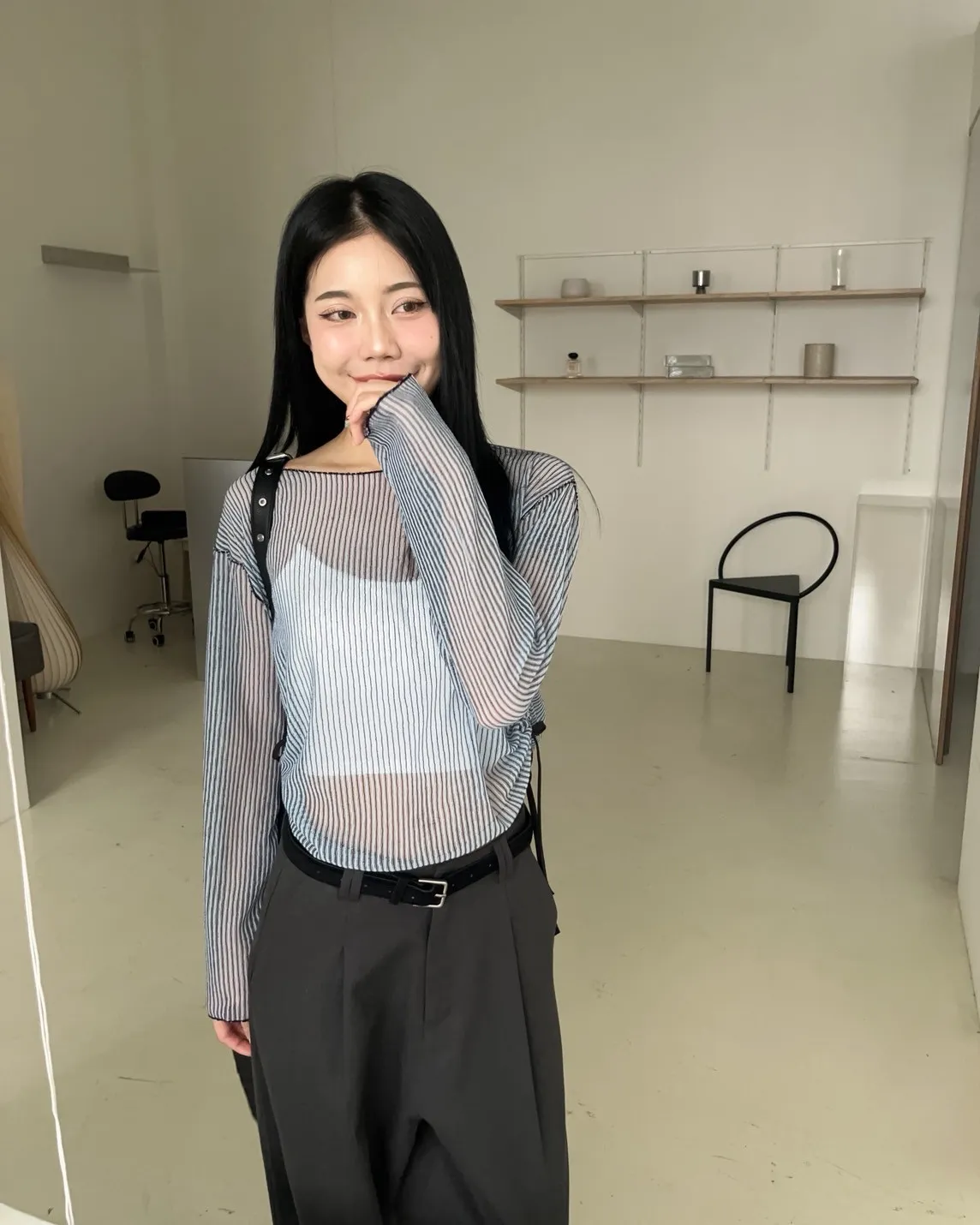 直條紋鏤空 船領小露鎖骨 兩側抽繩綁帶 寬版