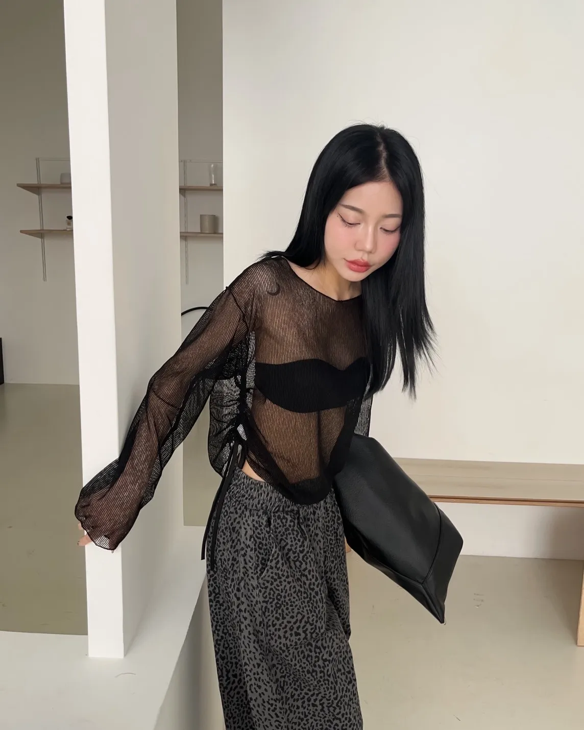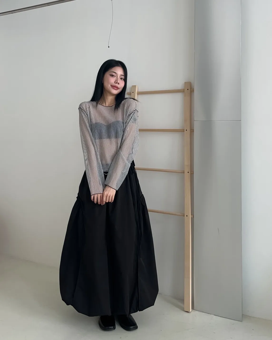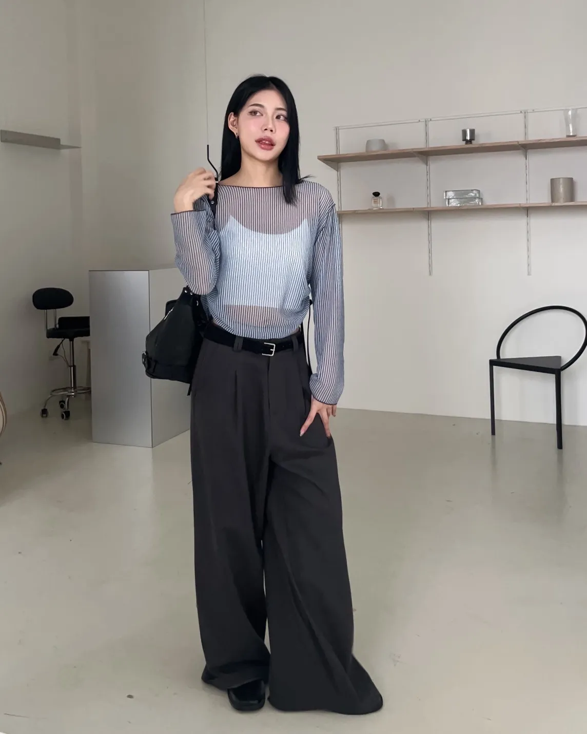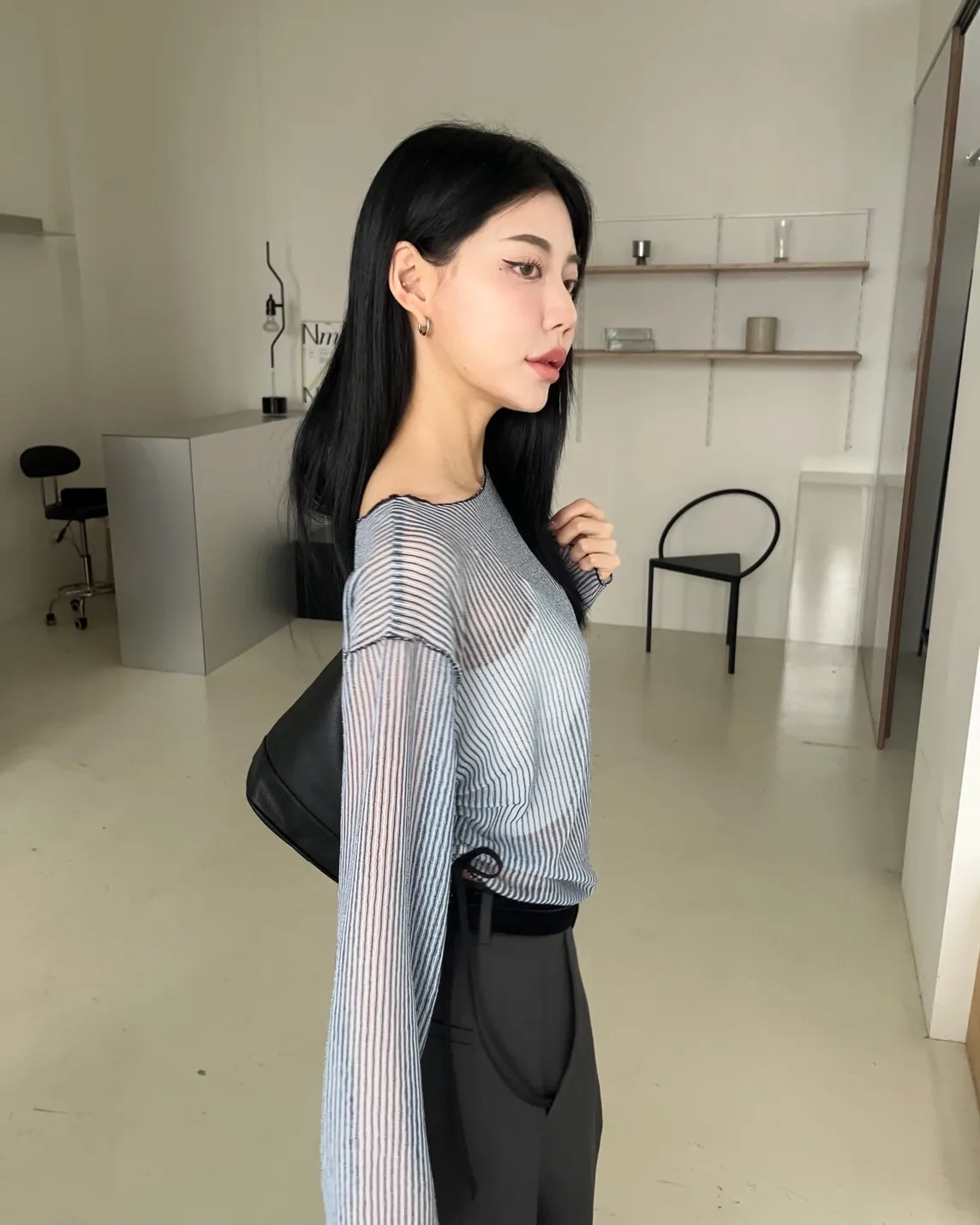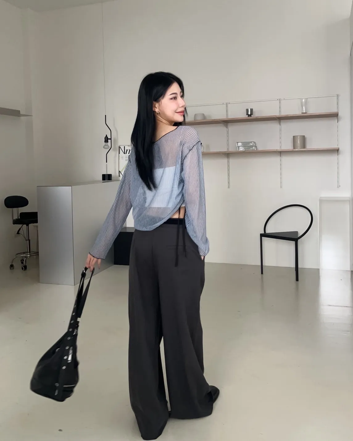直條紋鏤空 船領小露鎖骨 兩側抽繩綁帶 寬版