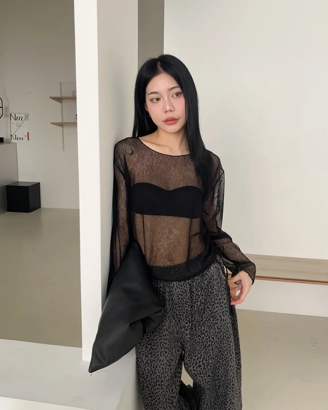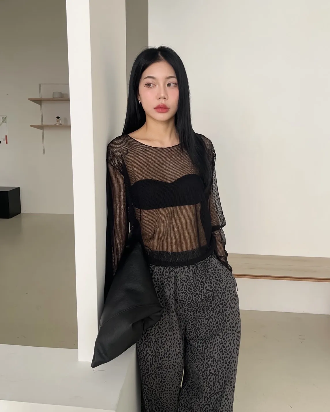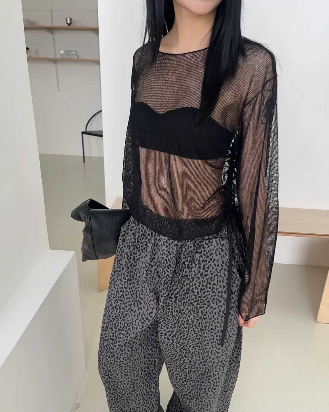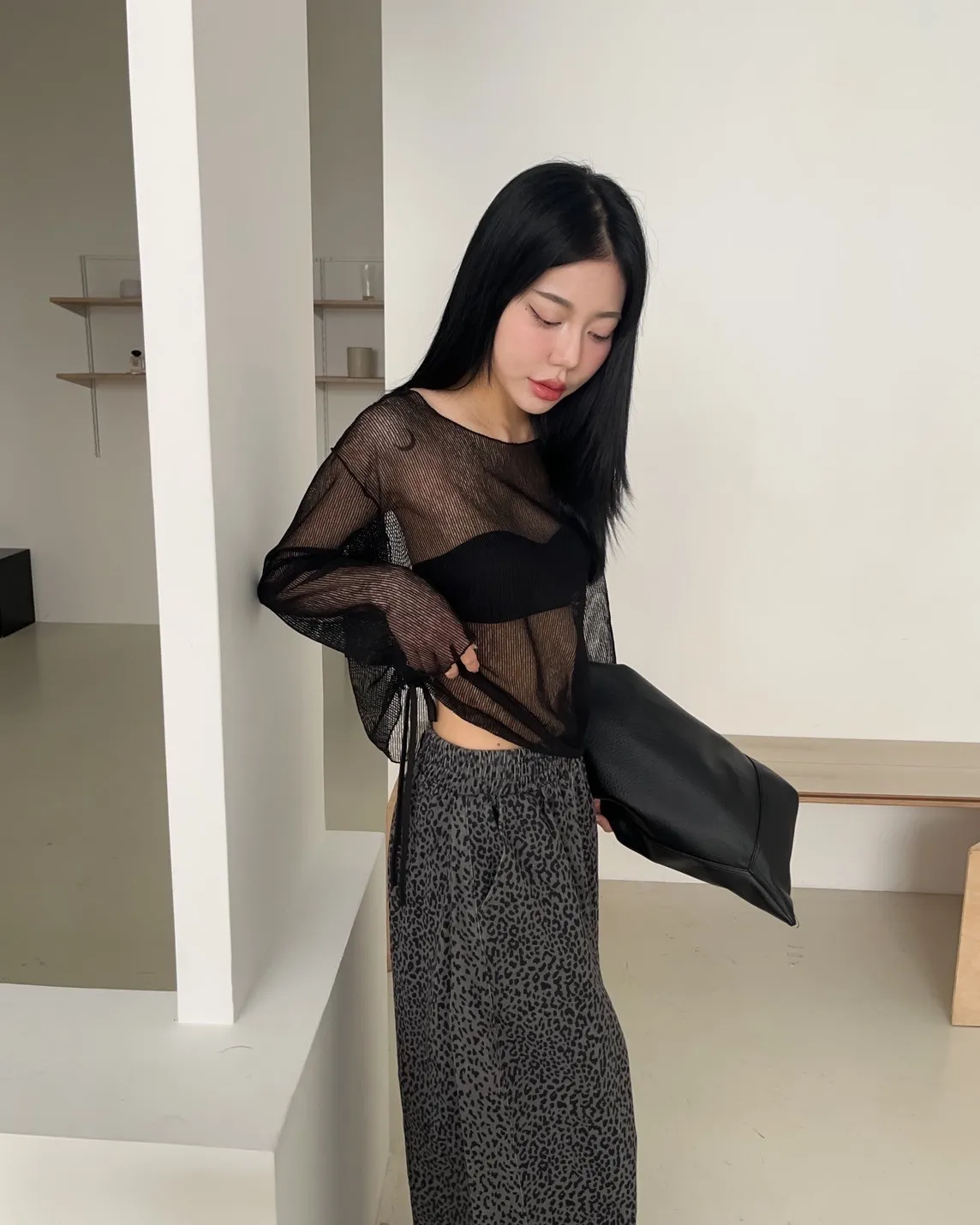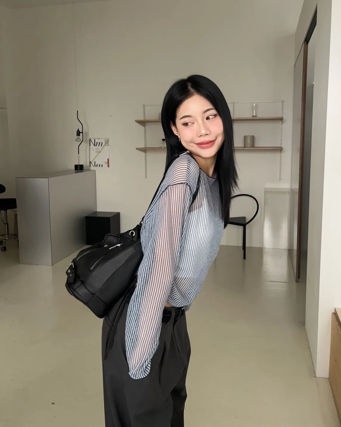 直條紋鏤空 船領小露鎖骨 兩側抽繩綁帶 寬版