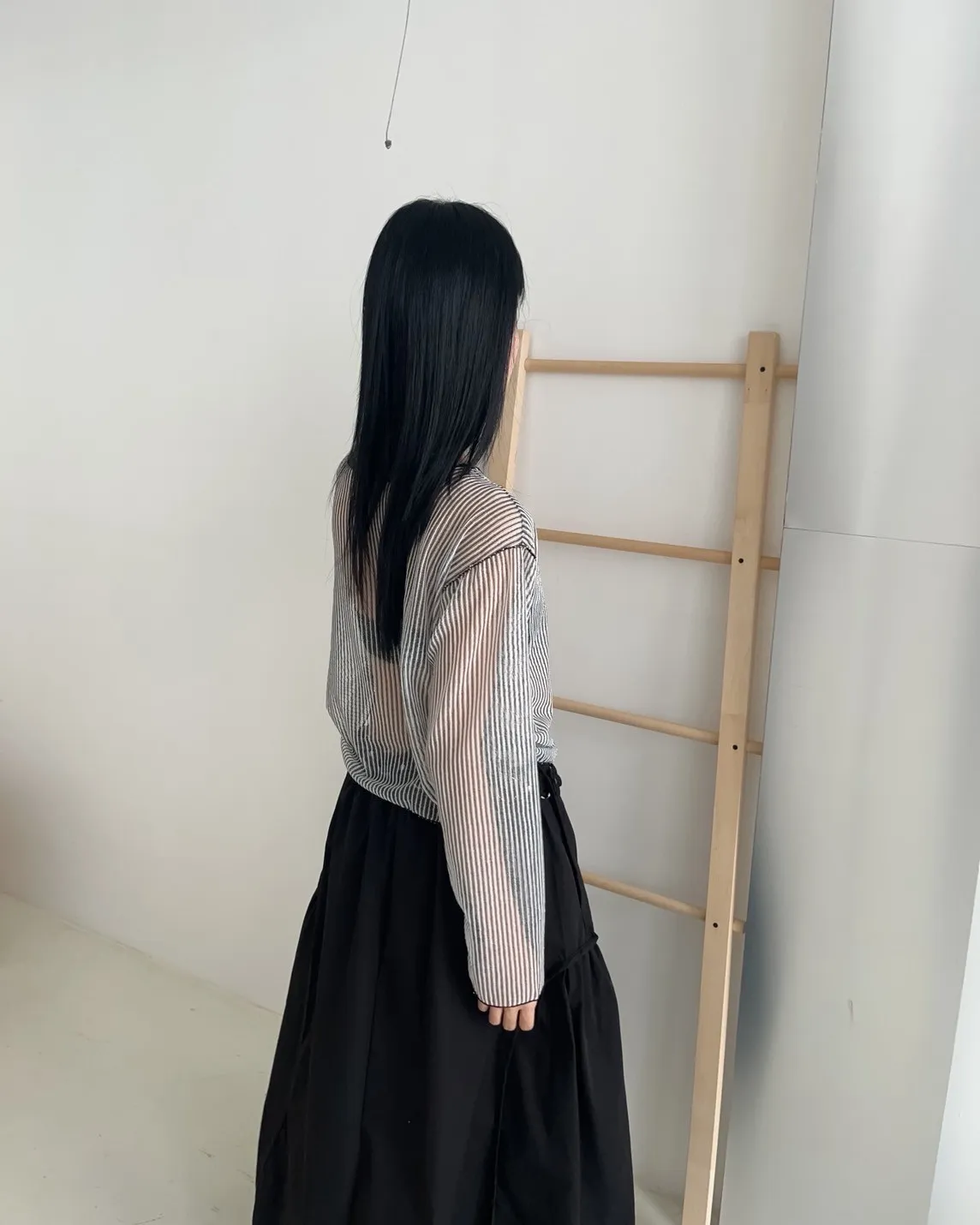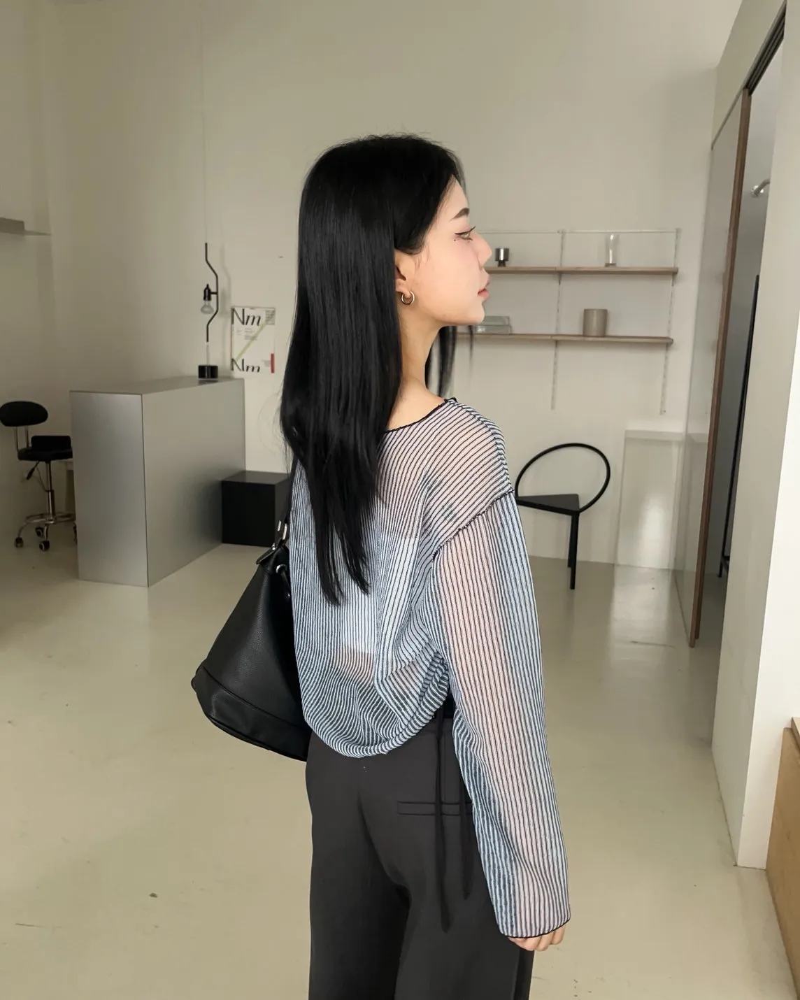 U0047直紋寬版抽腰鏤空上衣(白/藍/黑)