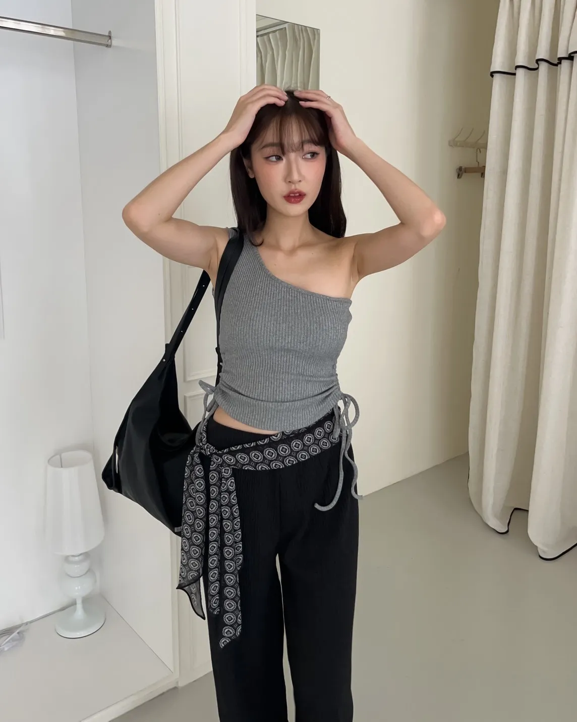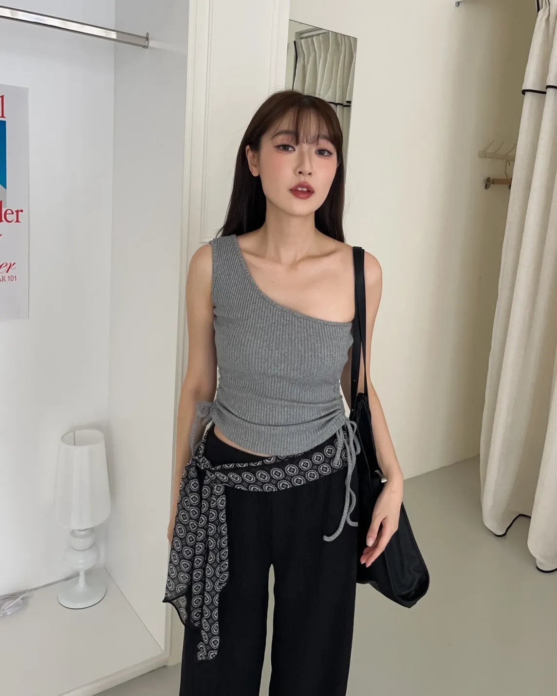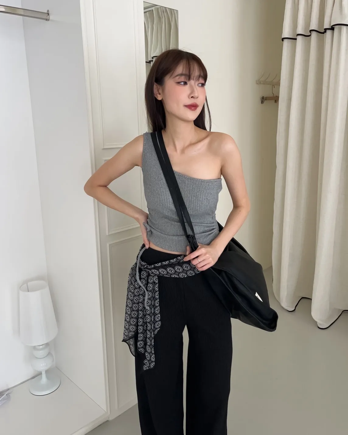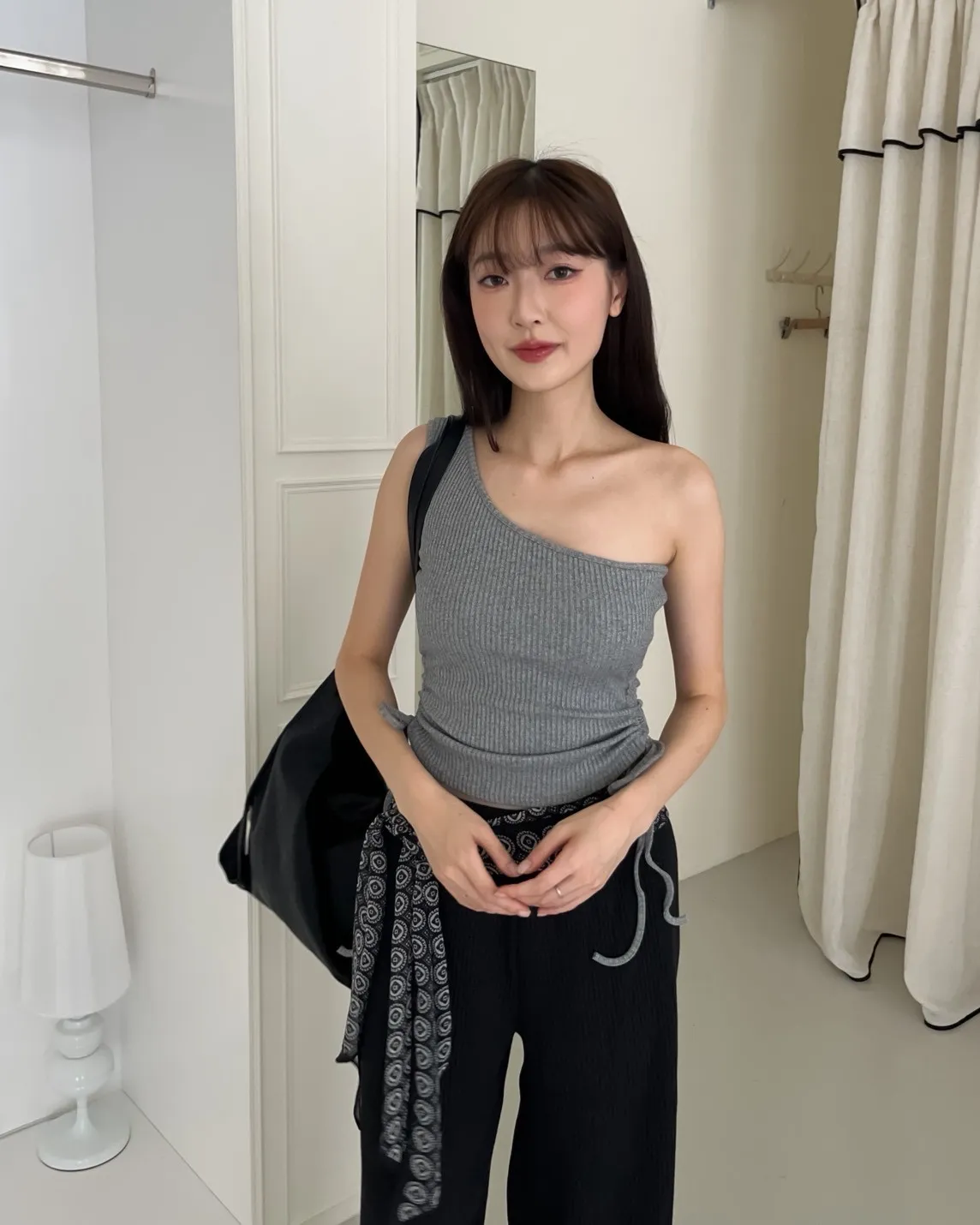 V0001單肩厚坑條抽腰罩杯背心(白/灰/黑)