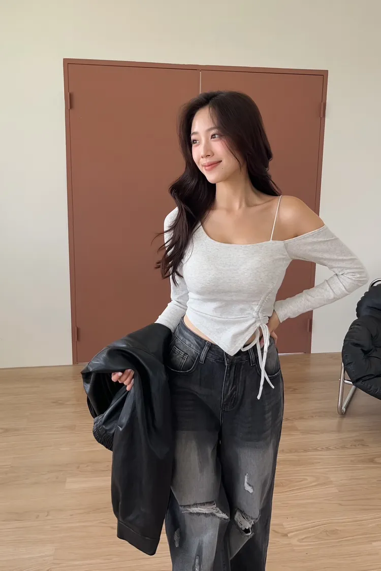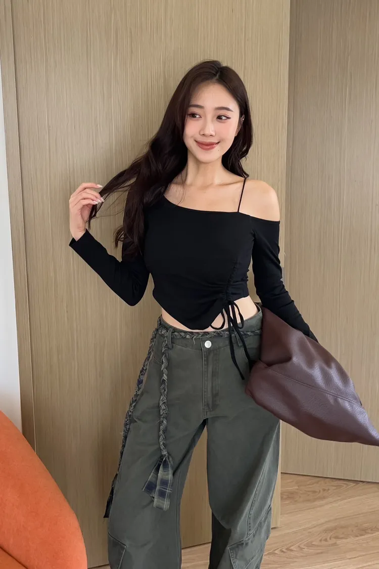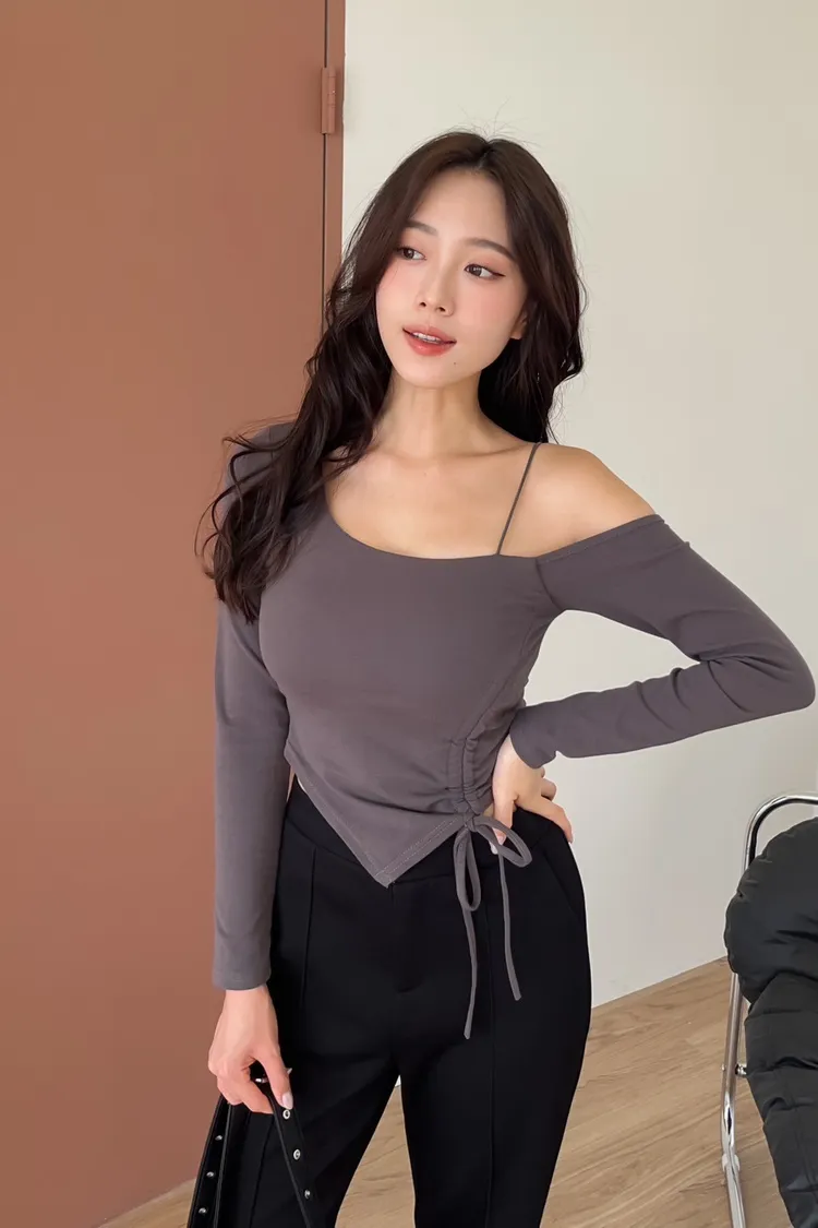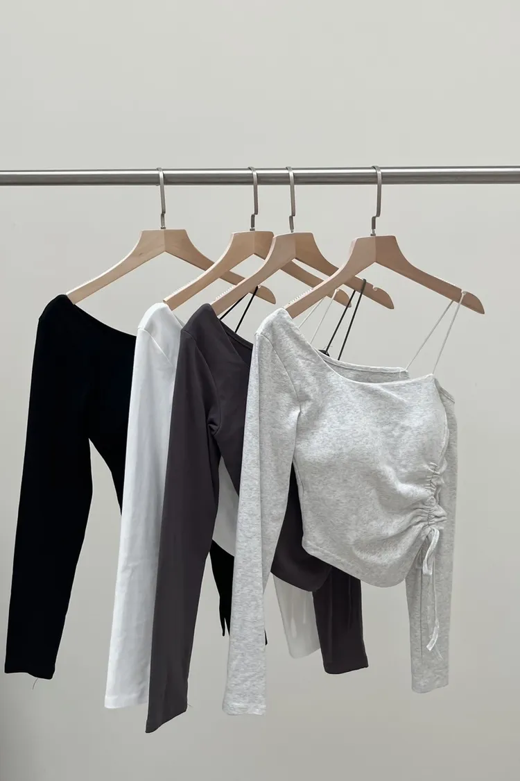 U0076不規則單肩側抽繩罩杯上衣(白/淺灰/深灰/黑)