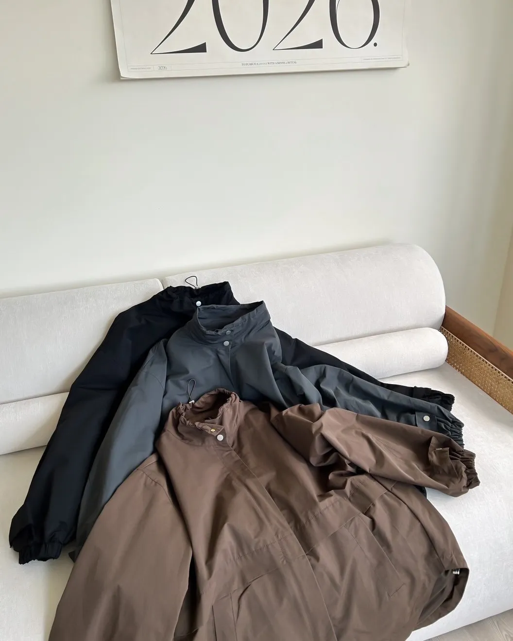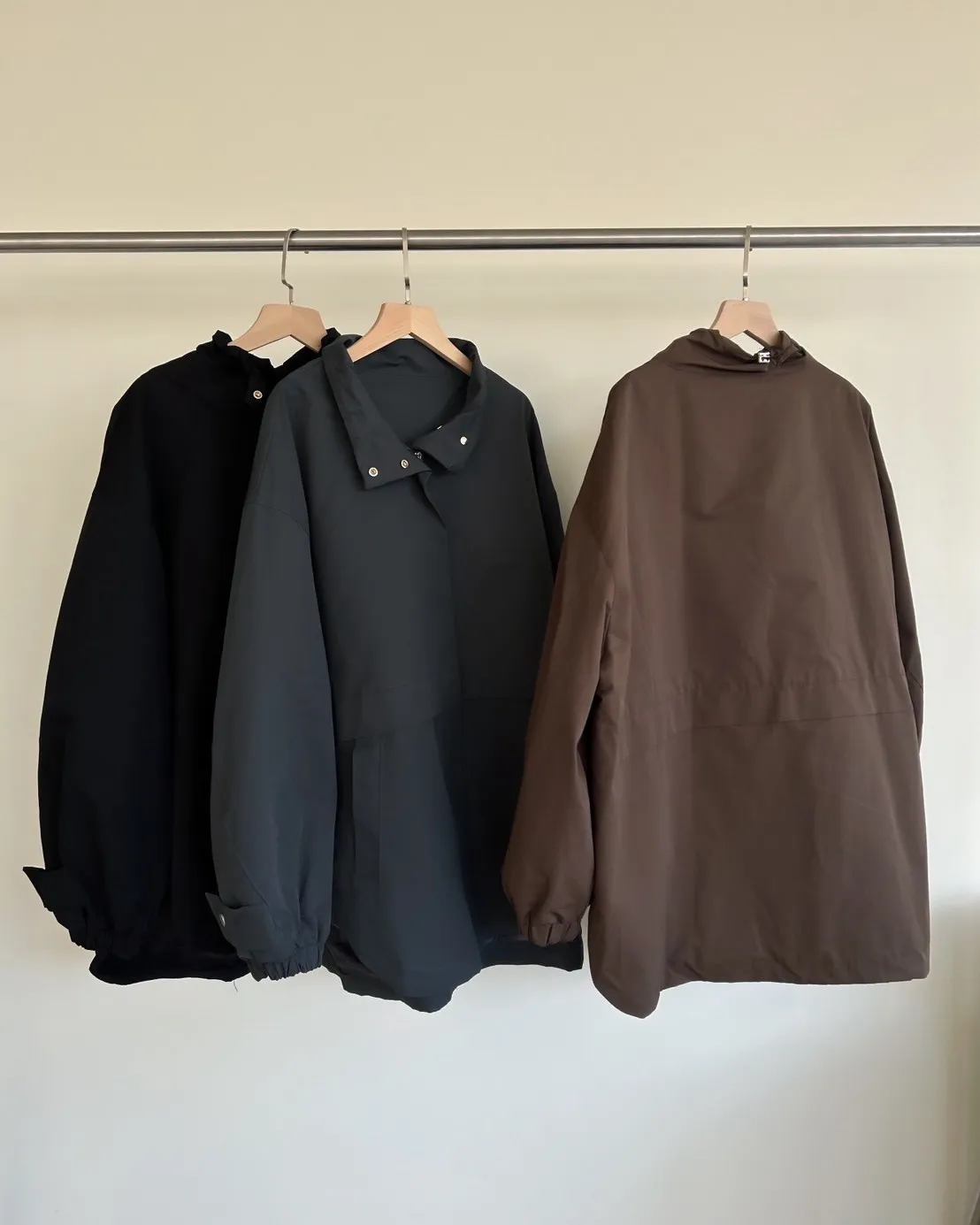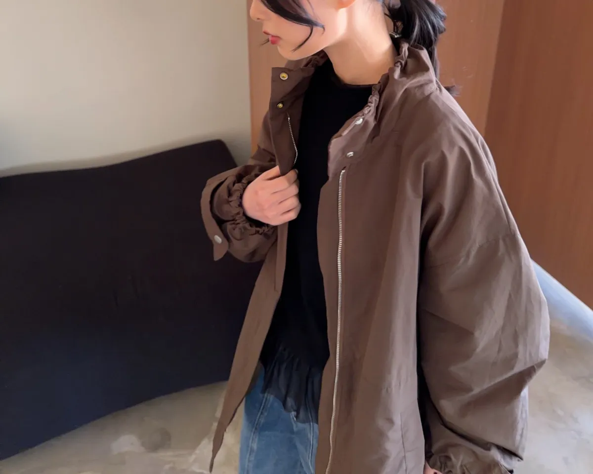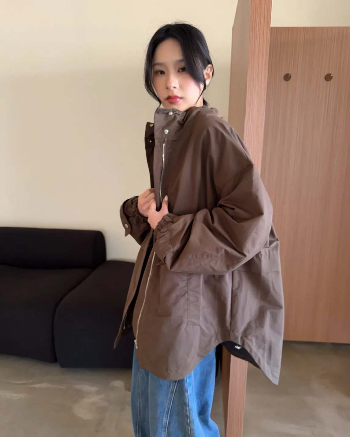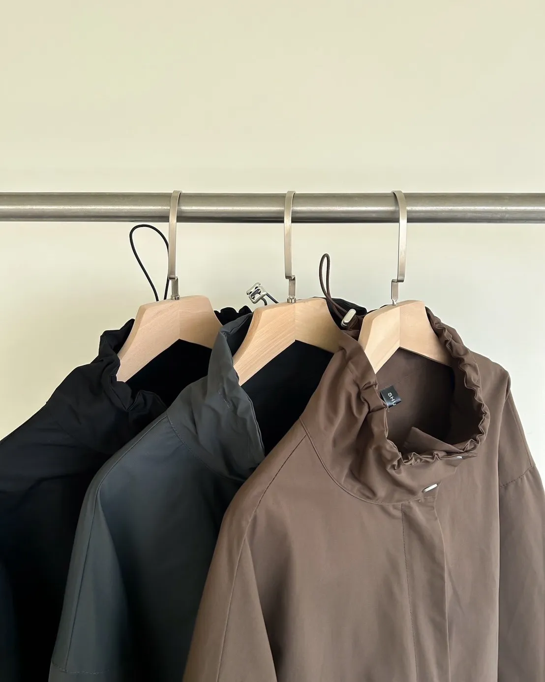 立領抽繩 皺皺花苞感 刷刷防風布料 寬鬆落肩 下擺圓弧 抽繩可縮 兩側口袋 袖口鬆緊 中間層次假折設計