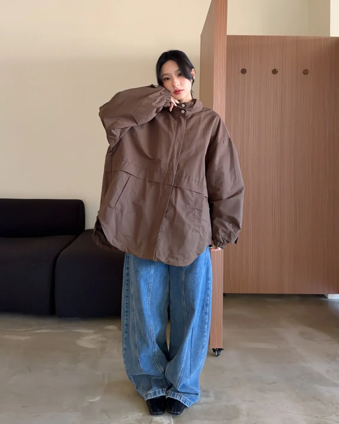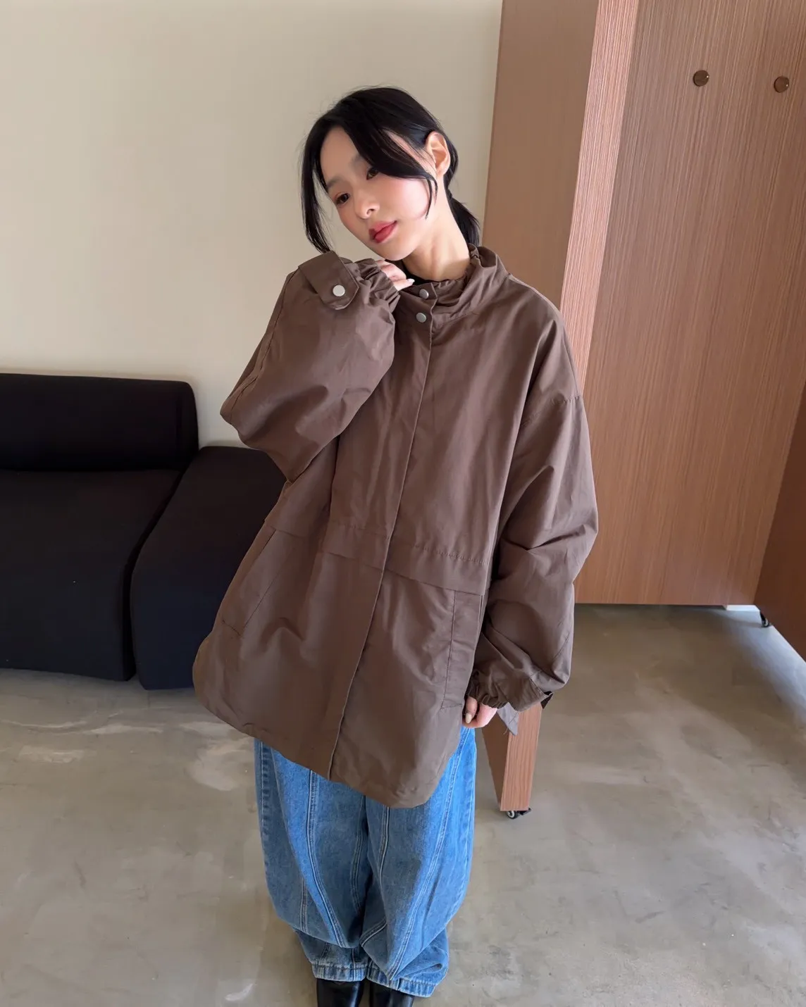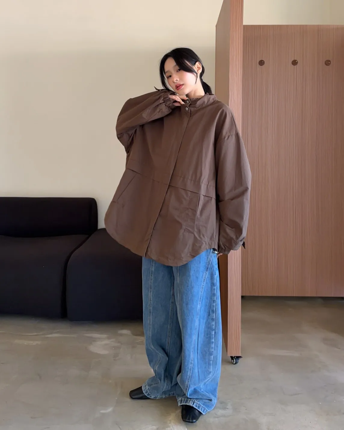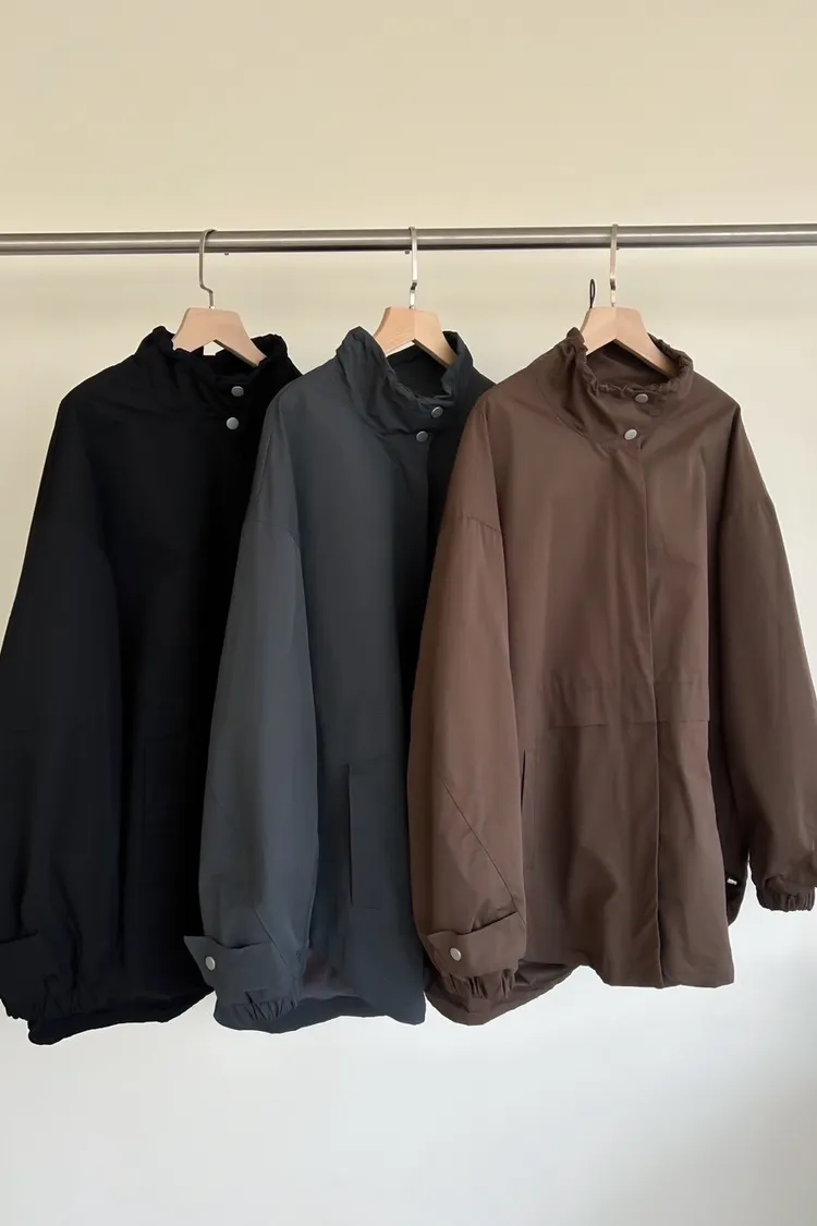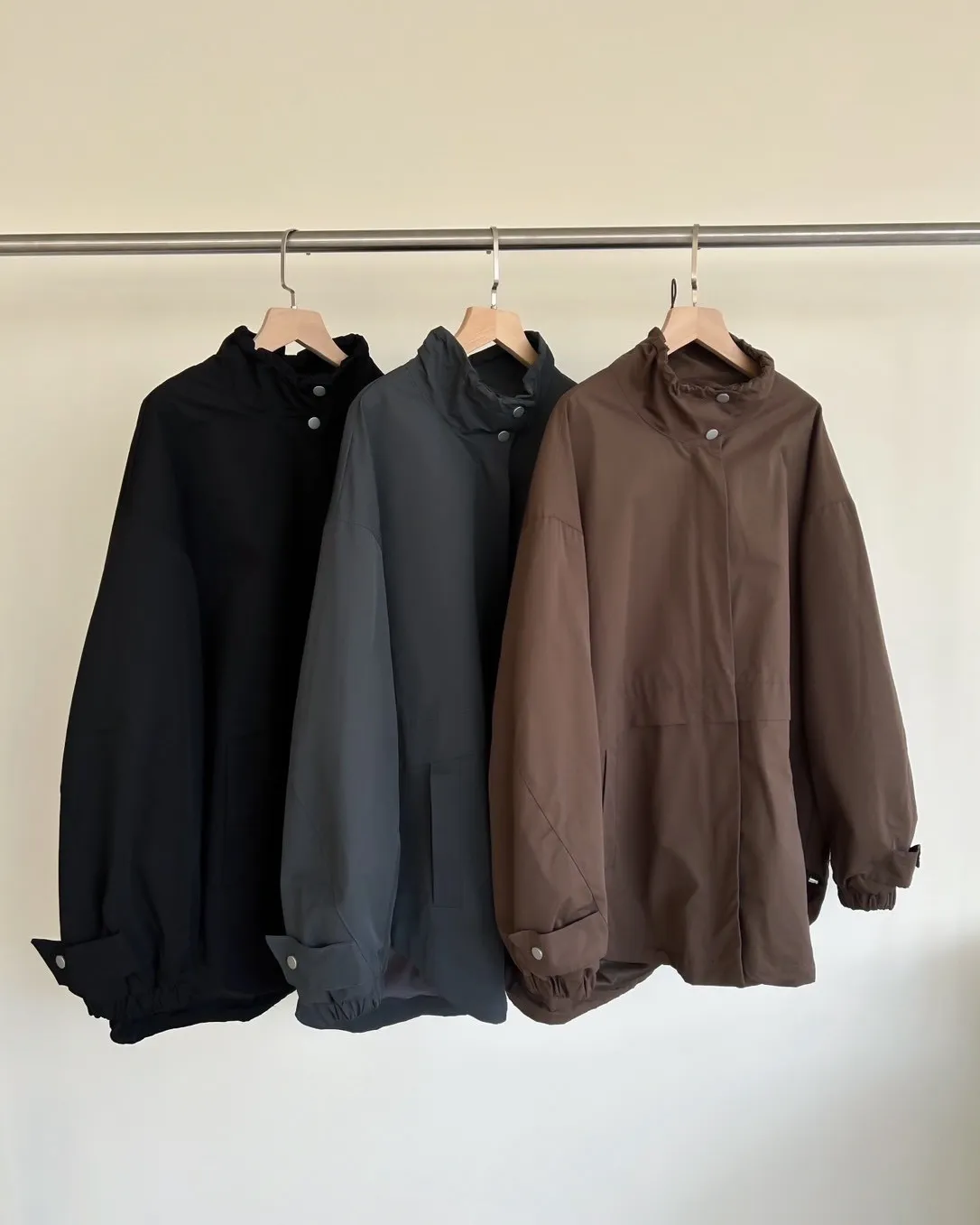立領抽繩 皺皺花苞感 刷刷防風布料 寬鬆落肩 下擺圓弧 抽繩可縮 兩側口袋 袖口鬆緊 中間層次假折設計
