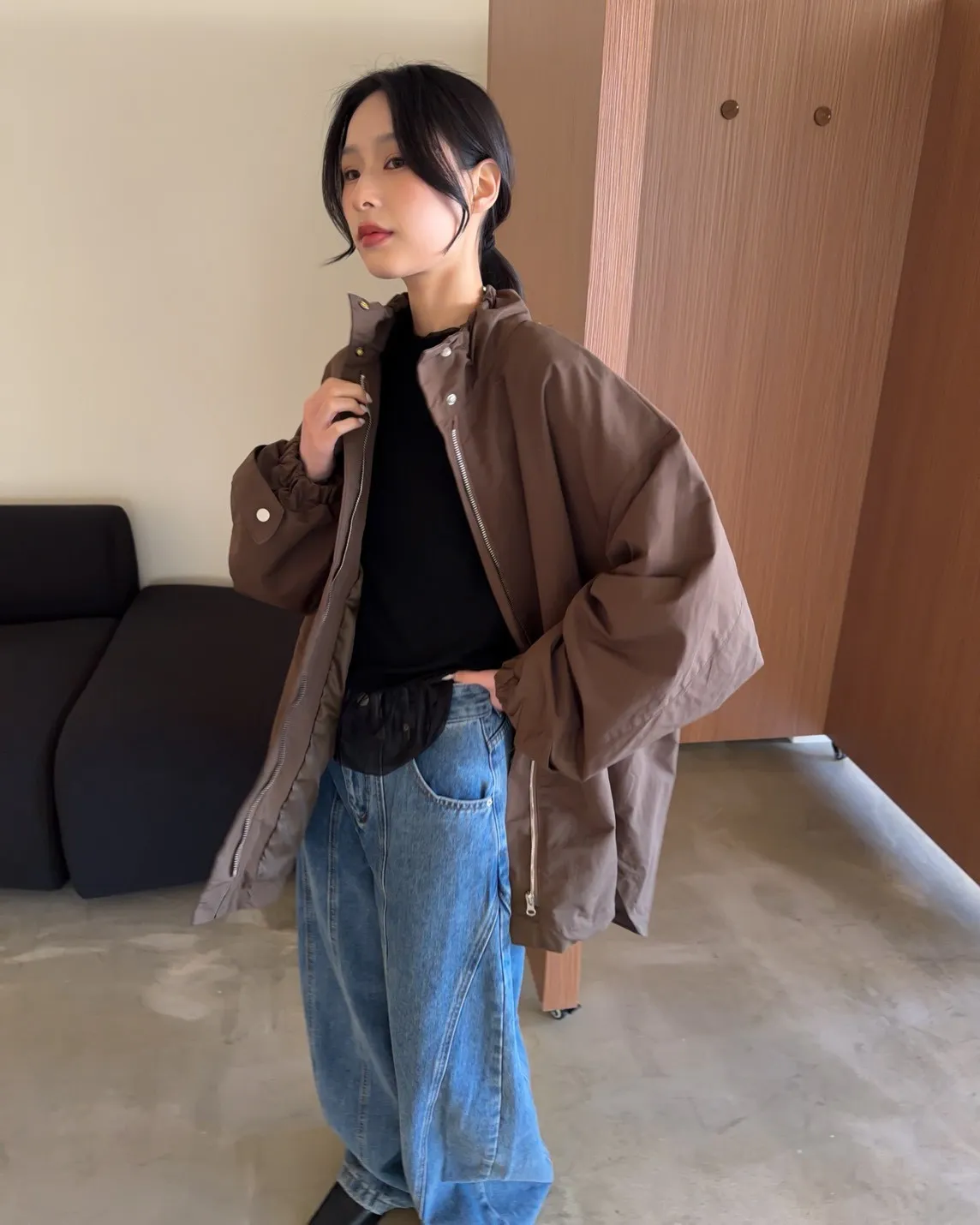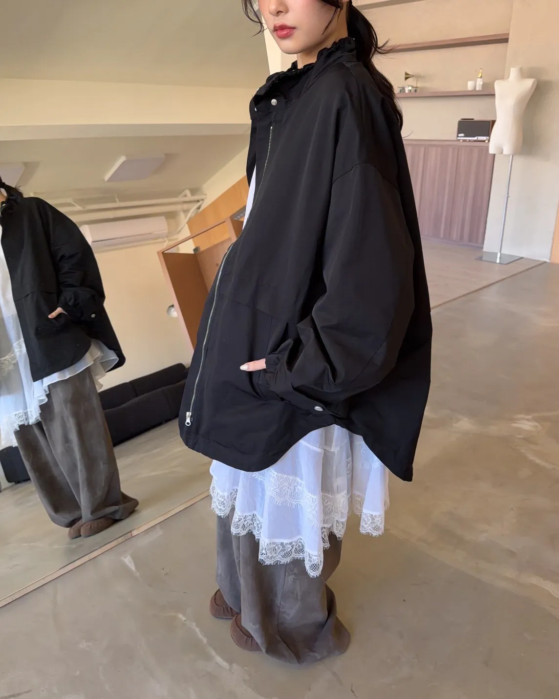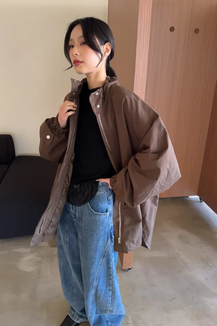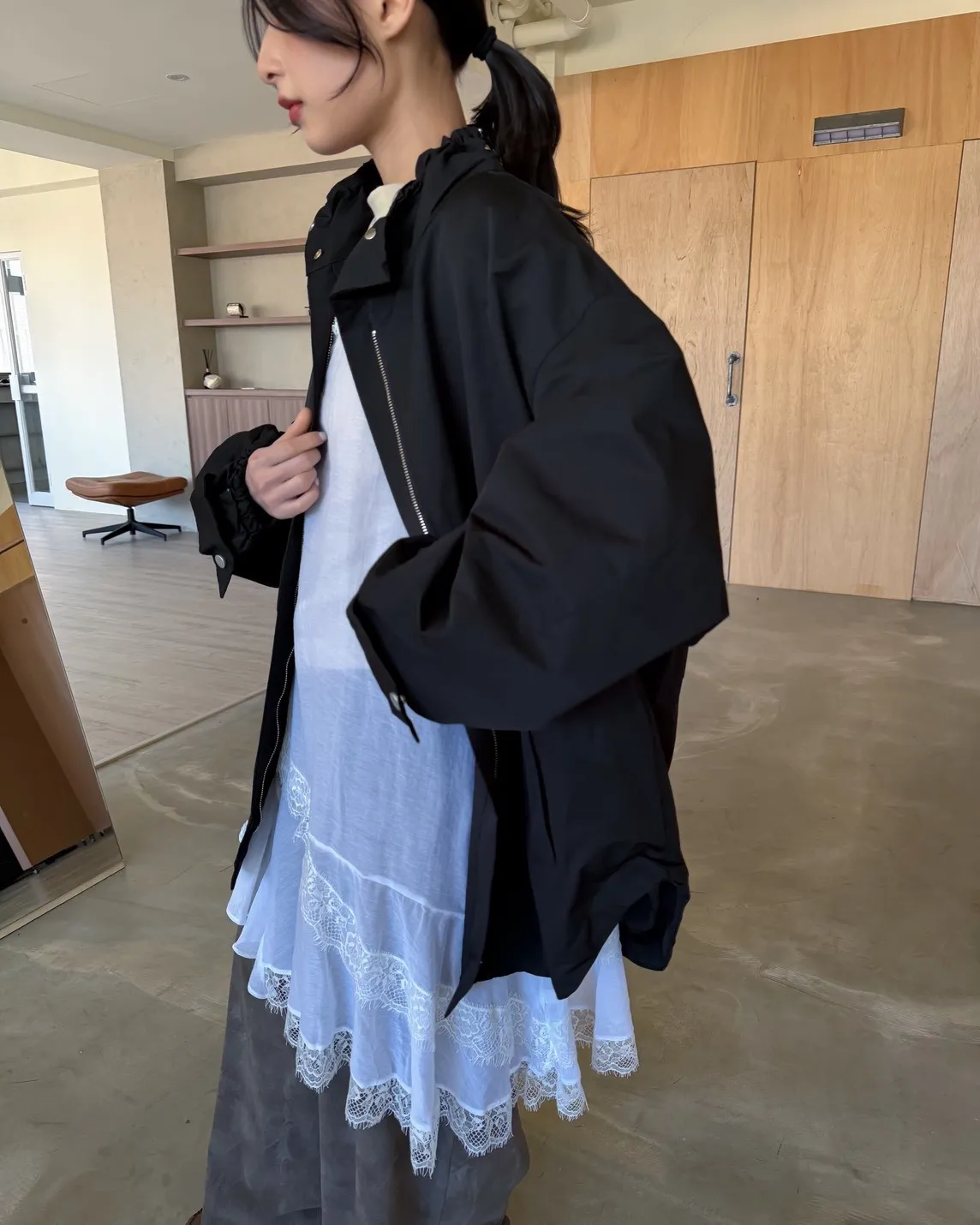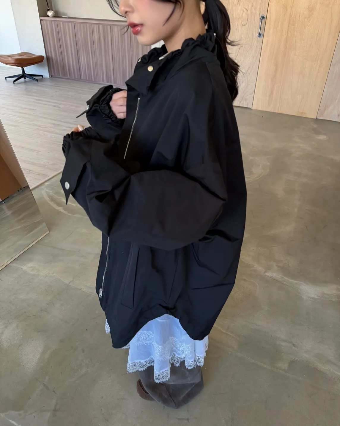 立領抽繩 皺皺花苞感 刷刷防風布料 寬鬆落肩 下擺圓弧 抽繩可縮 兩側口袋 袖口鬆緊 中間層次假折設計
