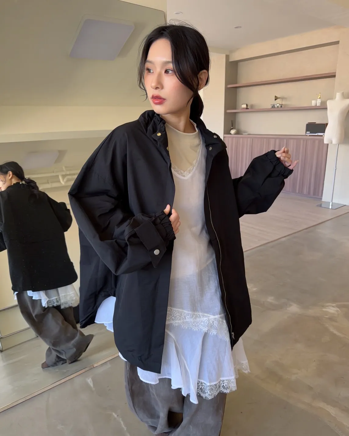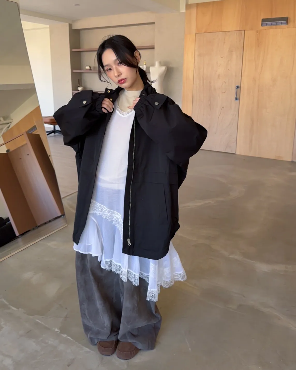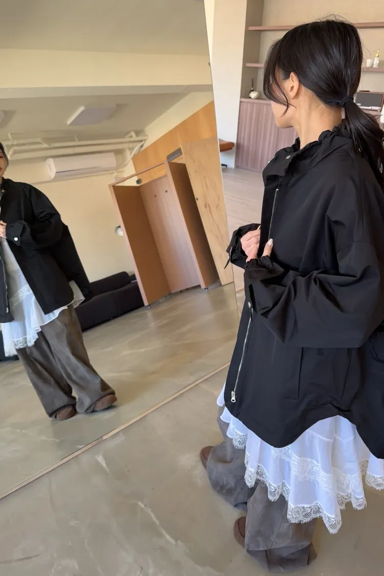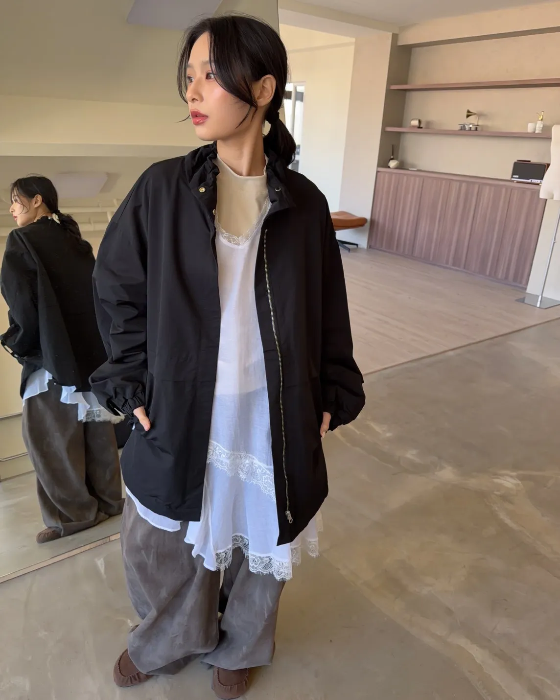 立領抽繩 皺皺花苞感 刷刷防風布料 寬鬆落肩 下擺圓弧 抽繩可縮 兩側口袋 袖口鬆緊 中間層次假折設計