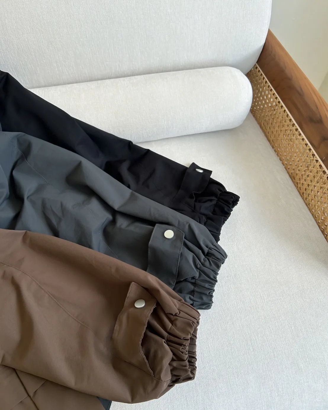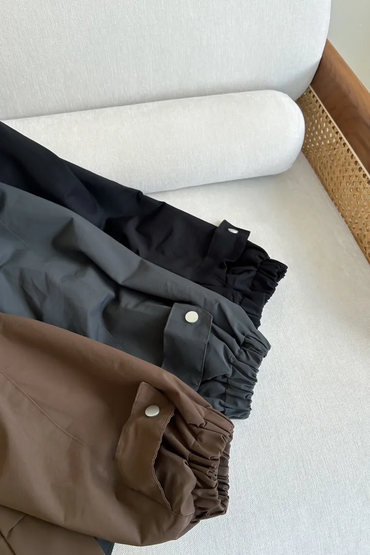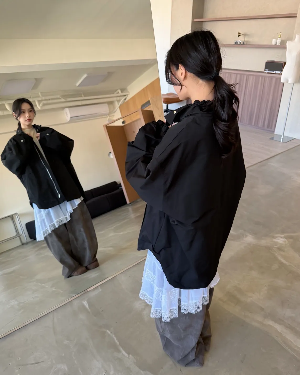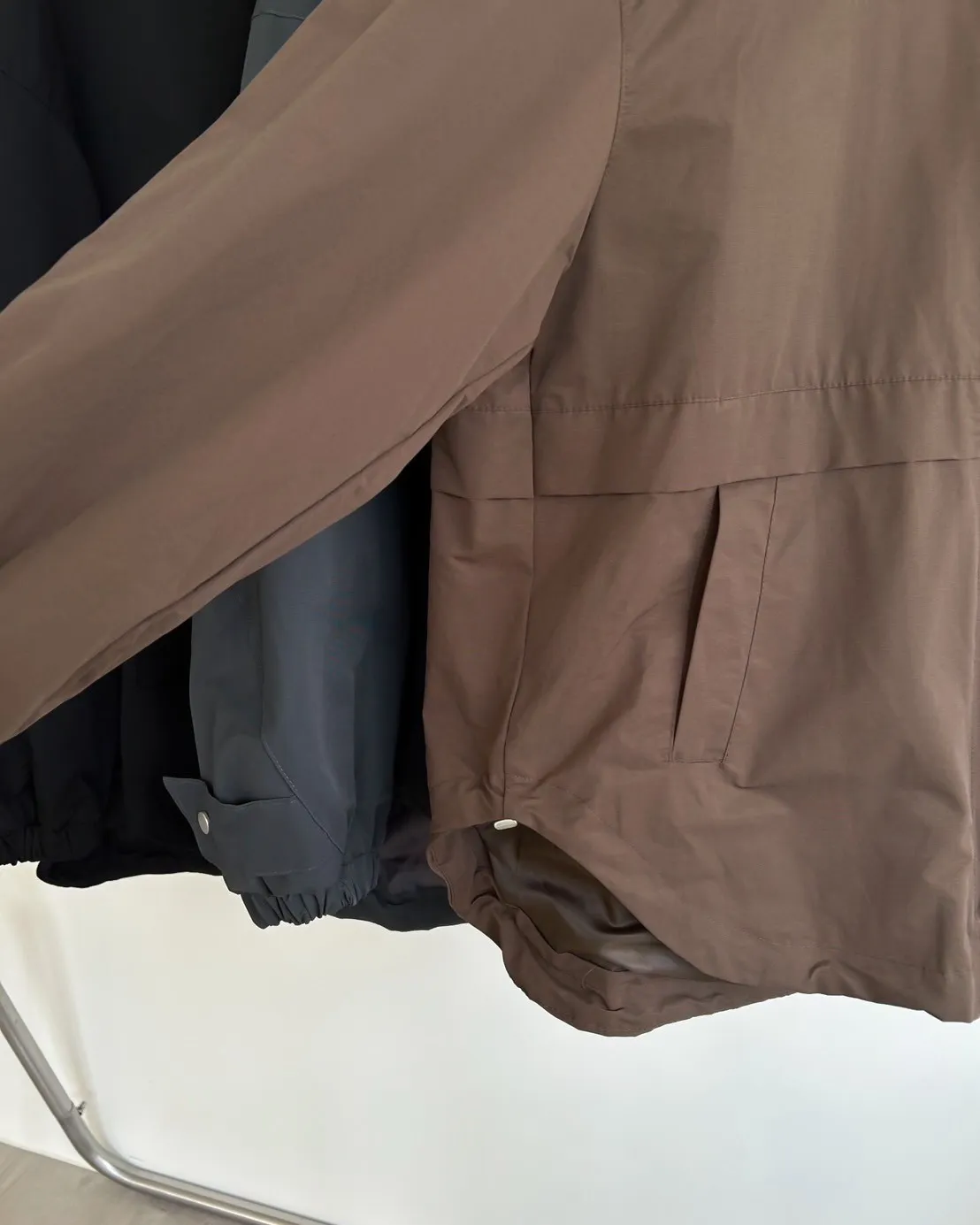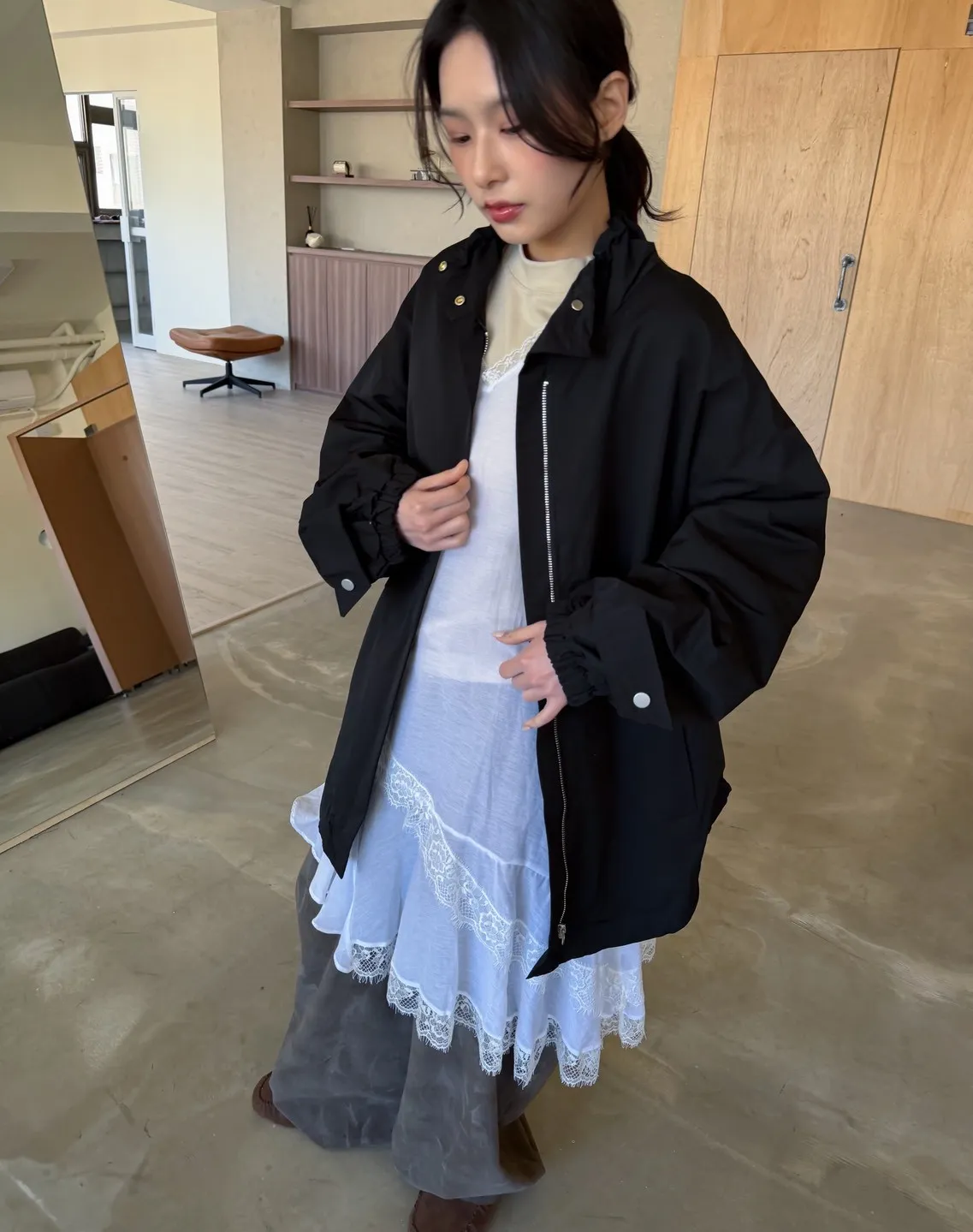 立領抽繩 皺皺花苞感 刷刷防風布料 寬鬆落肩 下擺圓弧 抽繩可縮 兩側口袋 袖口鬆緊 中間層次假折設計