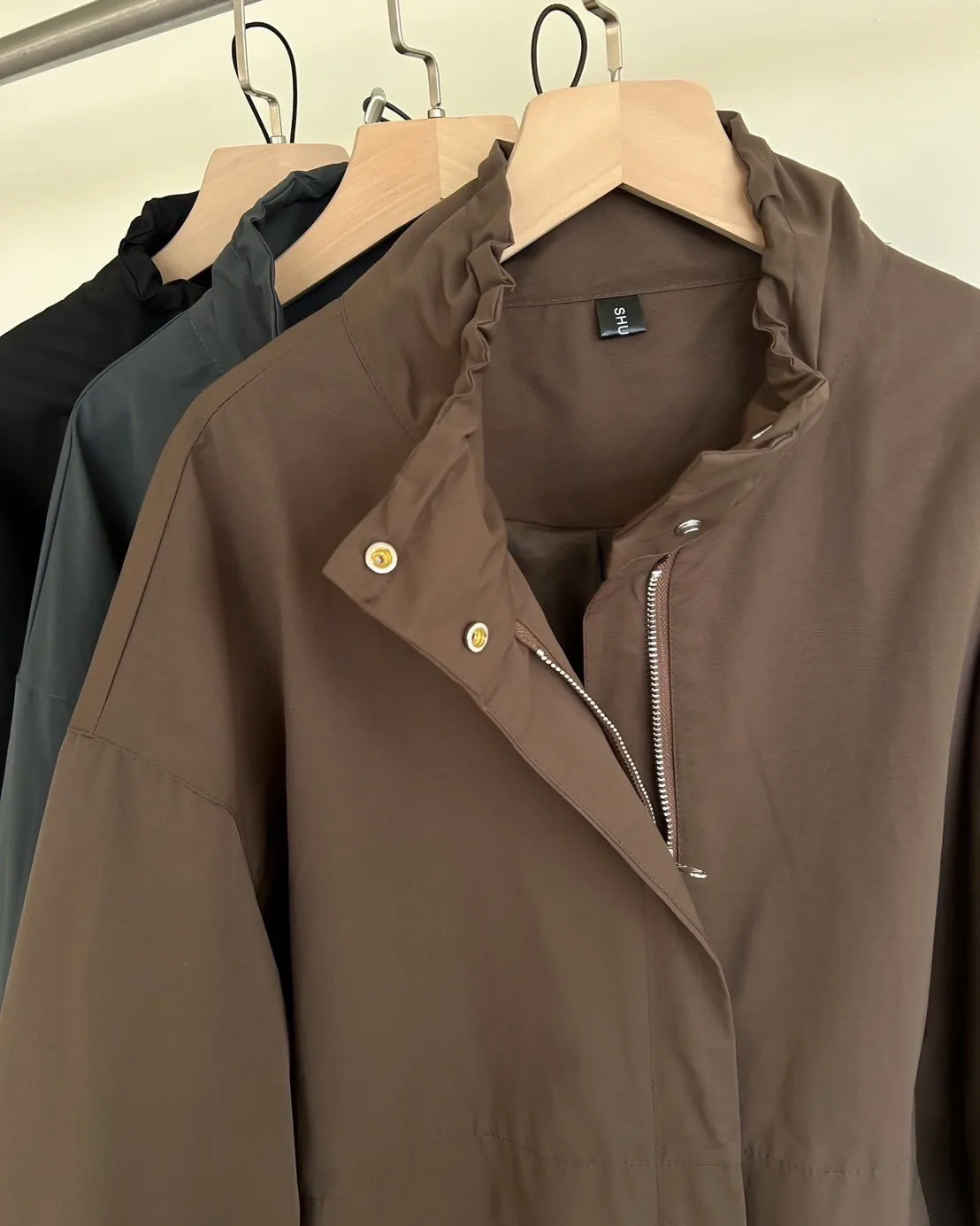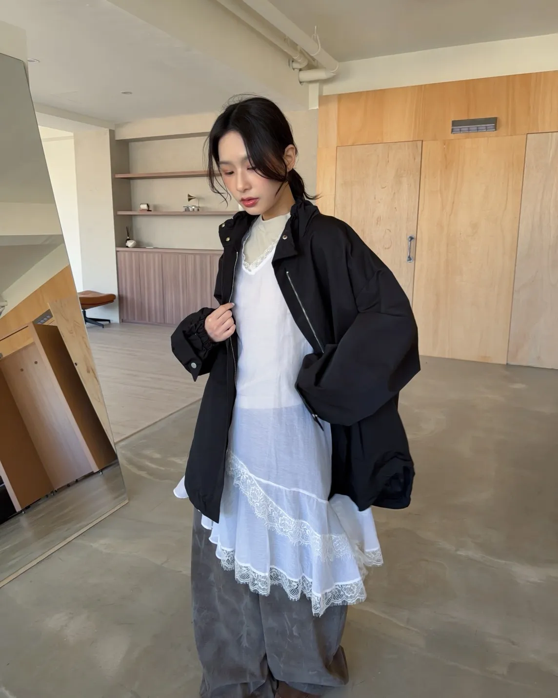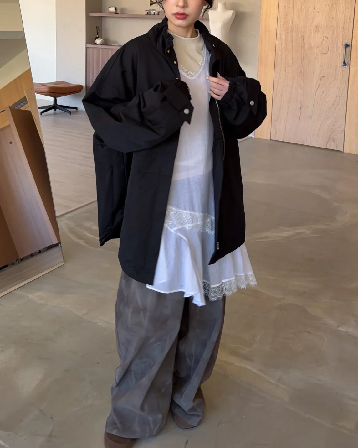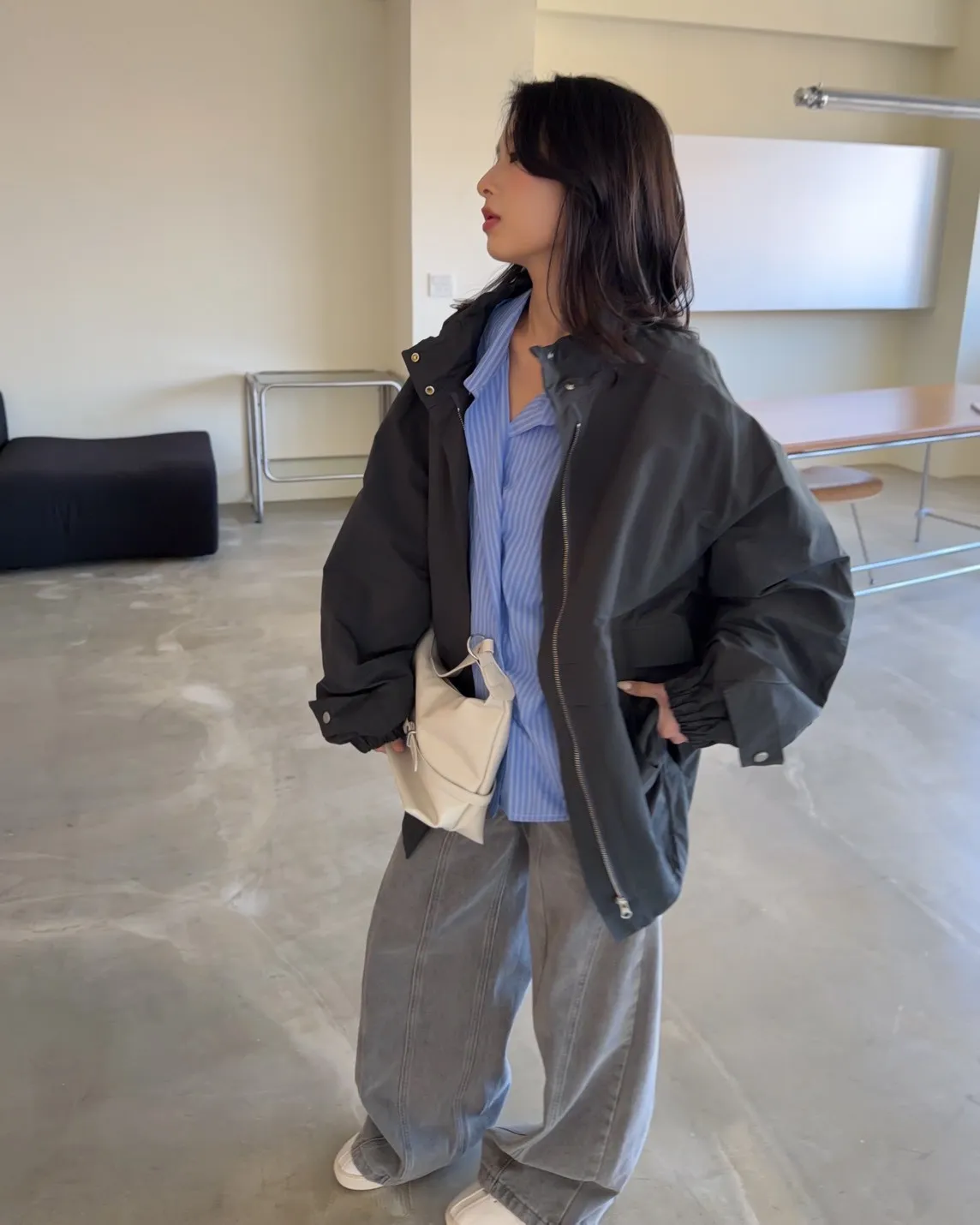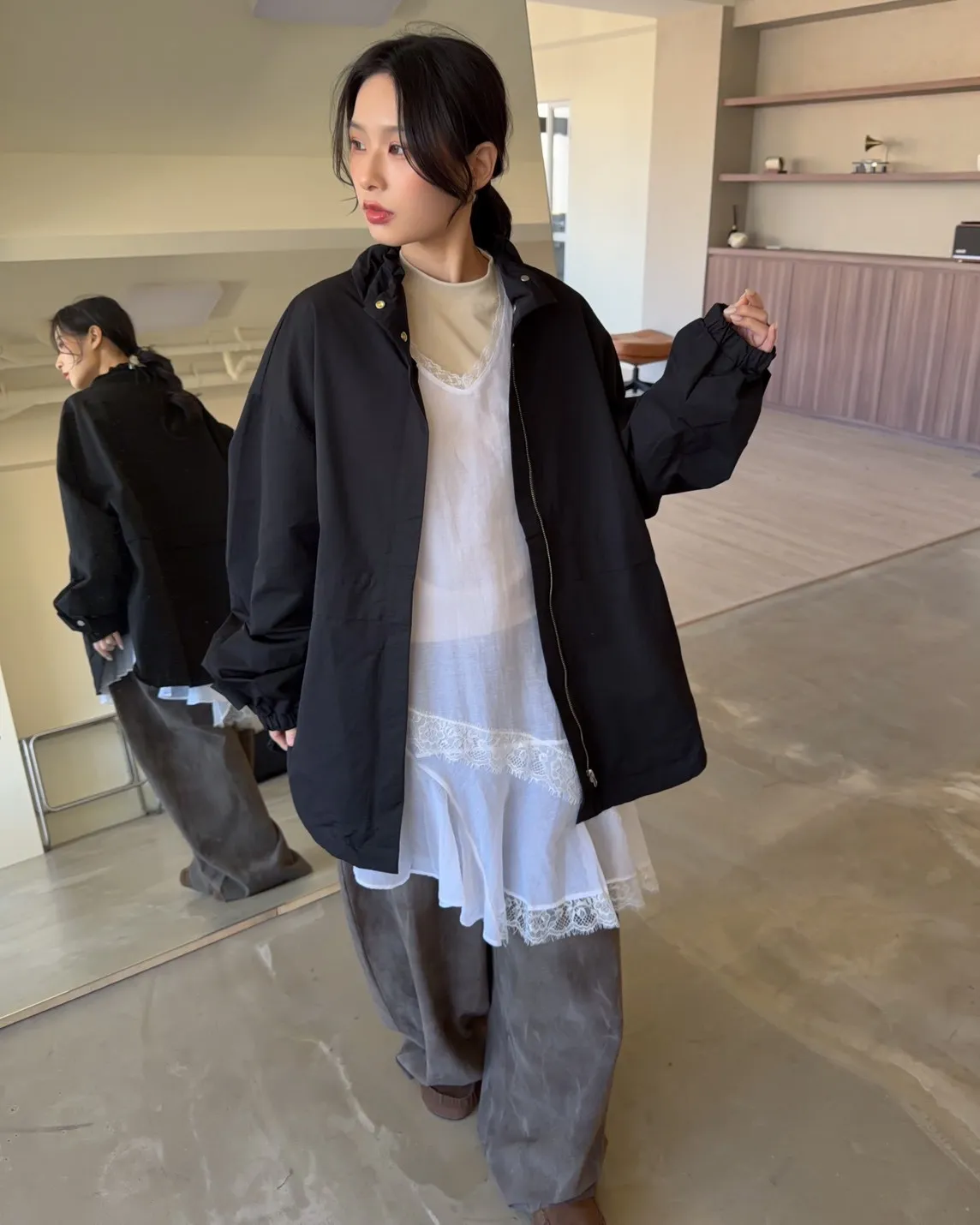 立領抽繩 皺皺花苞感 刷刷防風布料 寬鬆落肩 下擺圓弧 抽繩可縮 兩側口袋 袖口鬆緊 中間層次假折設計