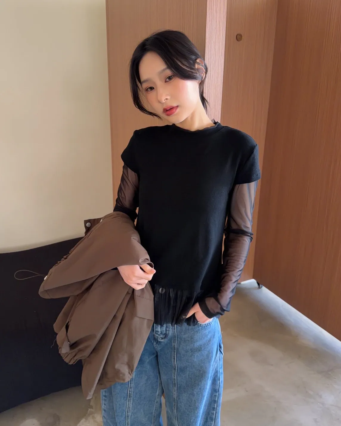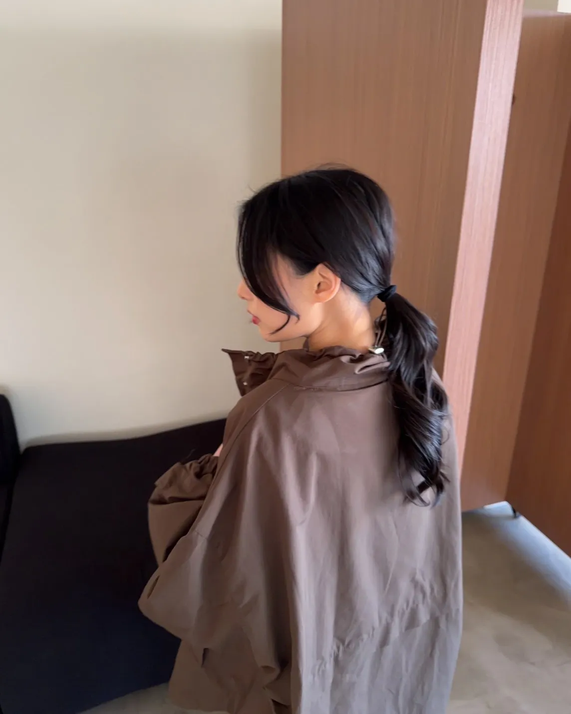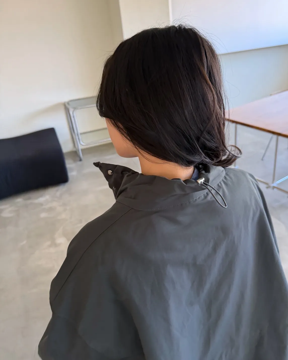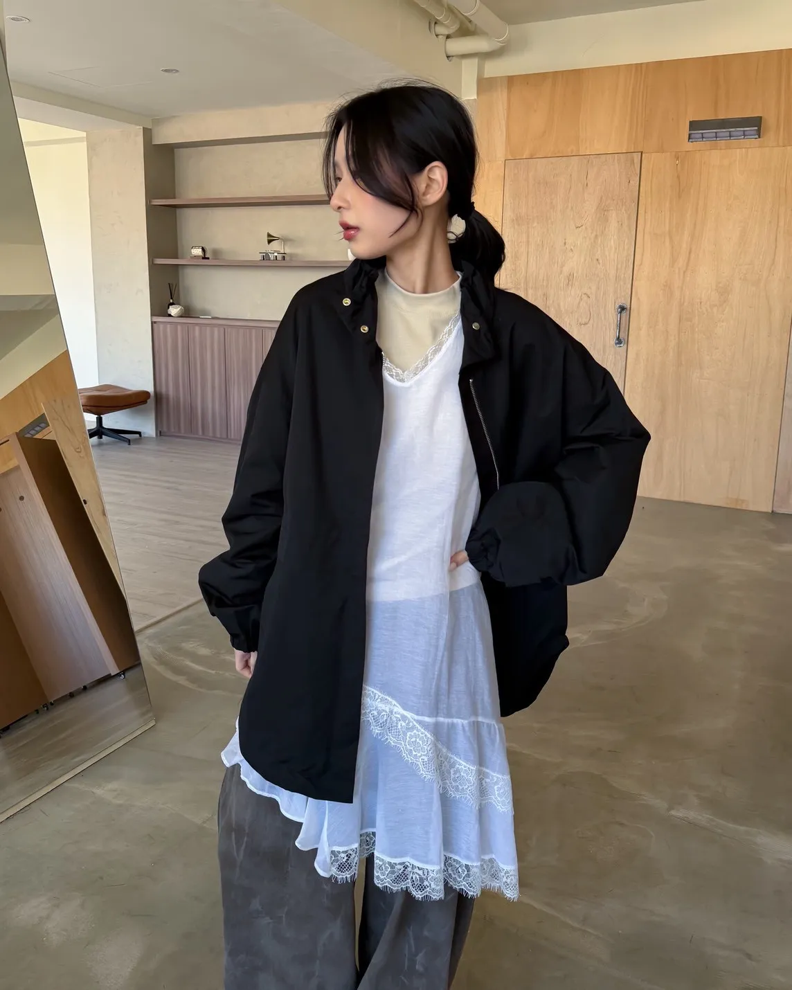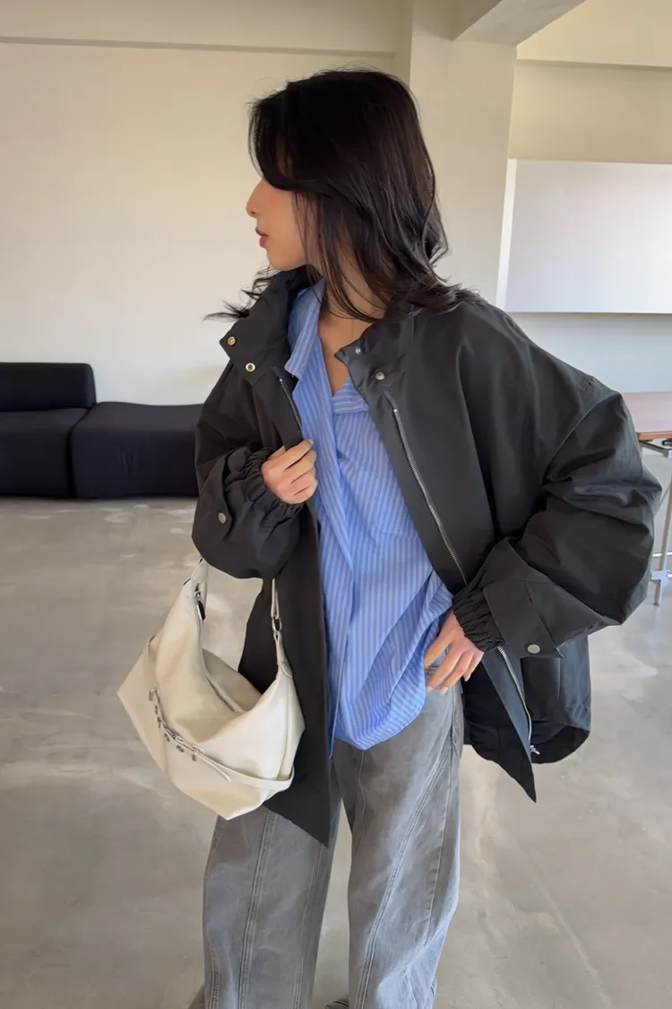 立領抽繩 皺皺花苞感 刷刷防風布料 寬鬆落肩 下擺圓弧 抽繩可縮 兩側口袋 袖口鬆緊 中間層次假折設計