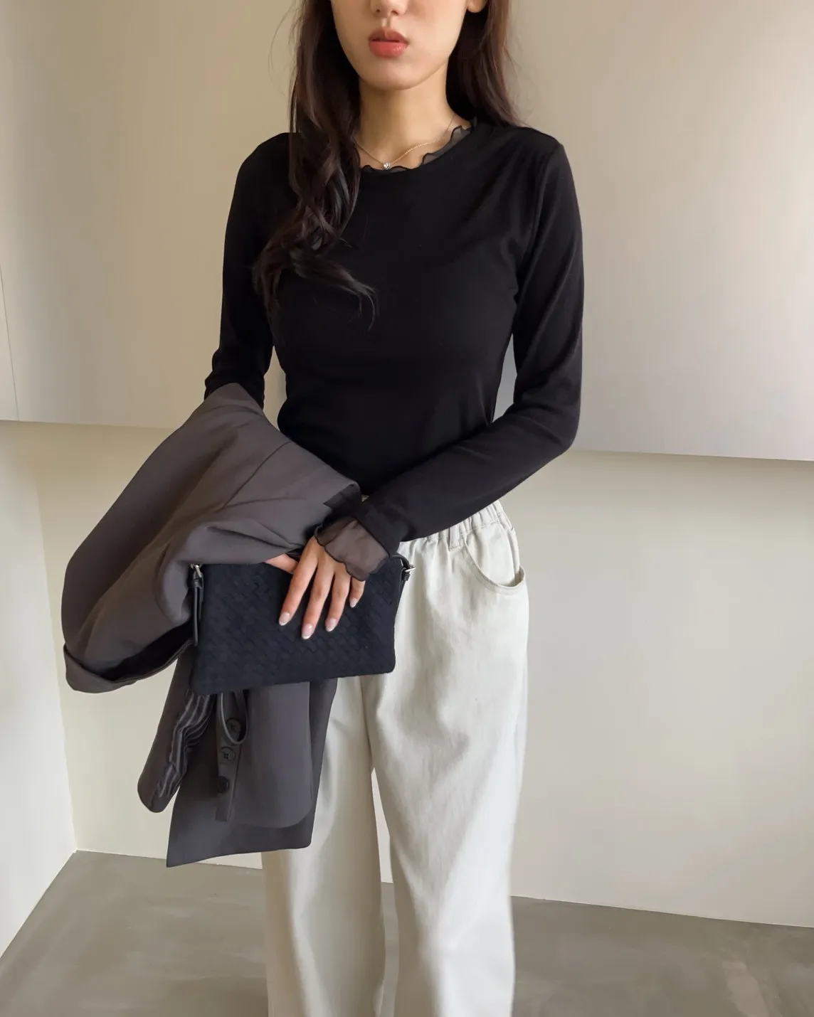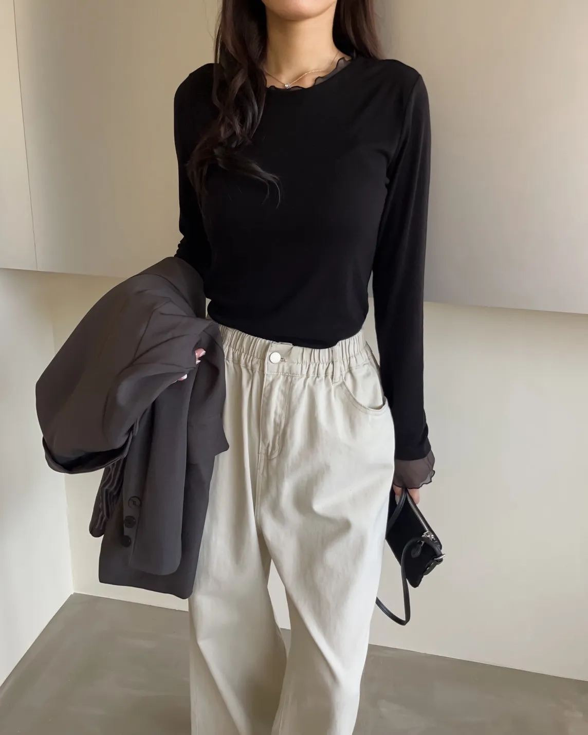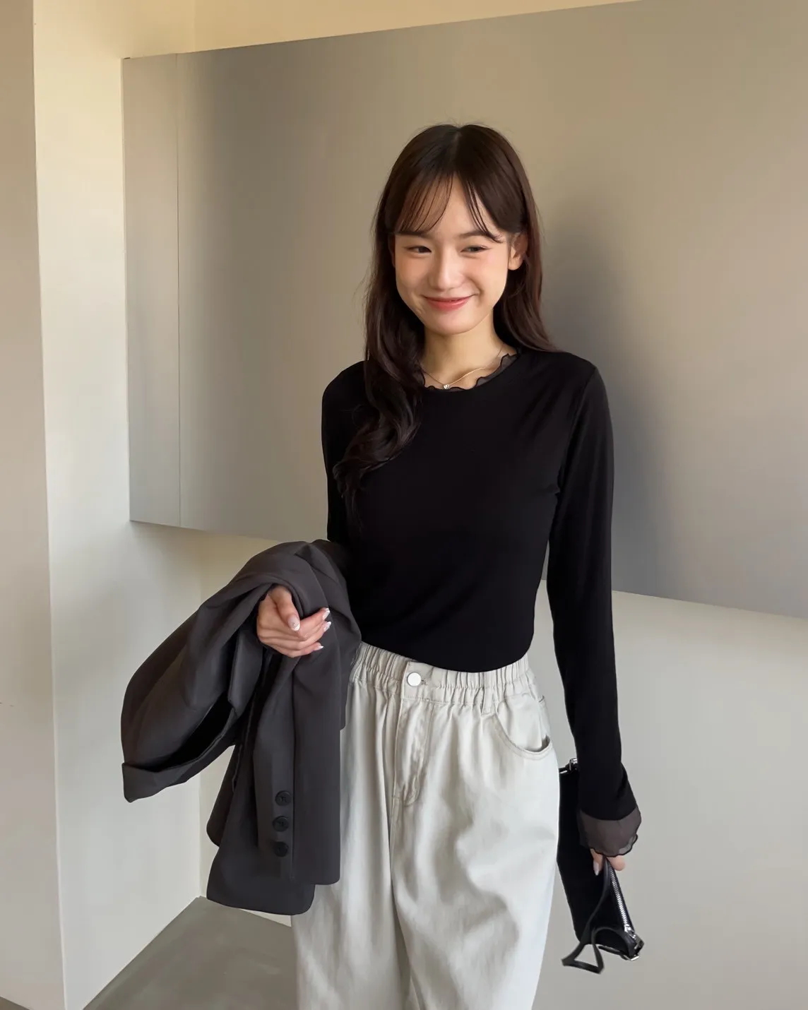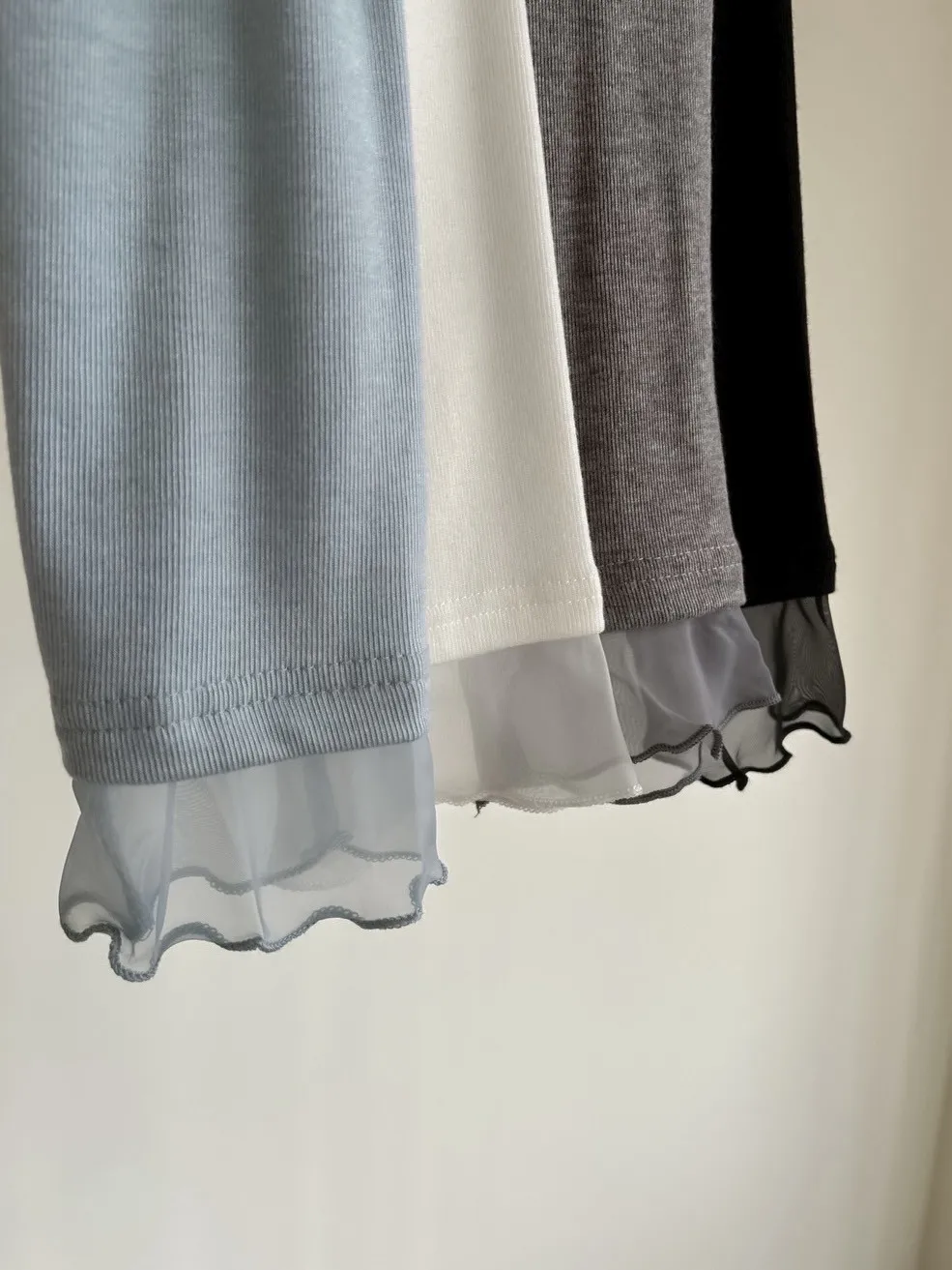 V0071日系網紗滾邊素色棉質上衣(白/藍/灰/黑)