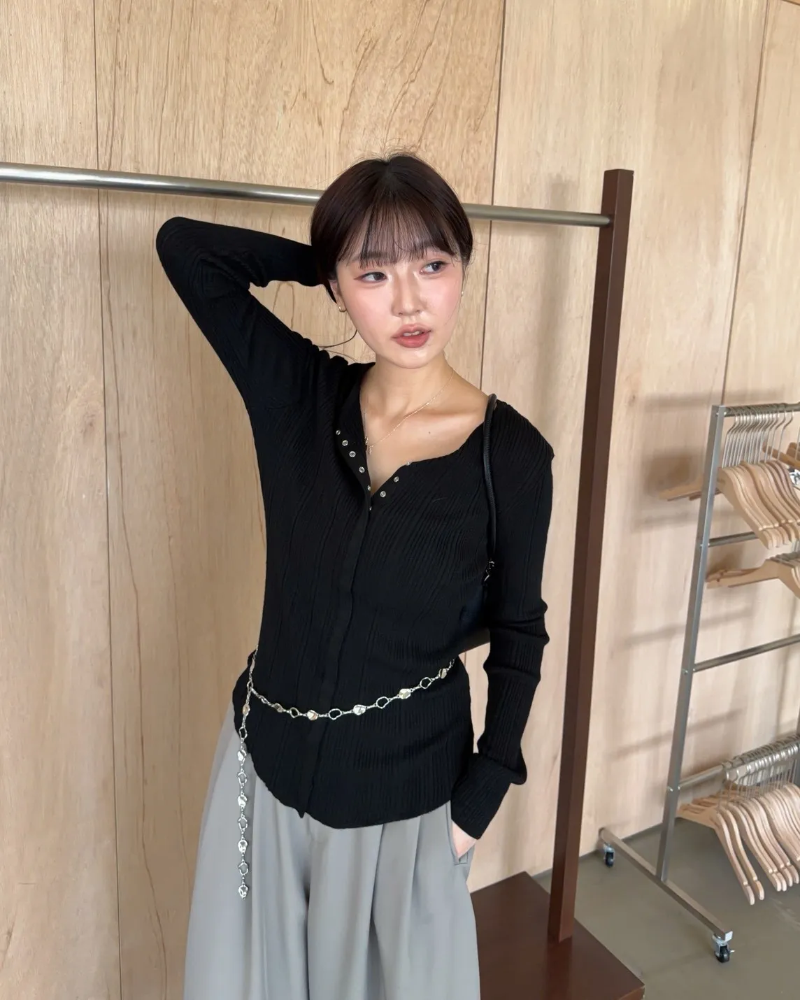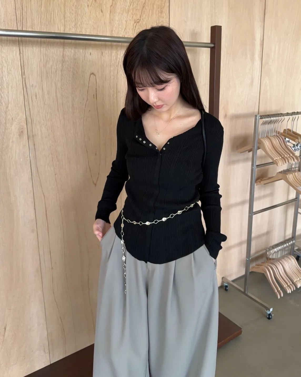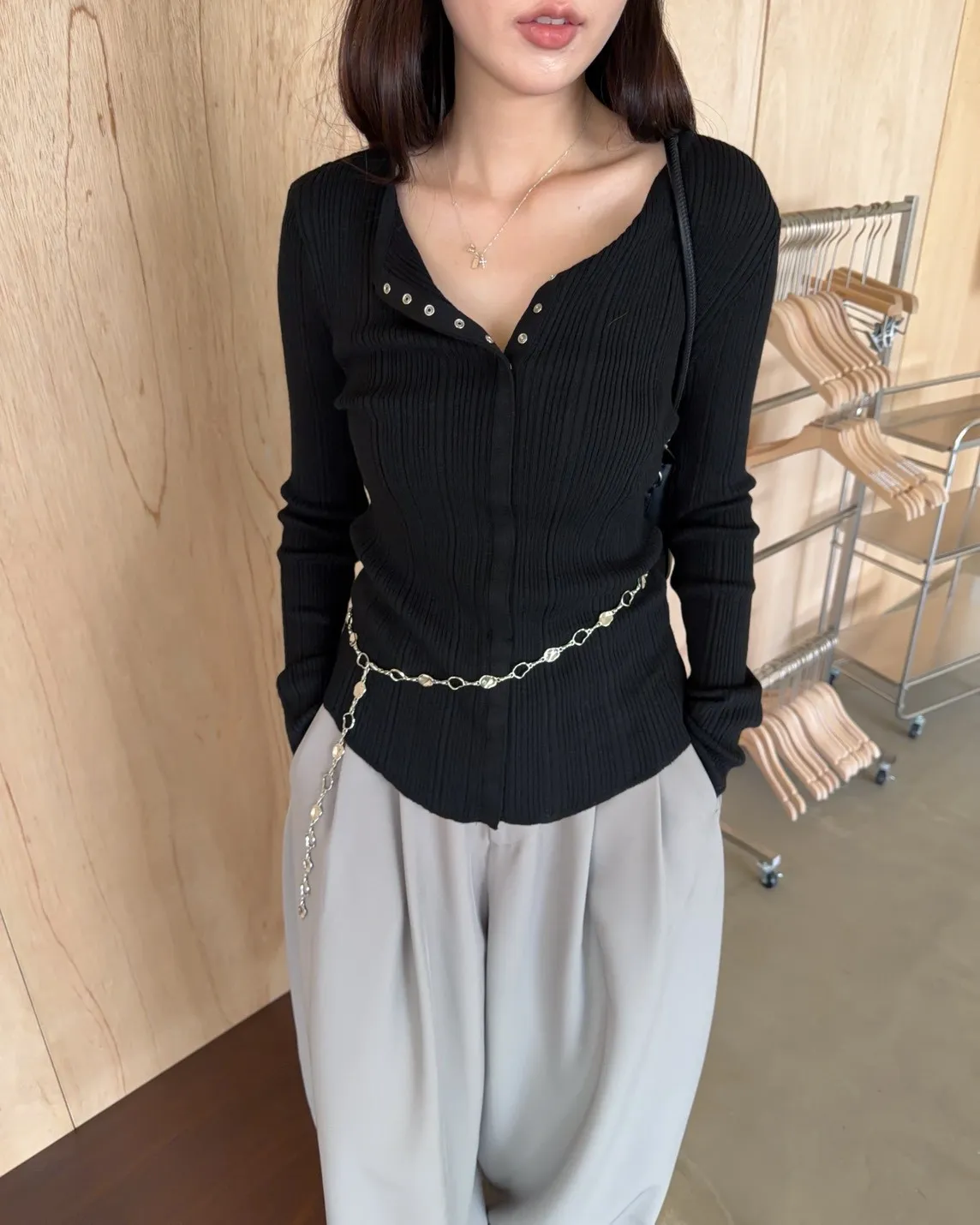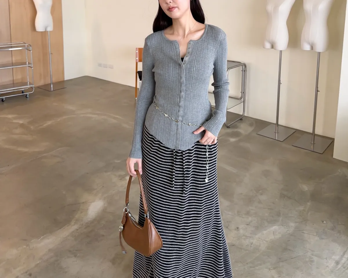 薄透針織 貼身版型 坑紋 隱藏式壓扣 下擺尖尖