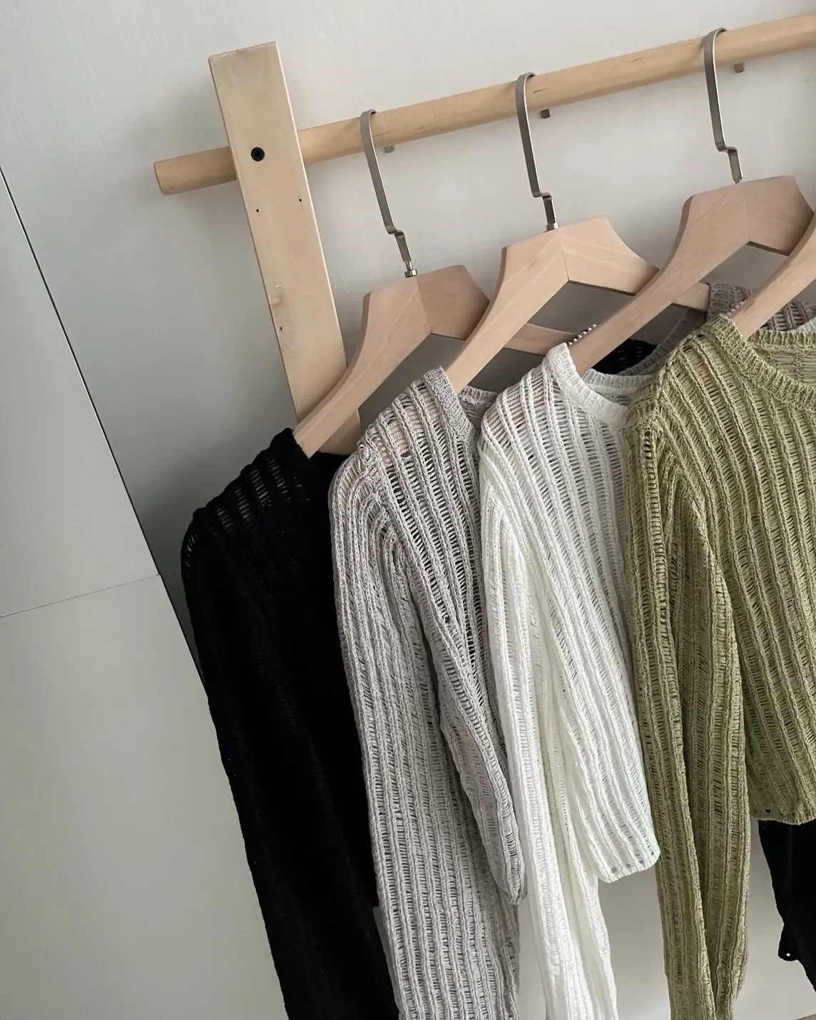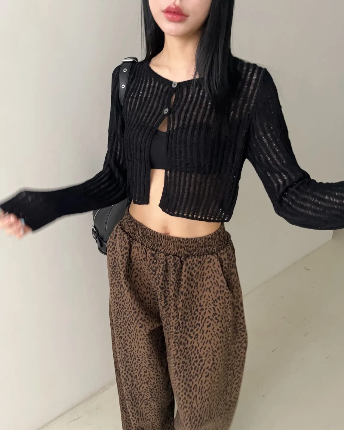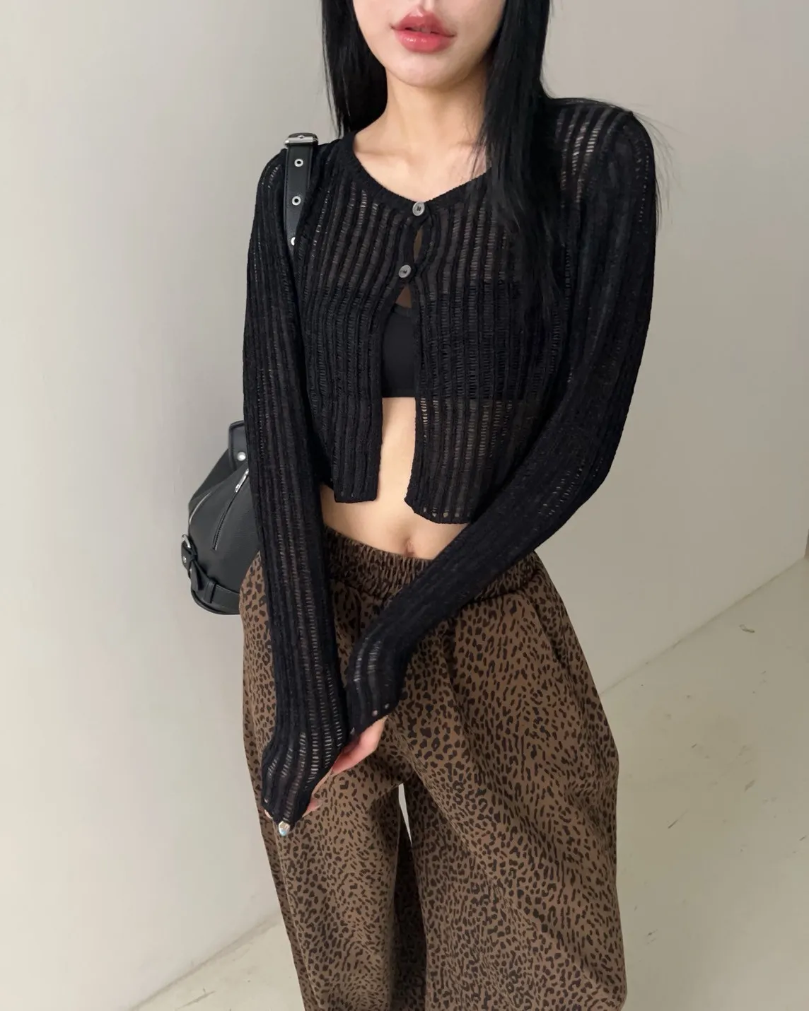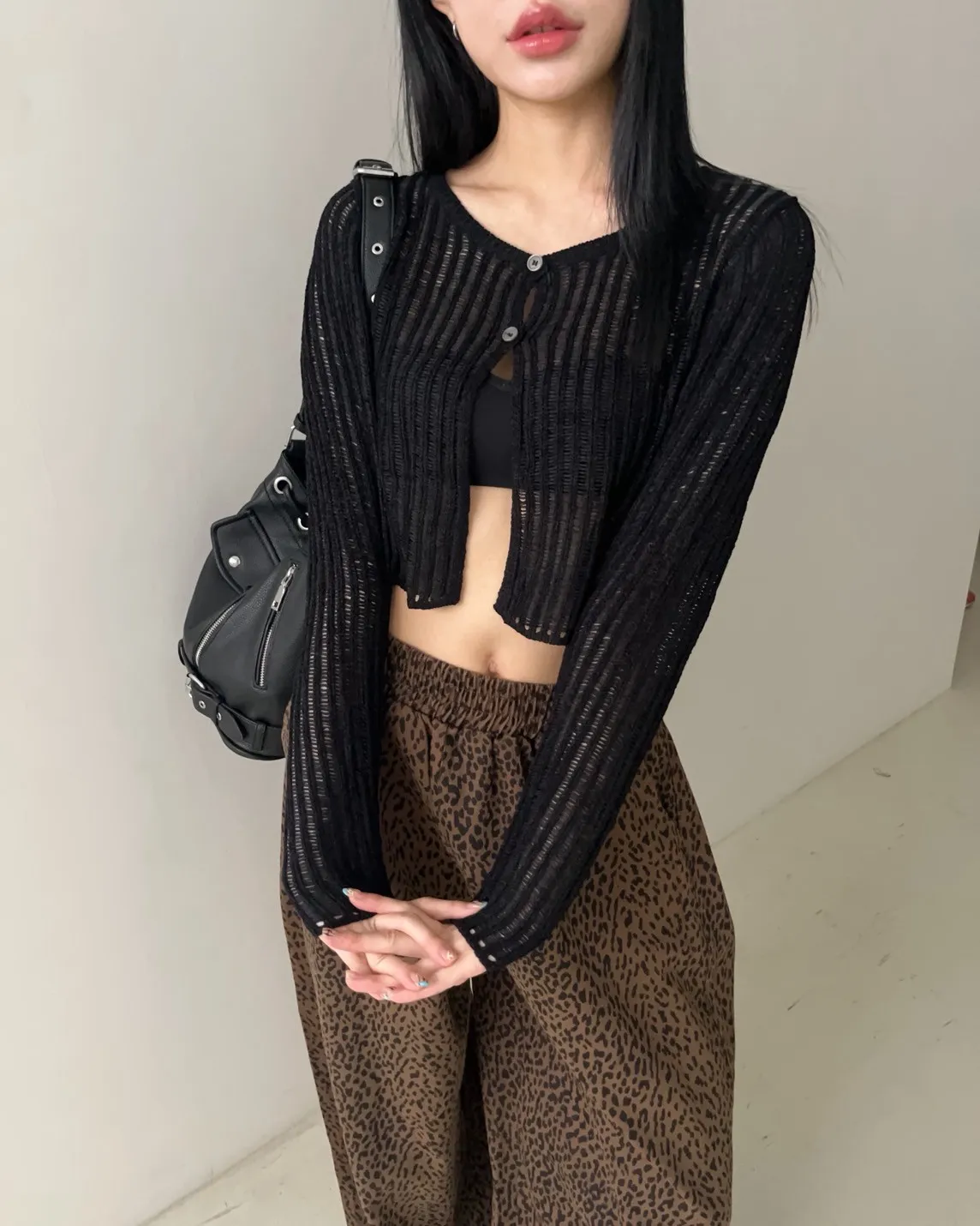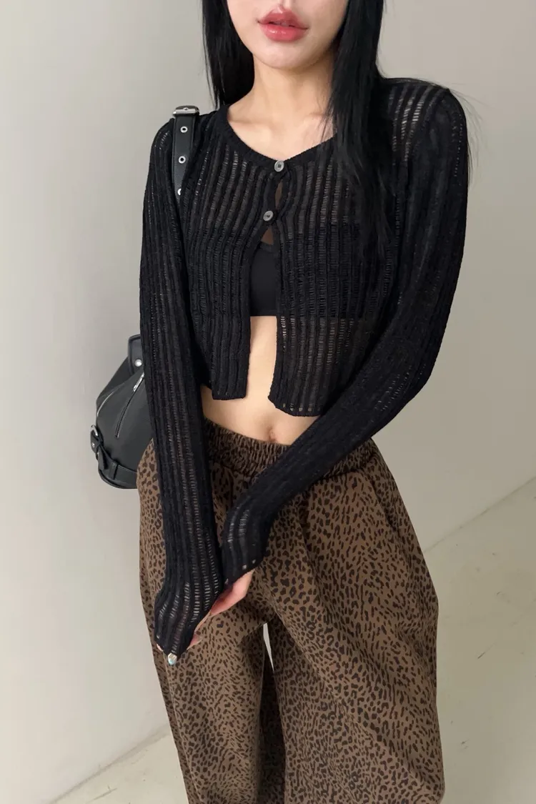 圈圈毛線針織 直條紋鏤空 同色系鈕扣 兩扣 短版