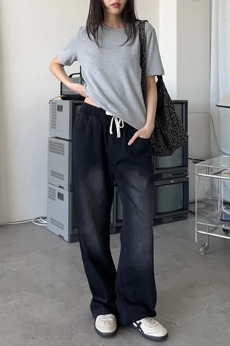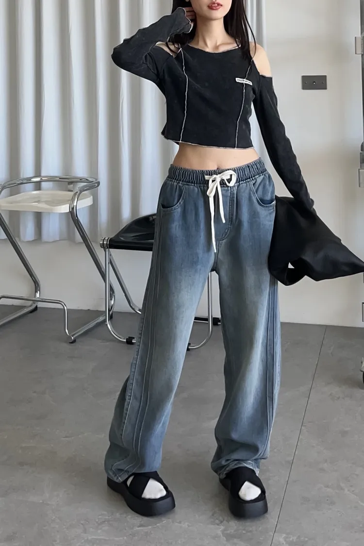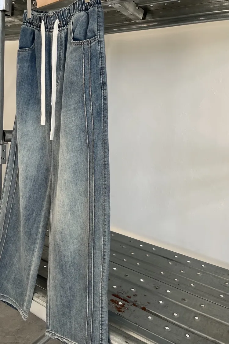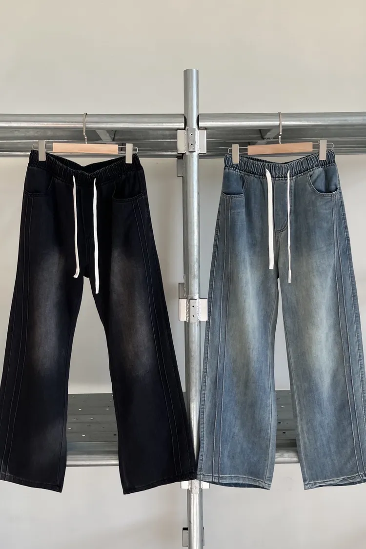 U0053閒暇時光抽繩軟料牛仔褲(藍/黑灰)