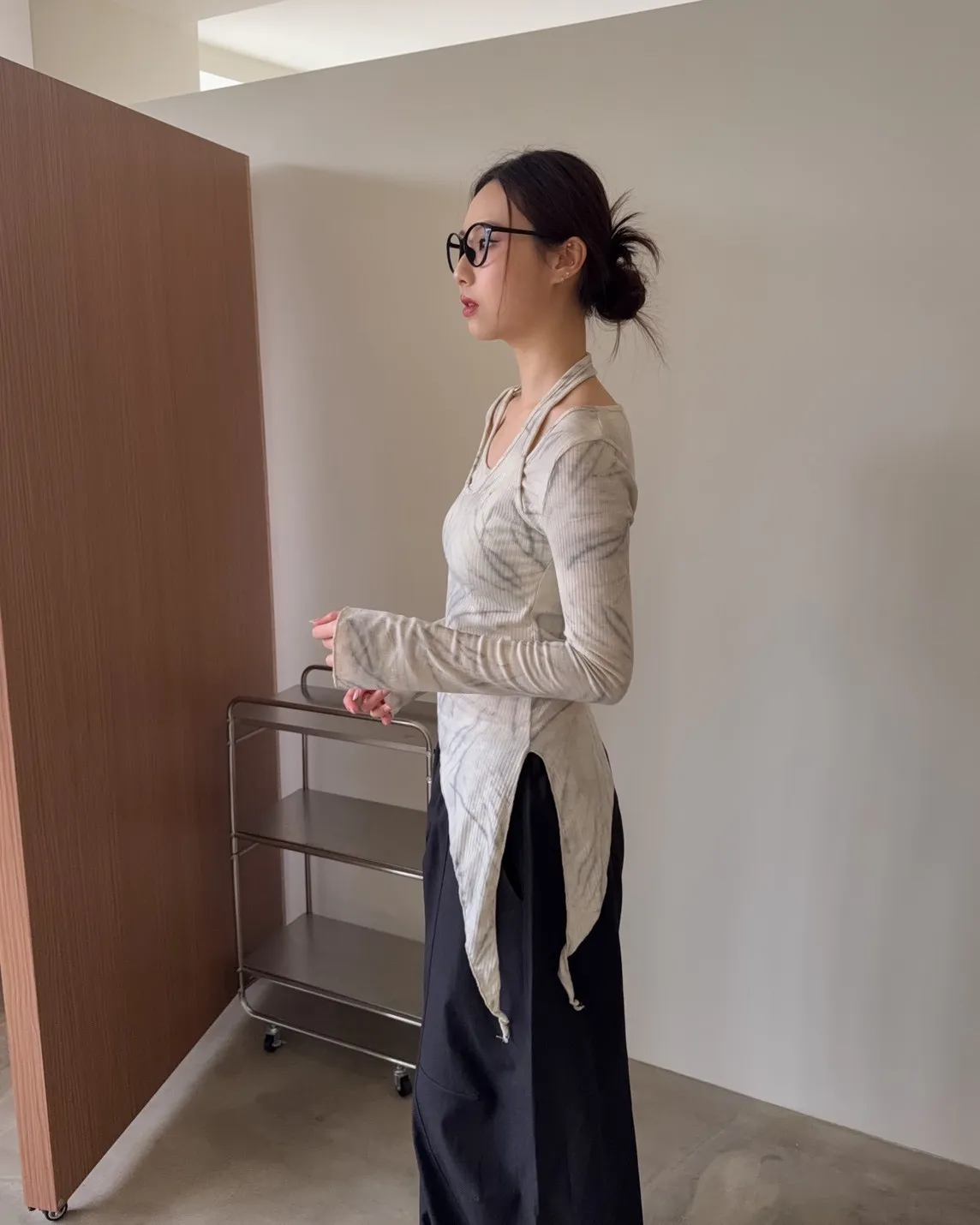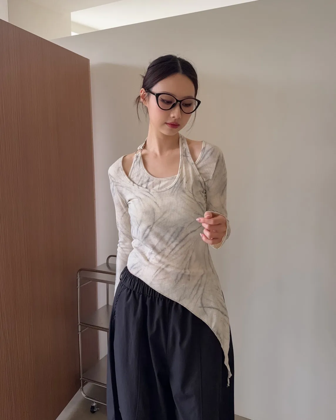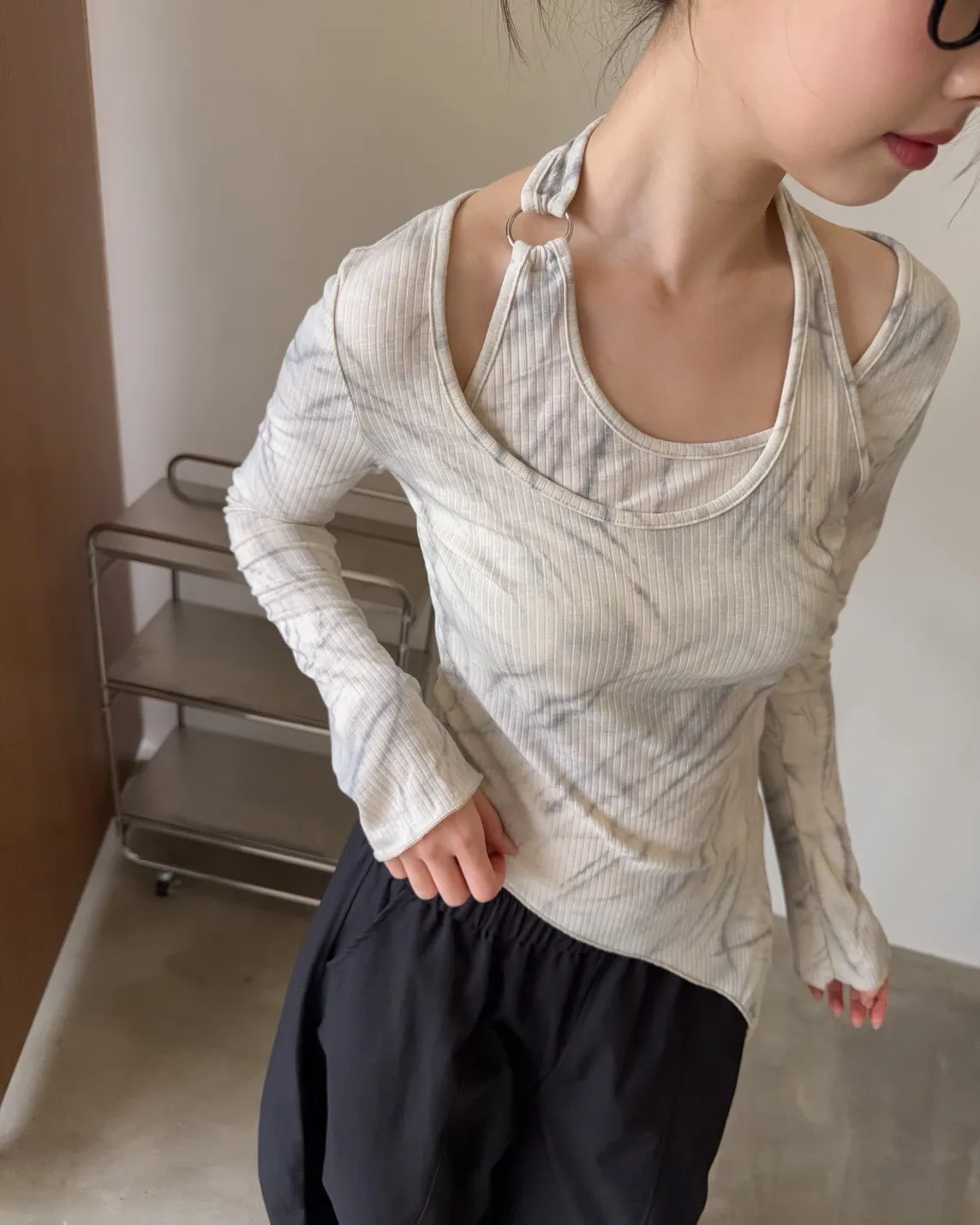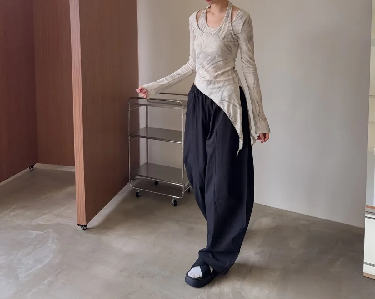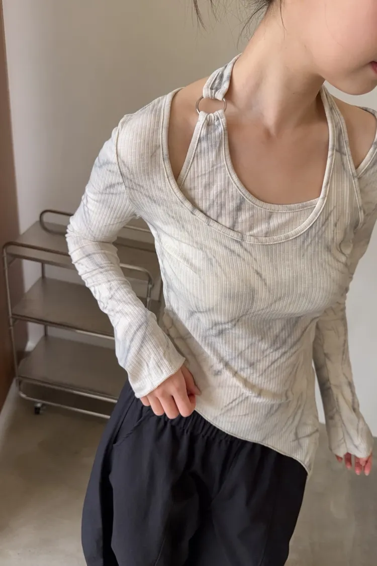 假兩件金屬環繞頸 斜切下擺 暈染造型 坑紋