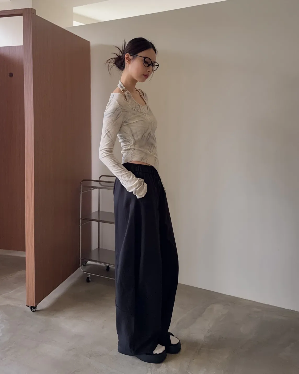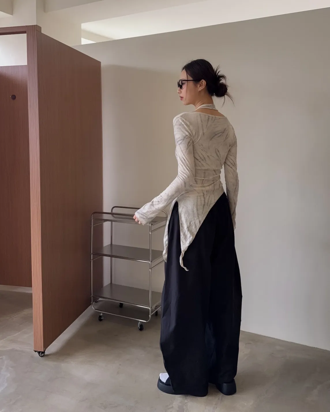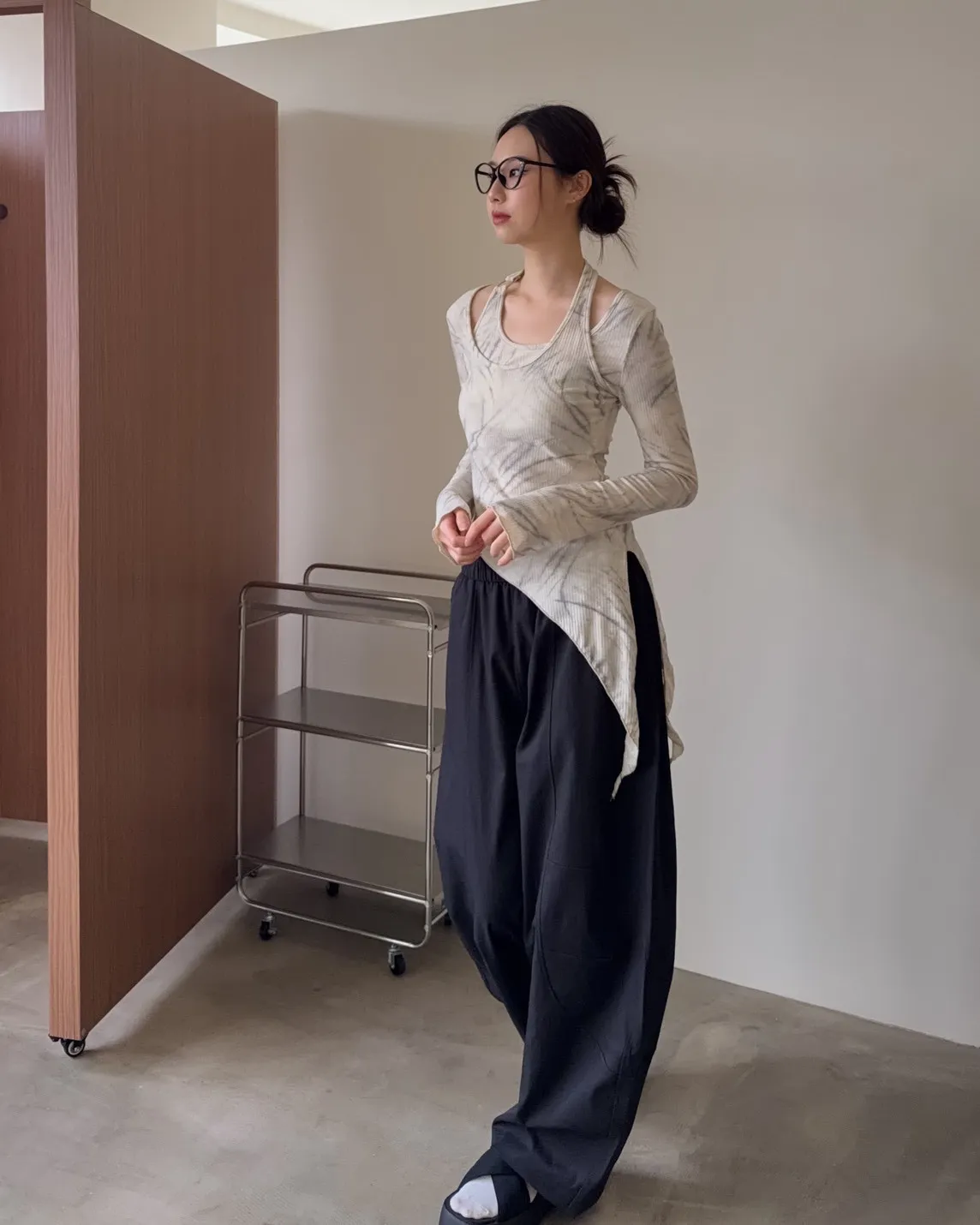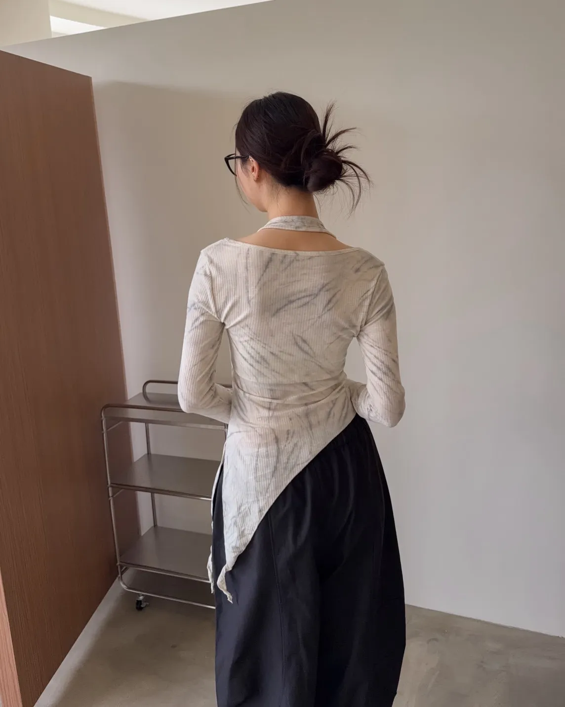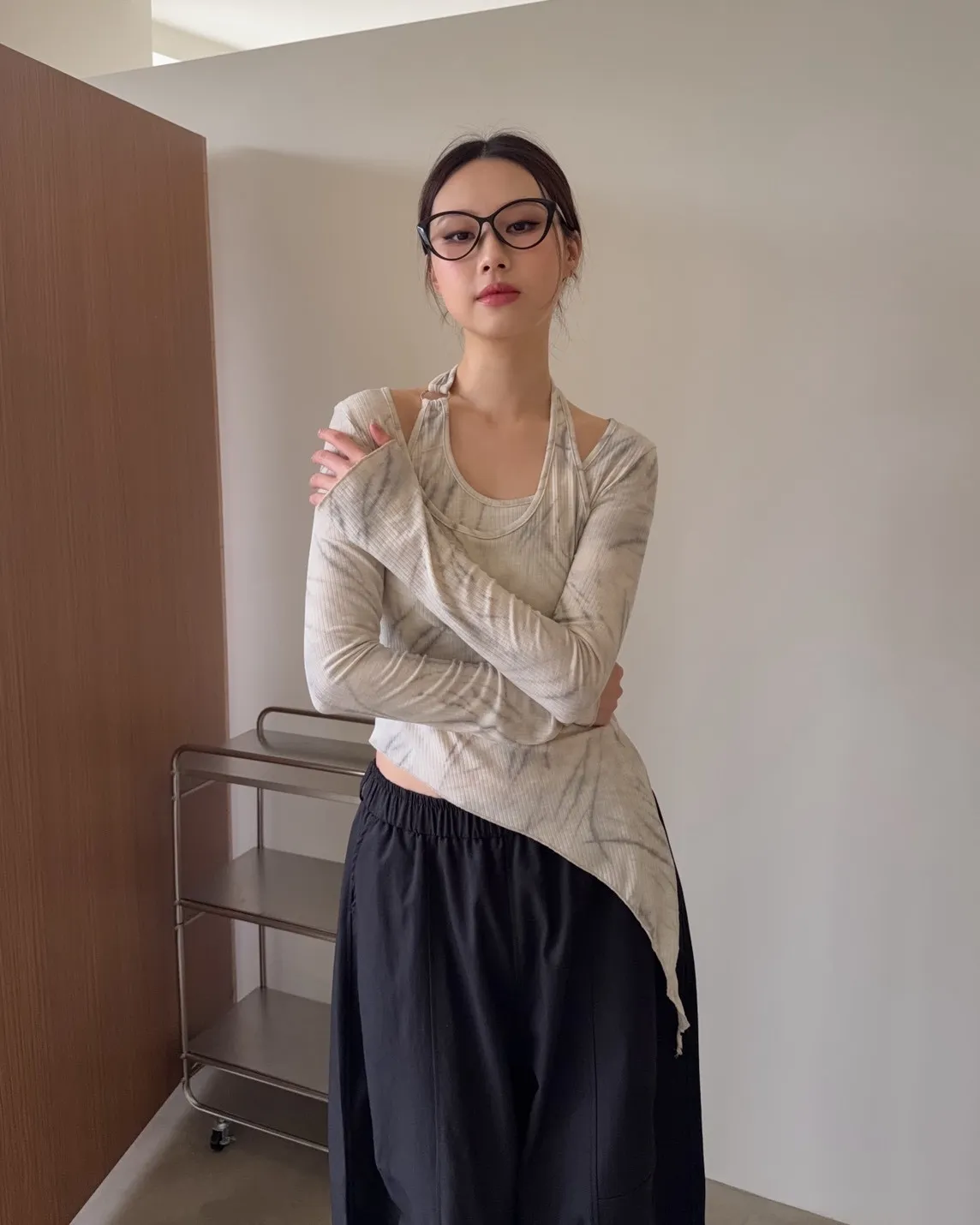 假兩件金屬環繞頸 斜切下擺 暈染造型 坑紋