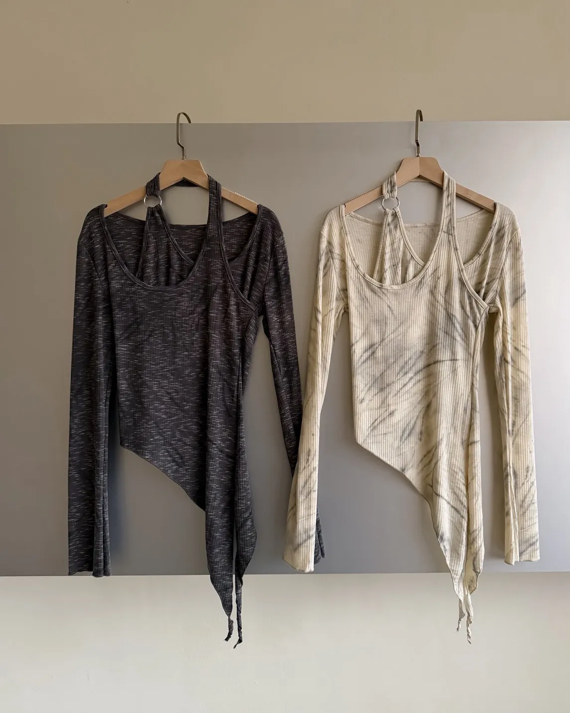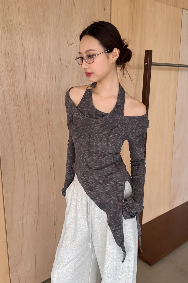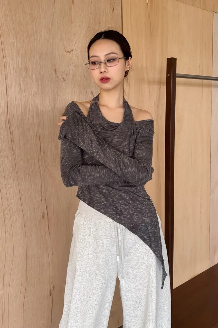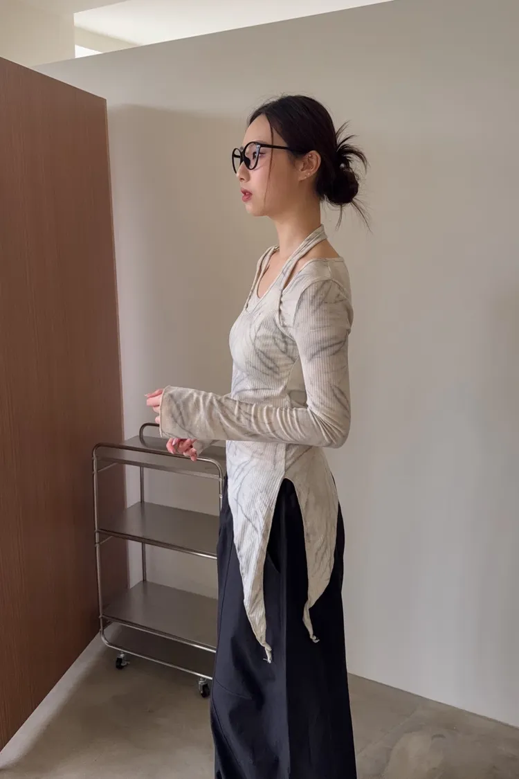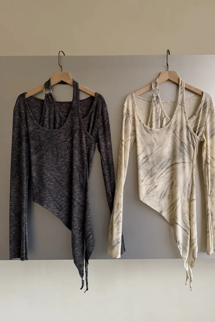 A0005不規則繞頸暈染上衣(杏/深灰)