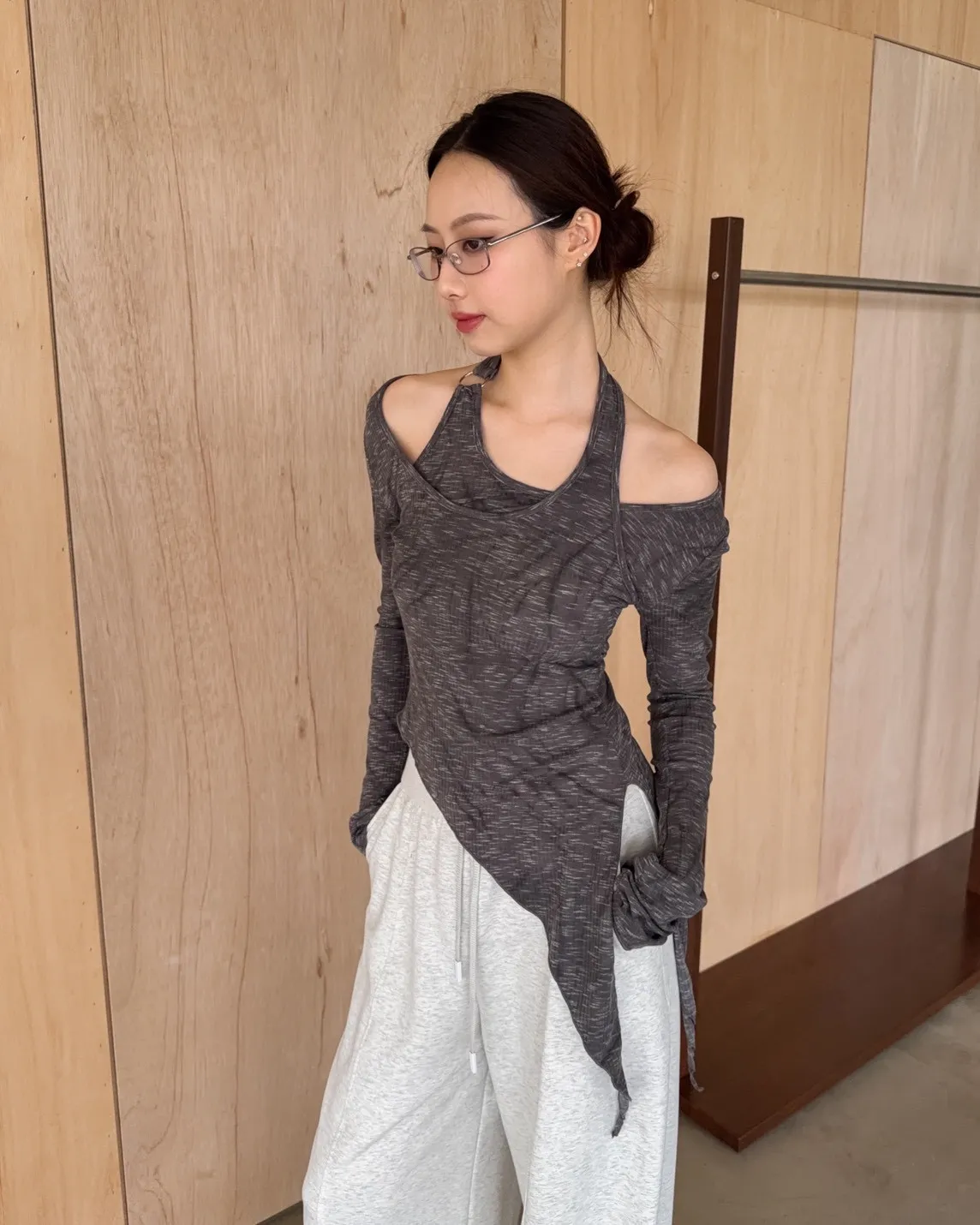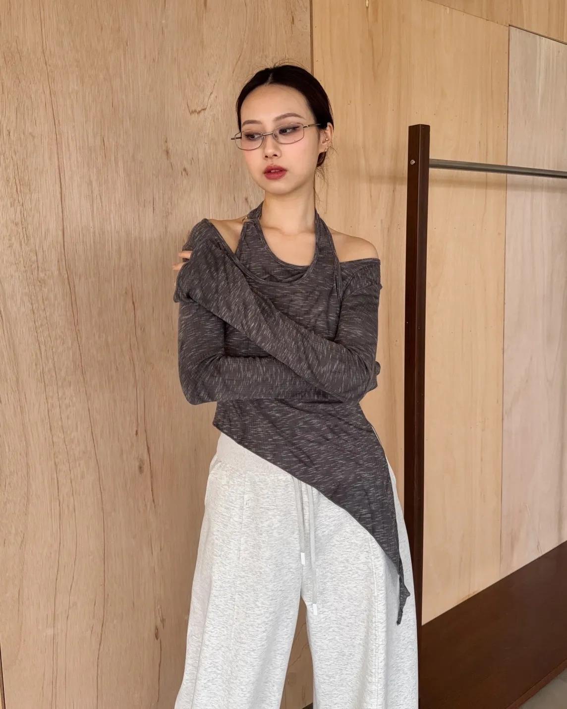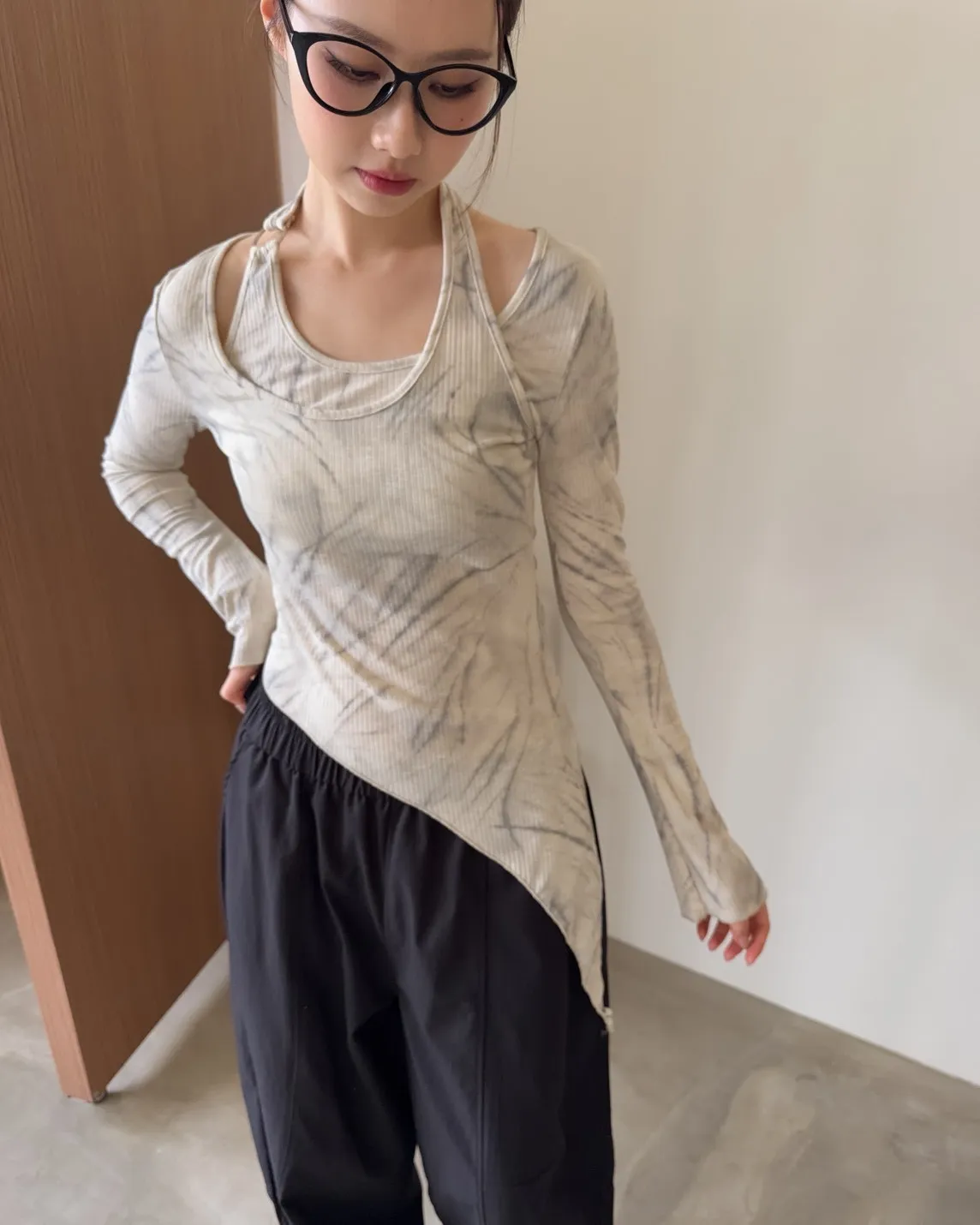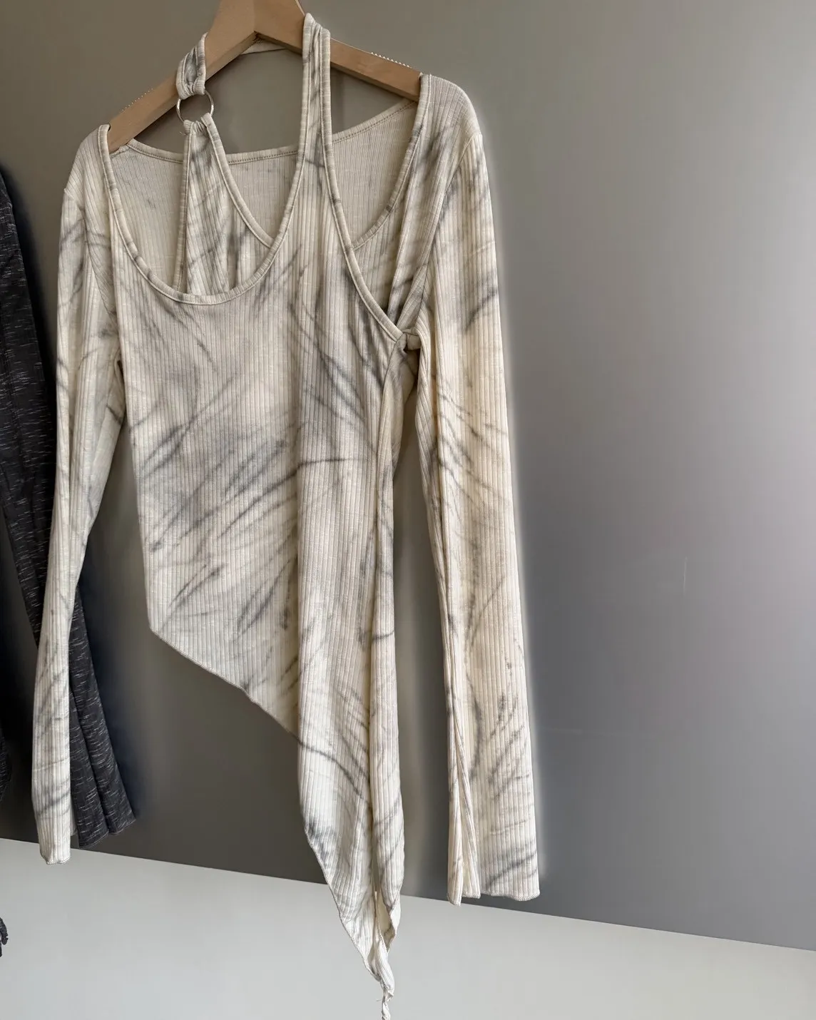 A0005不規則繞頸暈染上衣(杏/深灰)