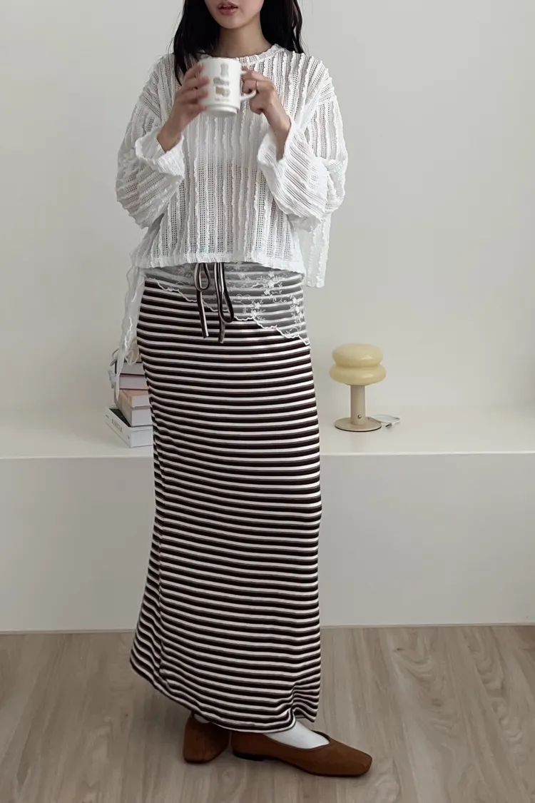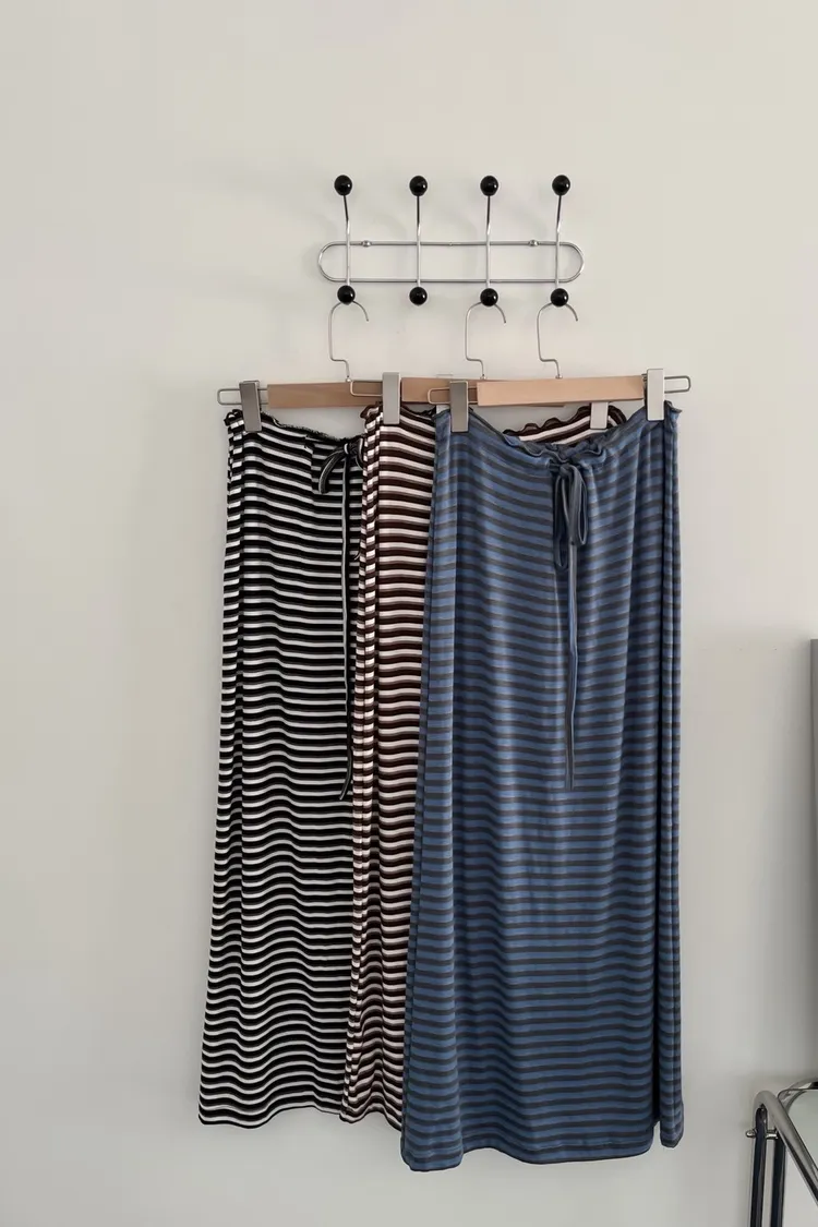 U0028配色條紋腰抽繩棉裙(咖啡/藍/黑)