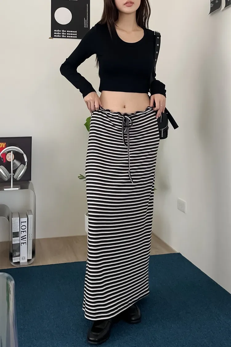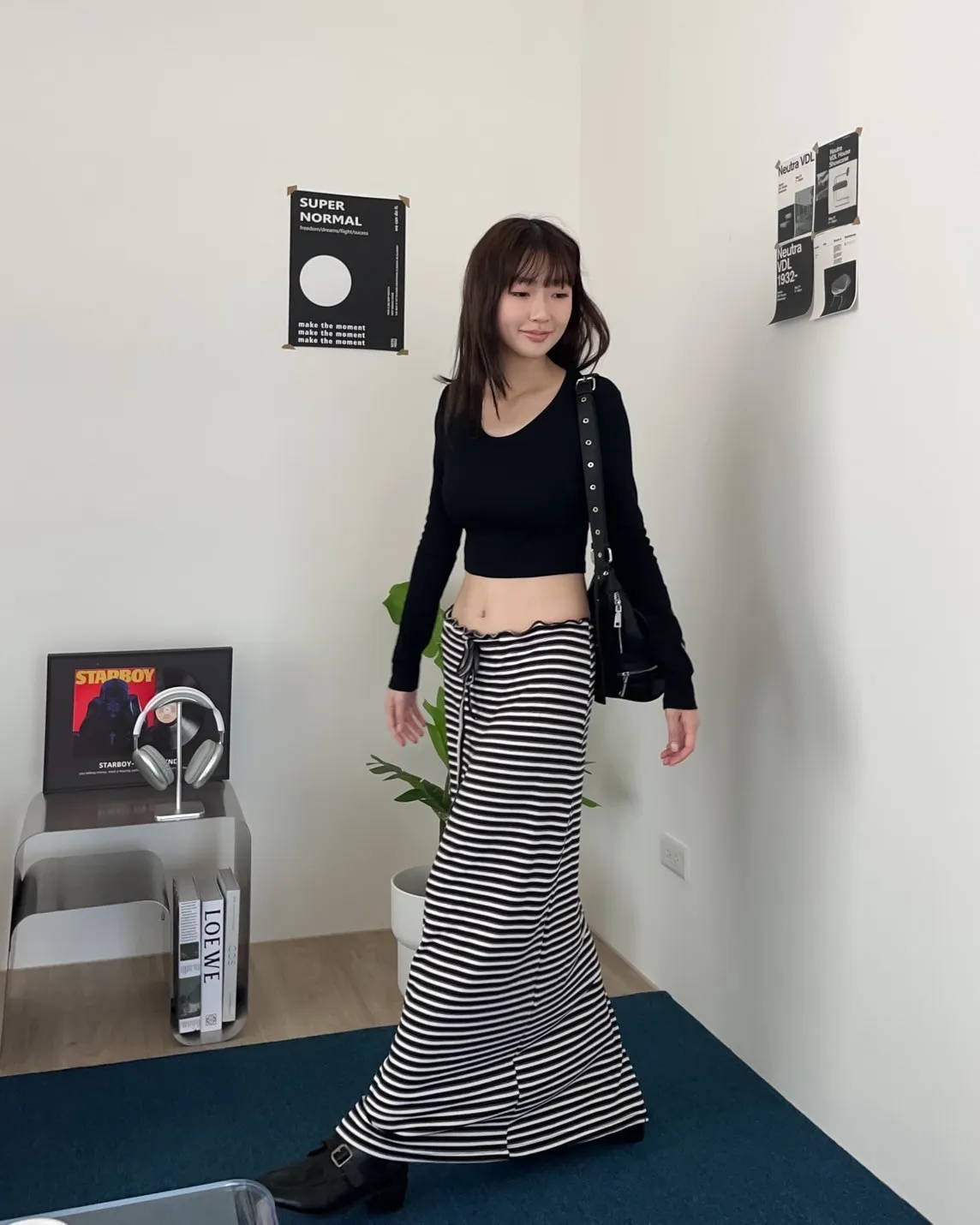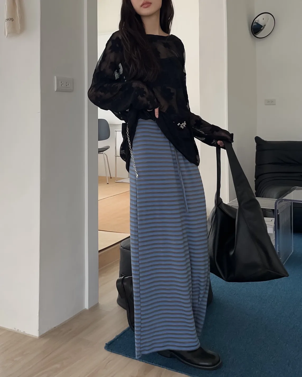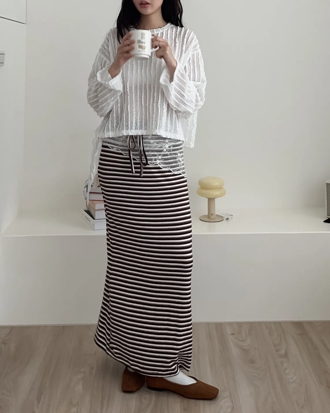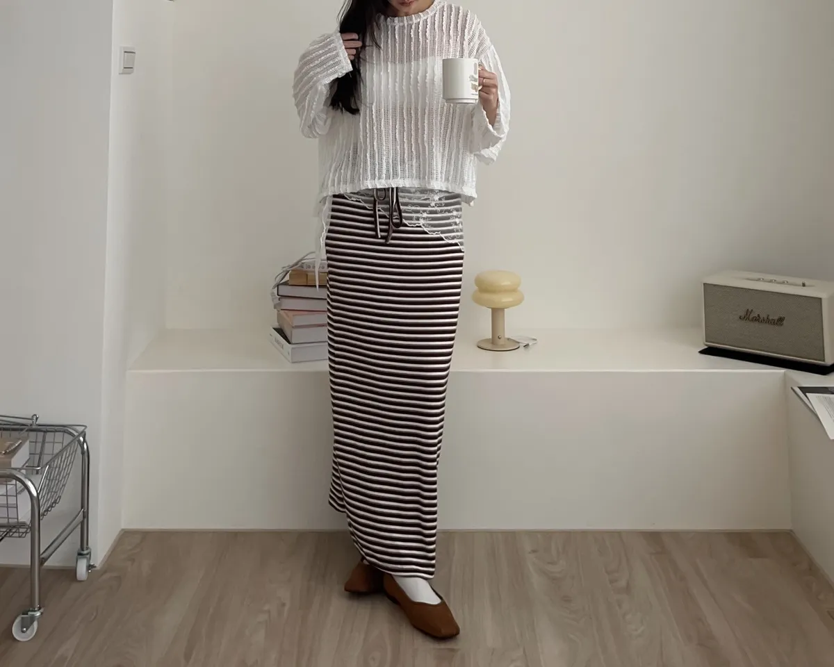 抽繩全鬆緊 建議尺寸S-XL(會貼臀) 無口袋 花苞腰頭鬆緊 可以穿低腰 後開岔 配色橫條紋 棉料彈性很好