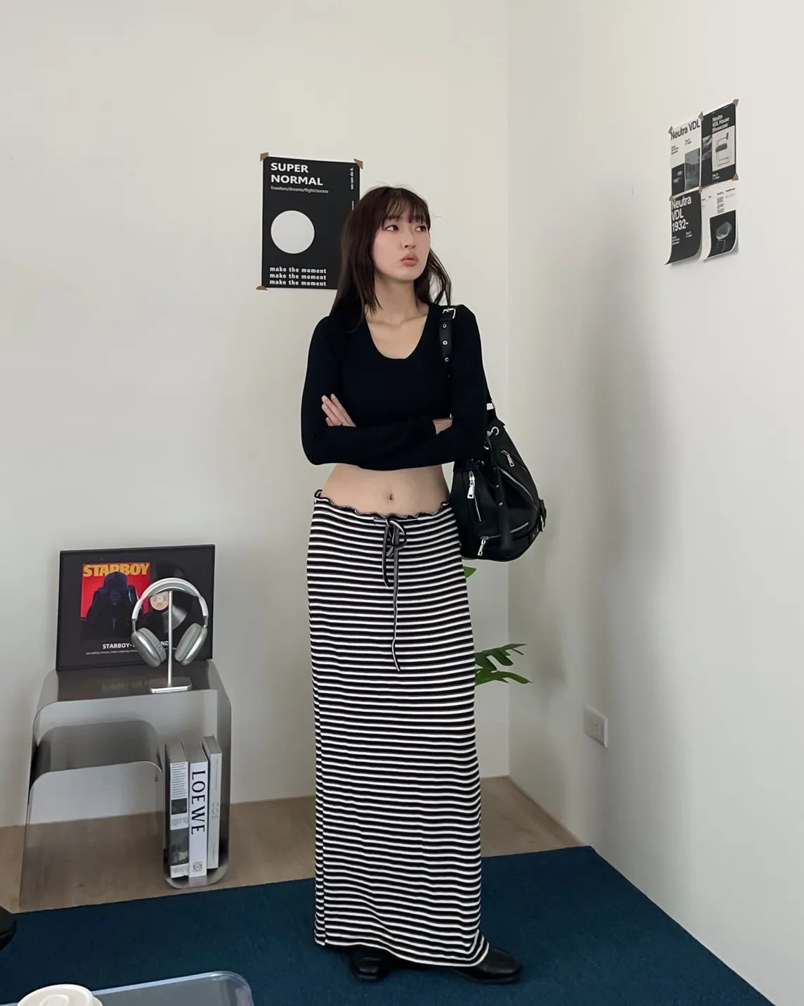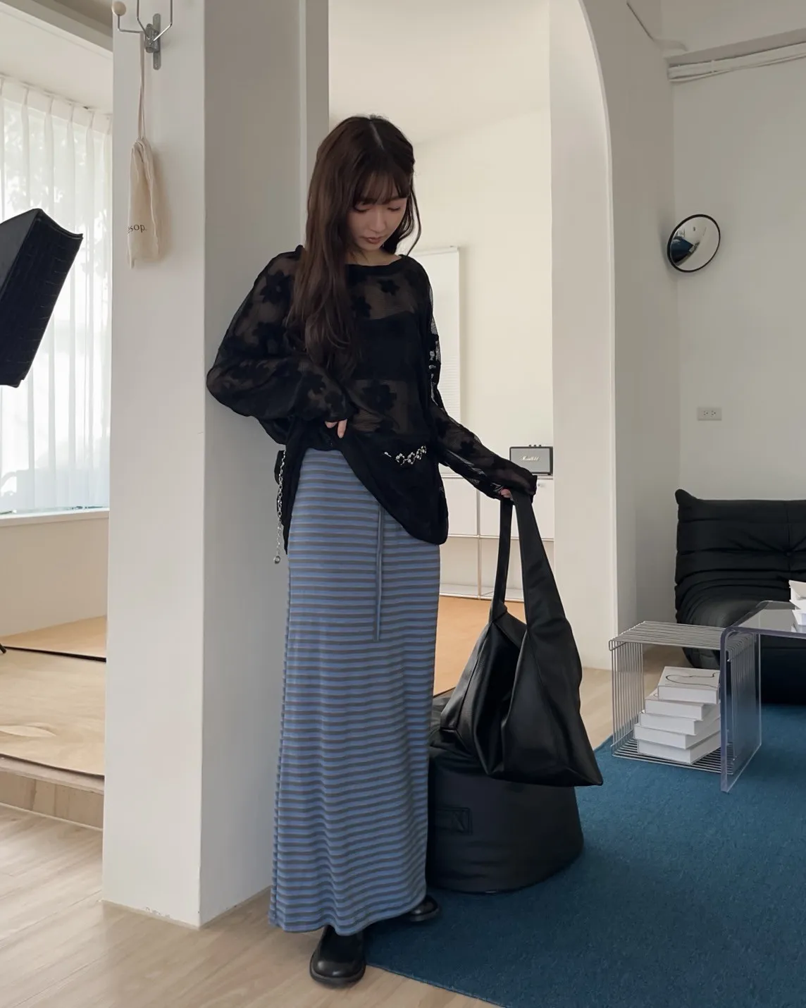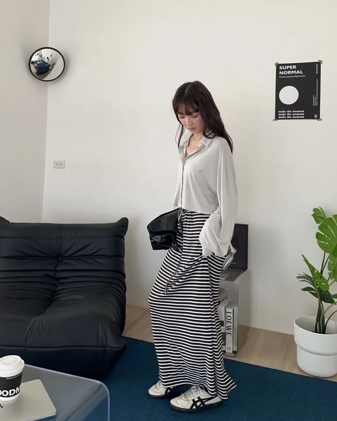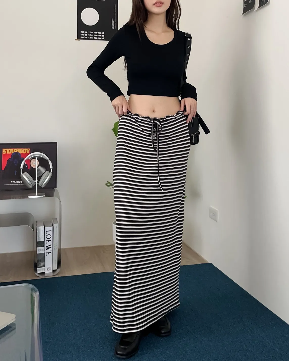 抽繩全鬆緊 建議尺寸S-XL(會貼臀) 無口袋 花苞腰頭鬆緊 可以穿低腰 後開岔 配色橫條紋 棉料彈性很好