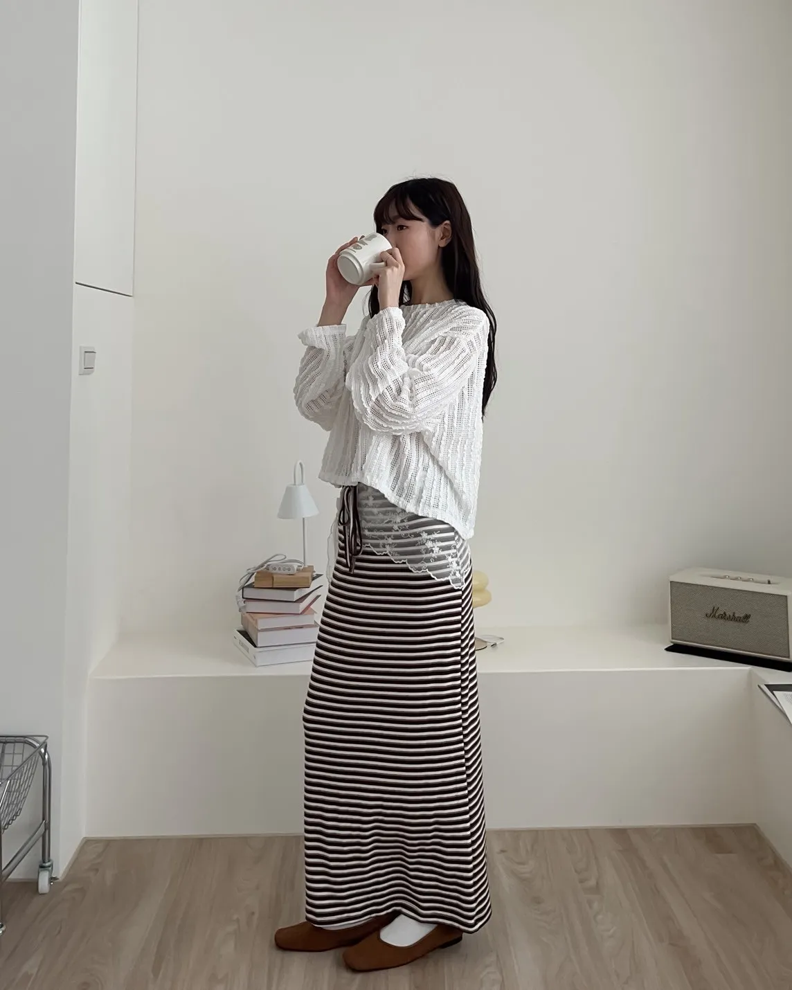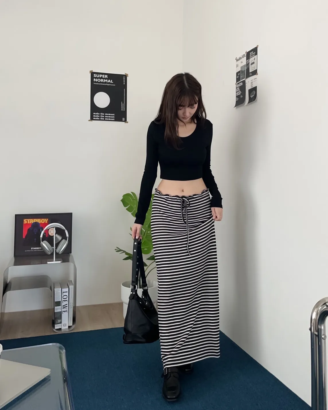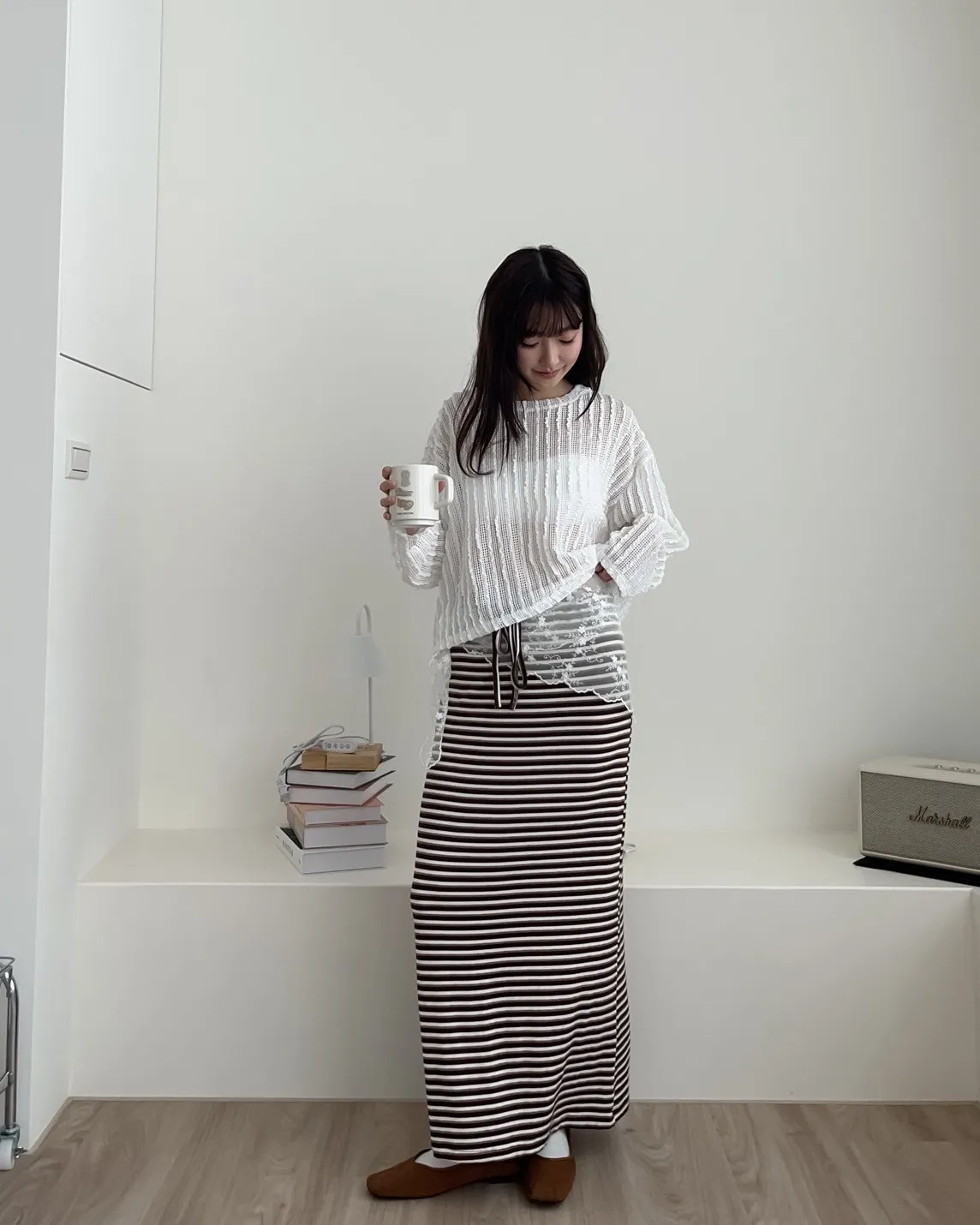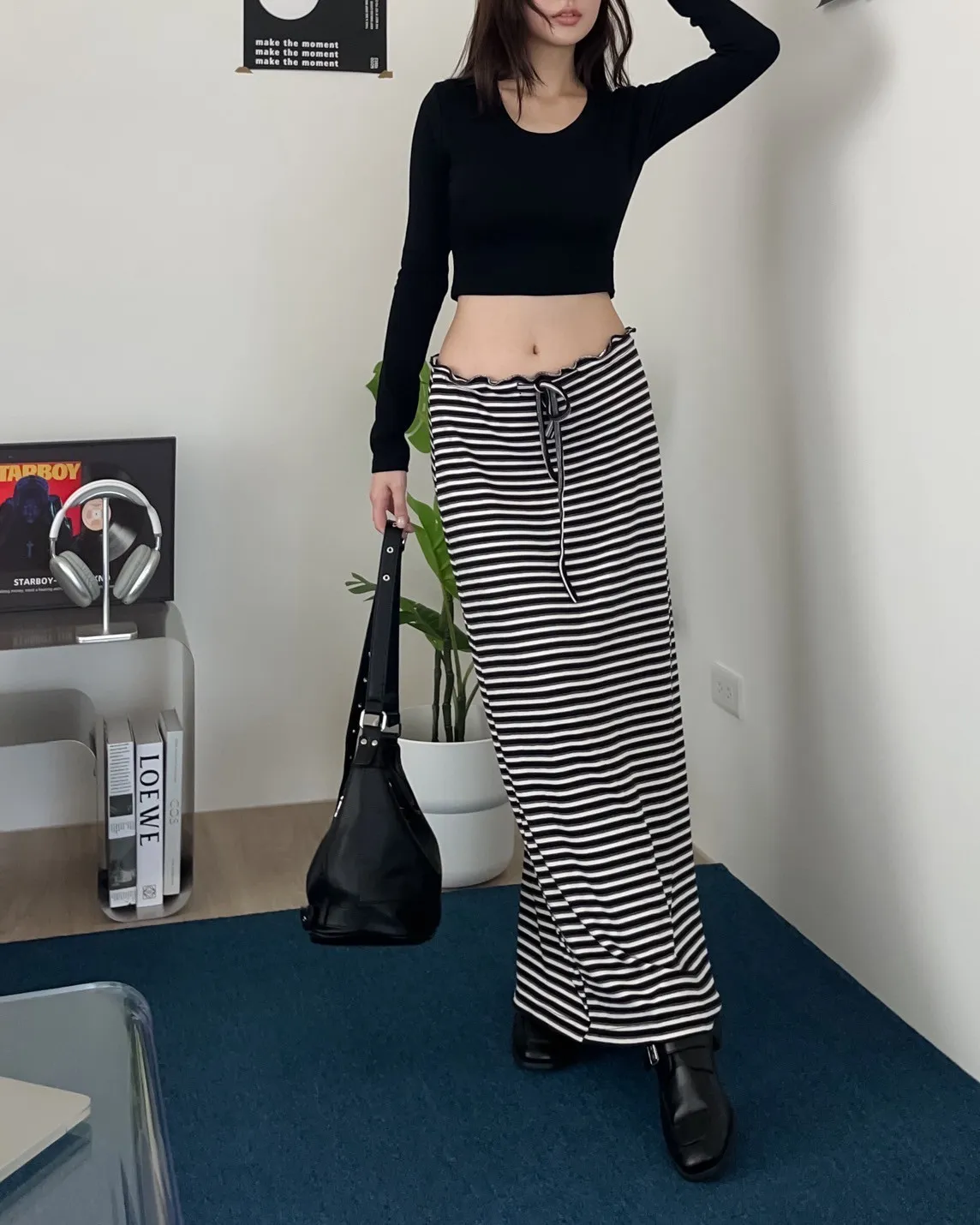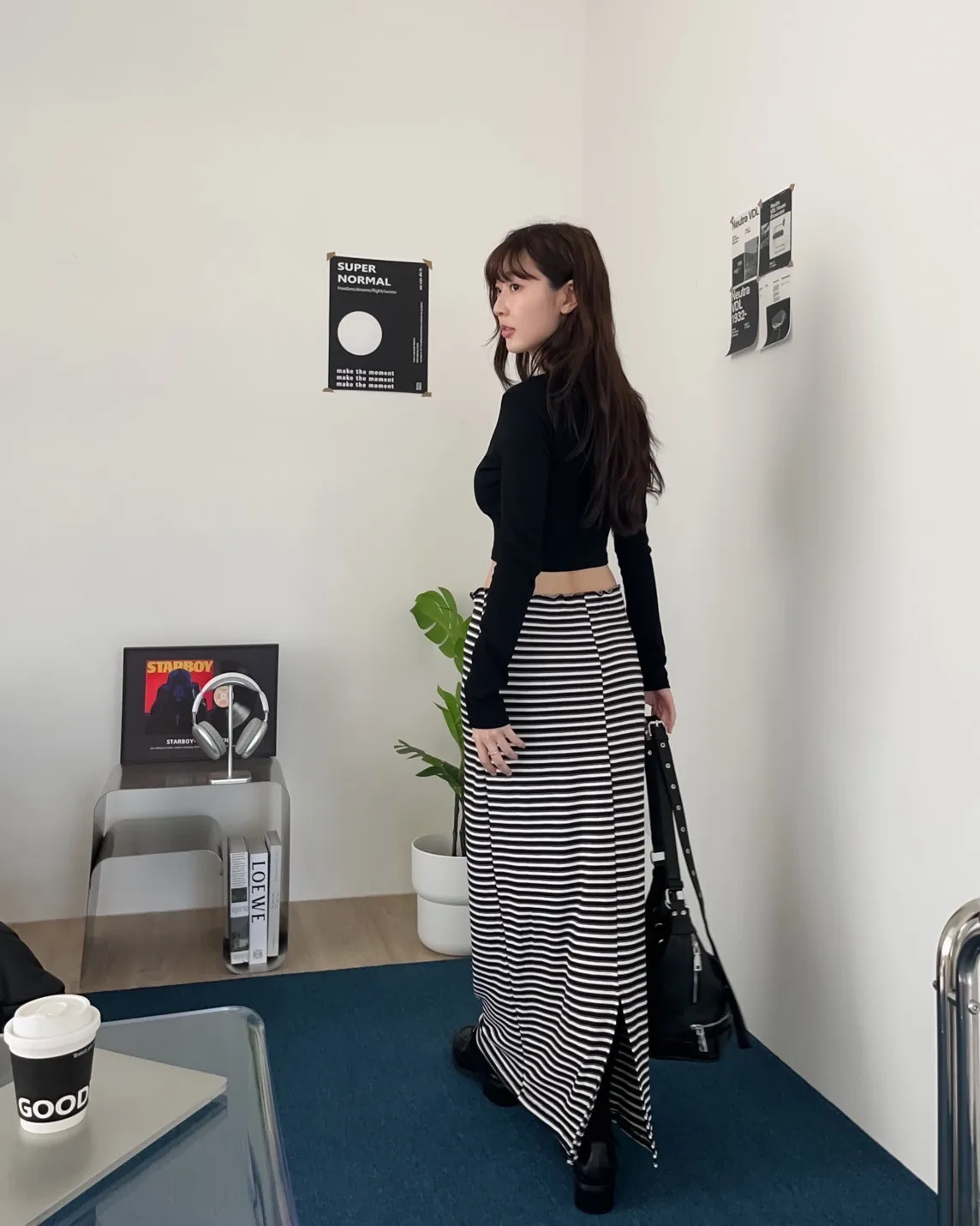 抽繩全鬆緊 建議尺寸S-XL(會貼臀) 無口袋 花苞腰頭鬆緊 可以穿低腰 後開岔 配色橫條紋 棉料彈性很好