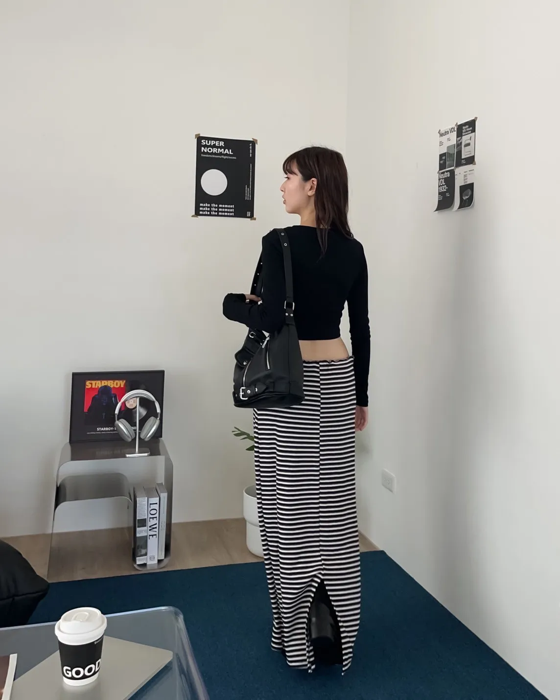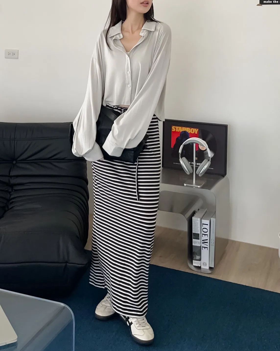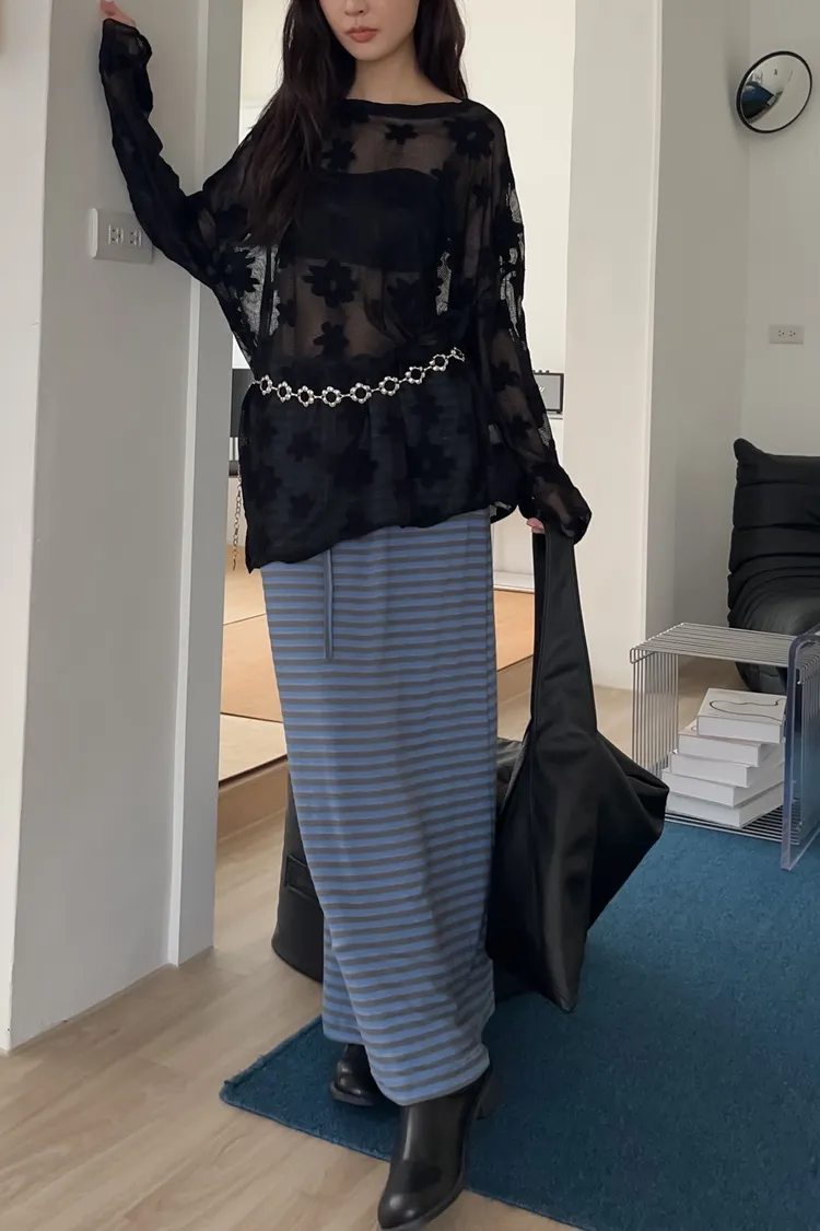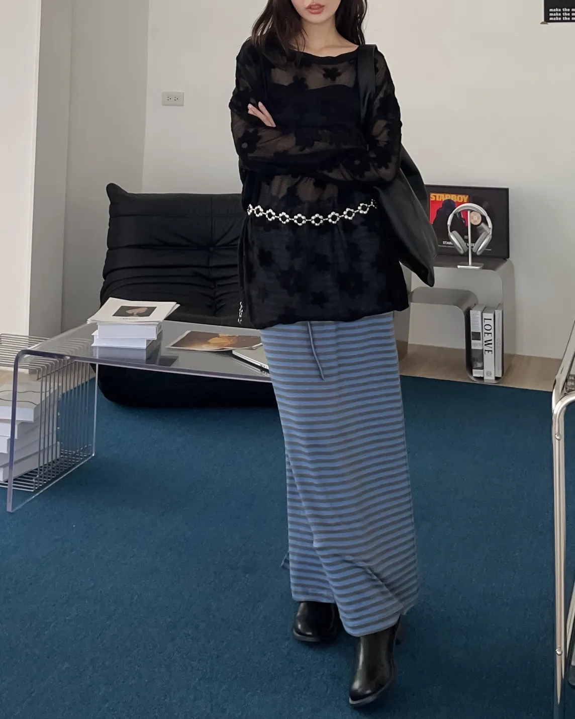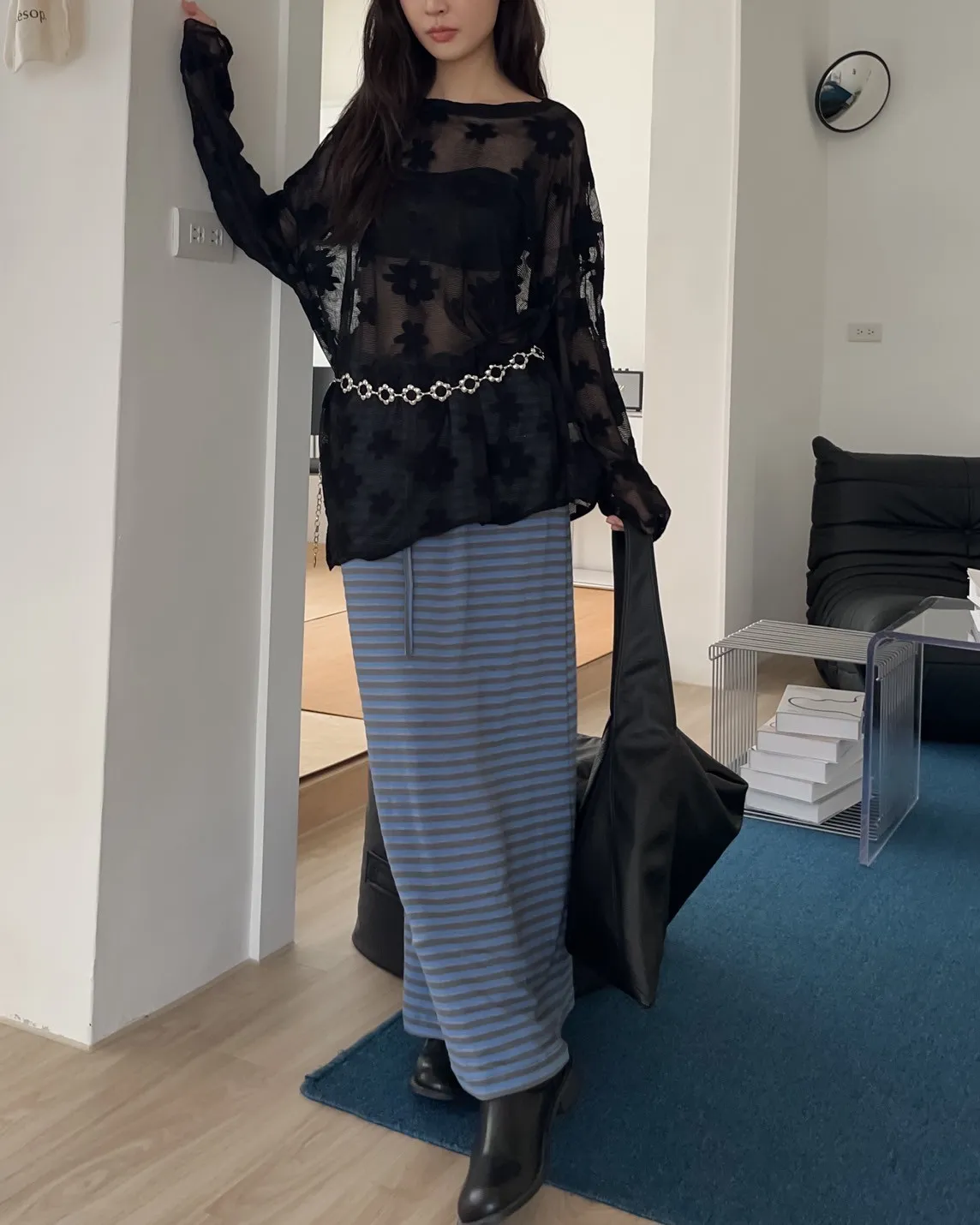 抽繩全鬆緊 建議尺寸S-XL(會貼臀) 無口袋 花苞腰頭鬆緊 可以穿低腰 後開岔 配色橫條紋 棉料彈性很好