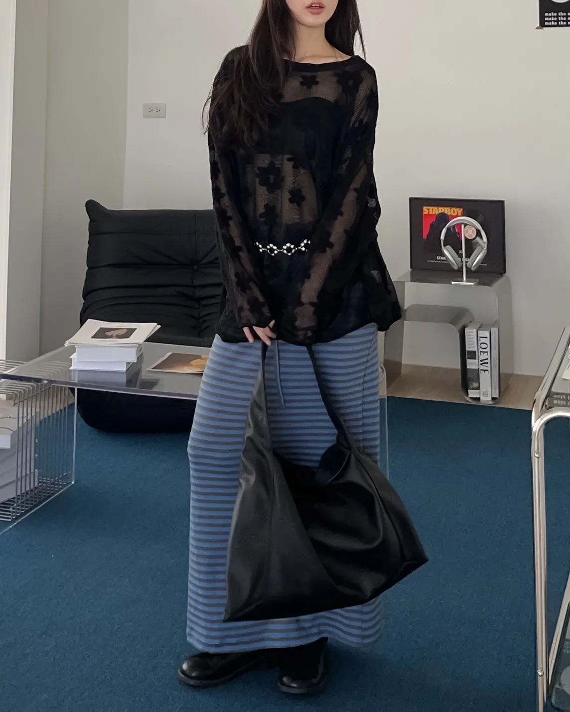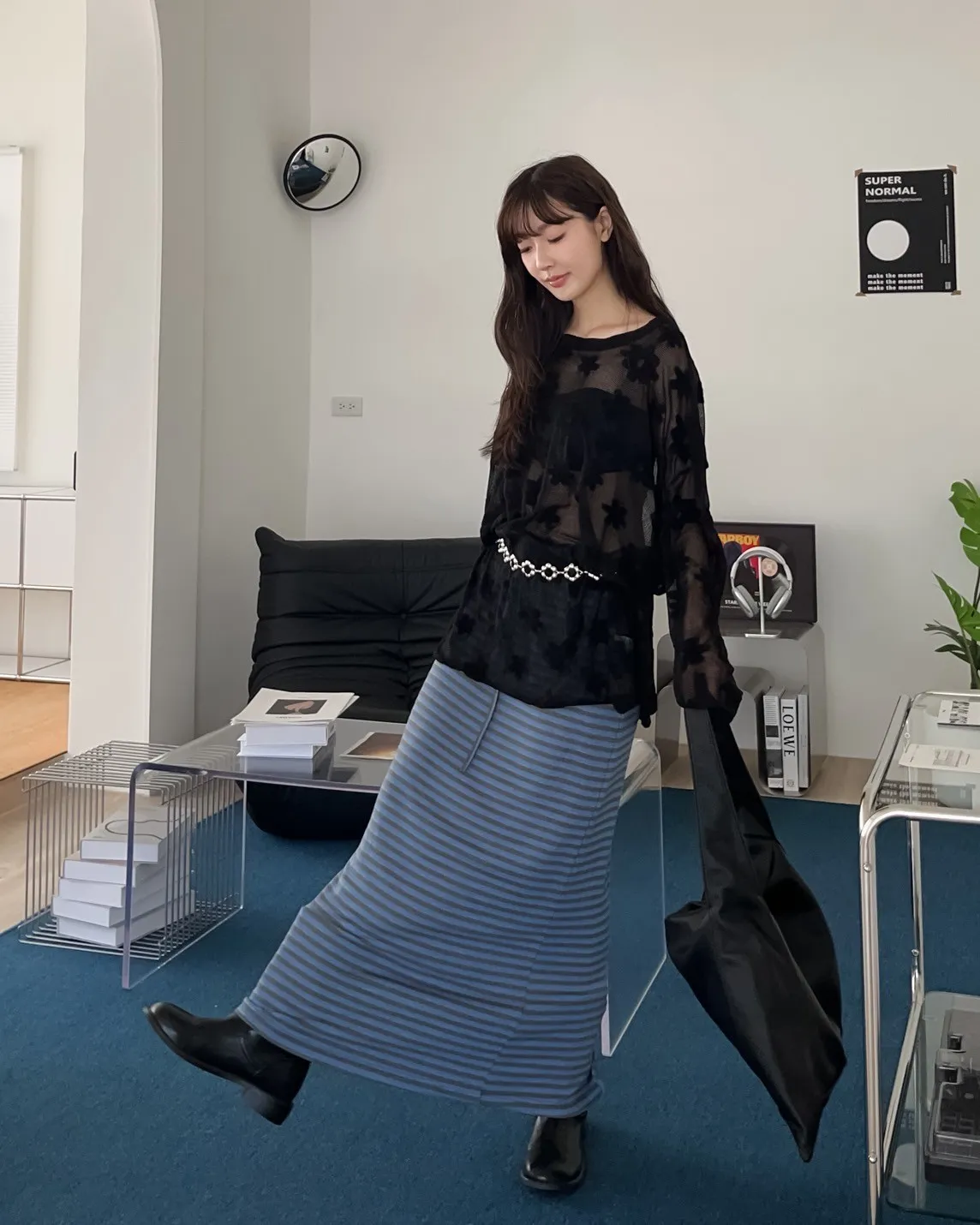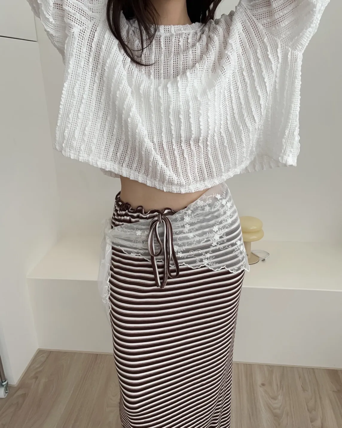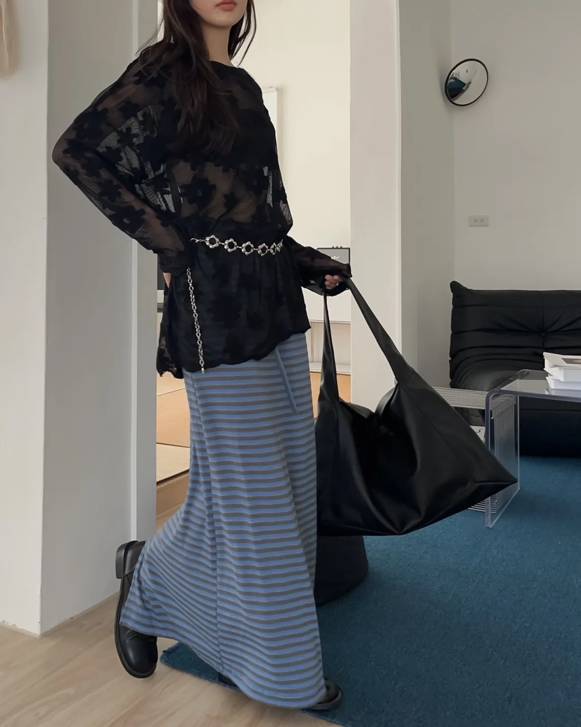 抽繩全鬆緊 建議尺寸S-XL(會貼臀) 無口袋 花苞腰頭鬆緊 可以穿低腰 後開岔 配色橫條紋 棉料彈性很好