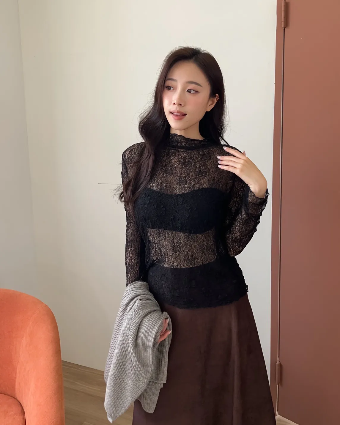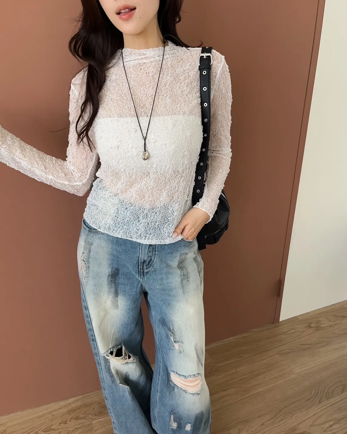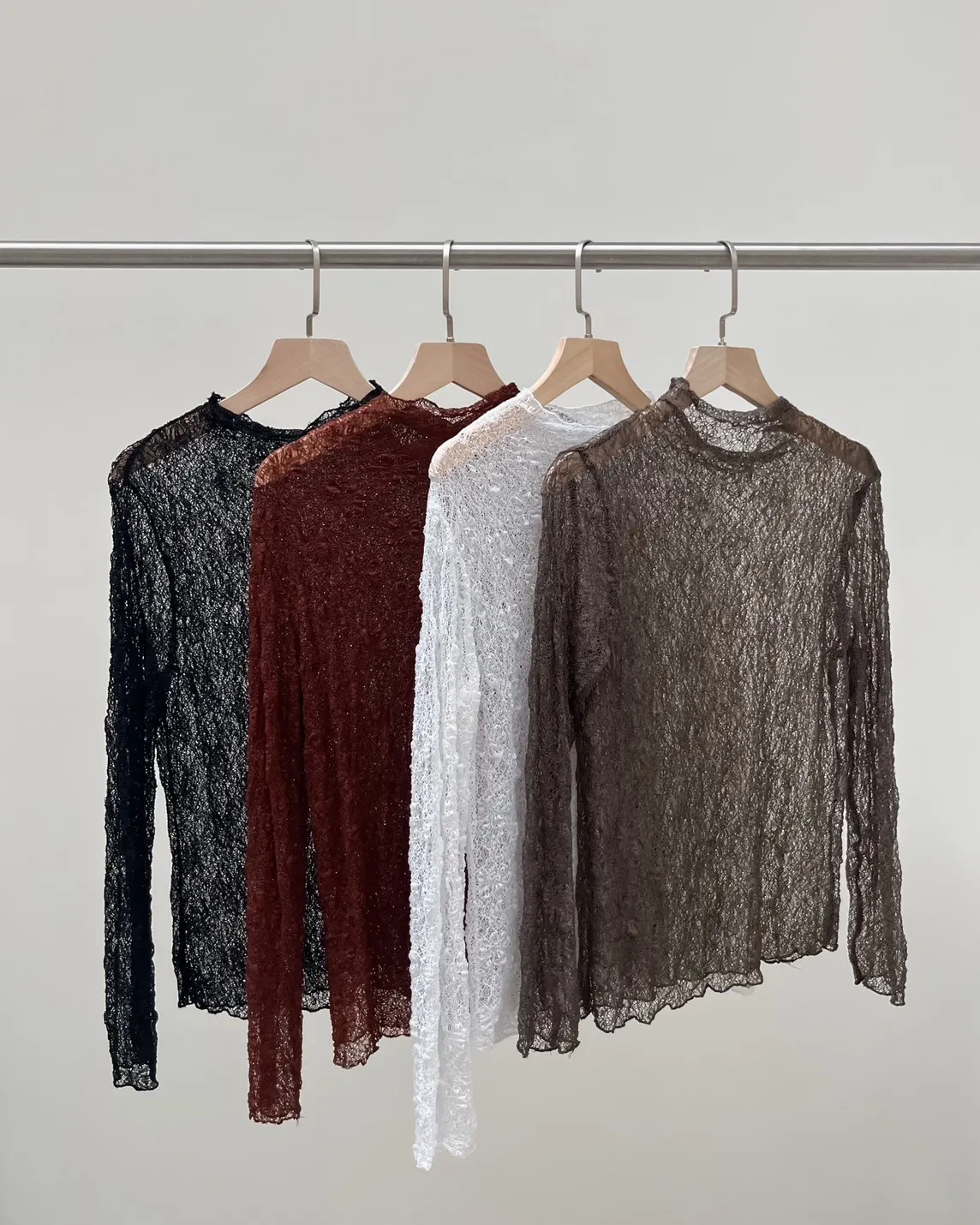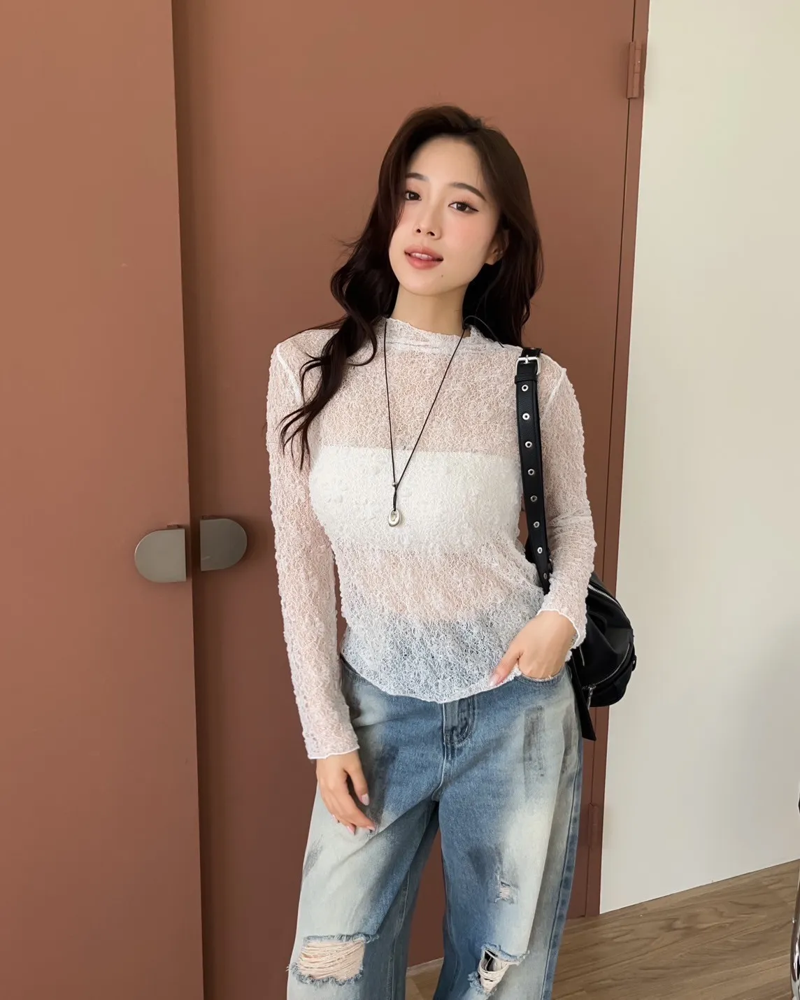U0088毛線團立領透膚上衣(白/咖啡/紅/黑)