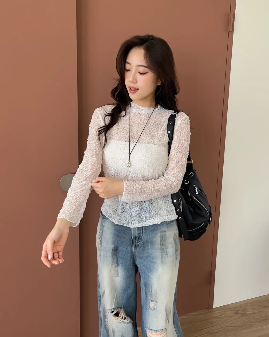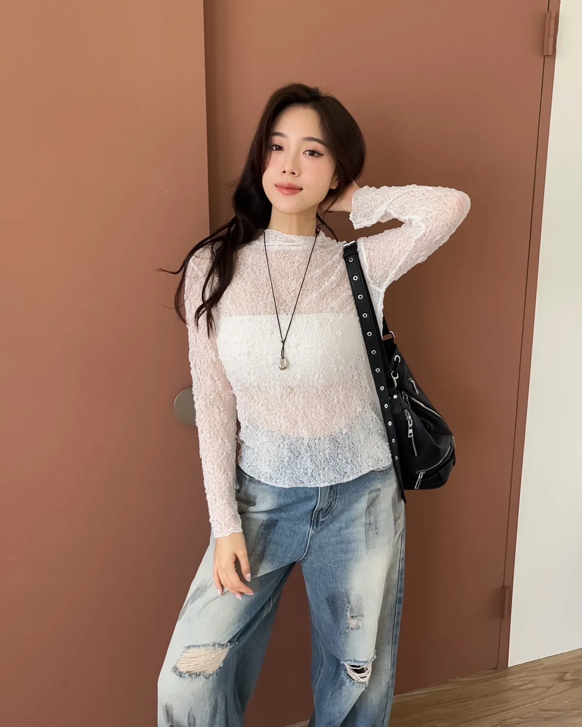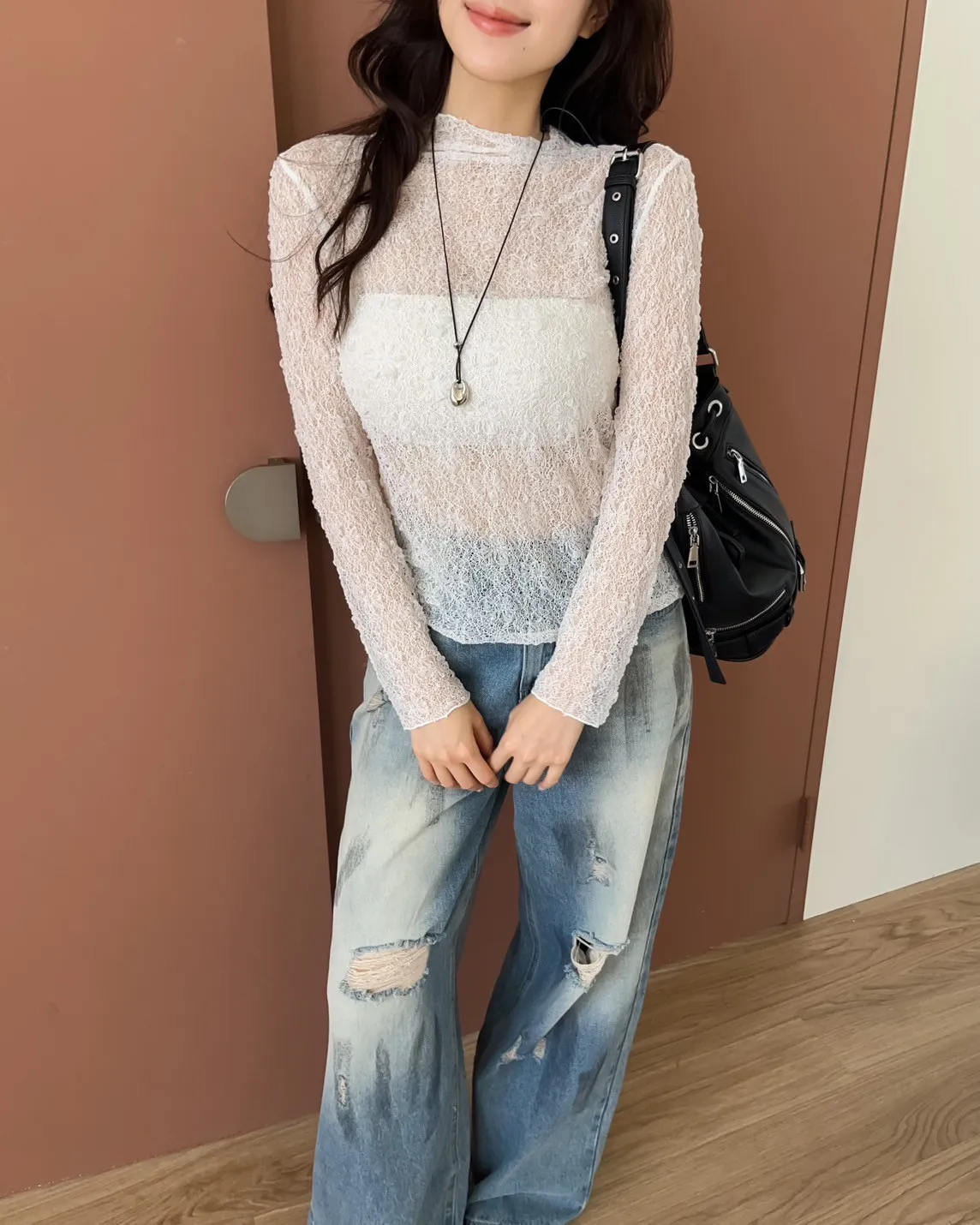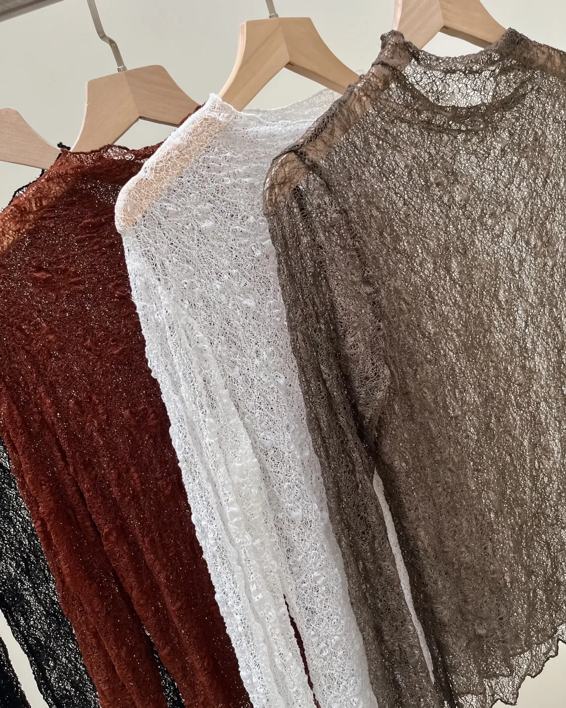 U0088毛線團立領透膚上衣(白/咖啡/紅/黑)