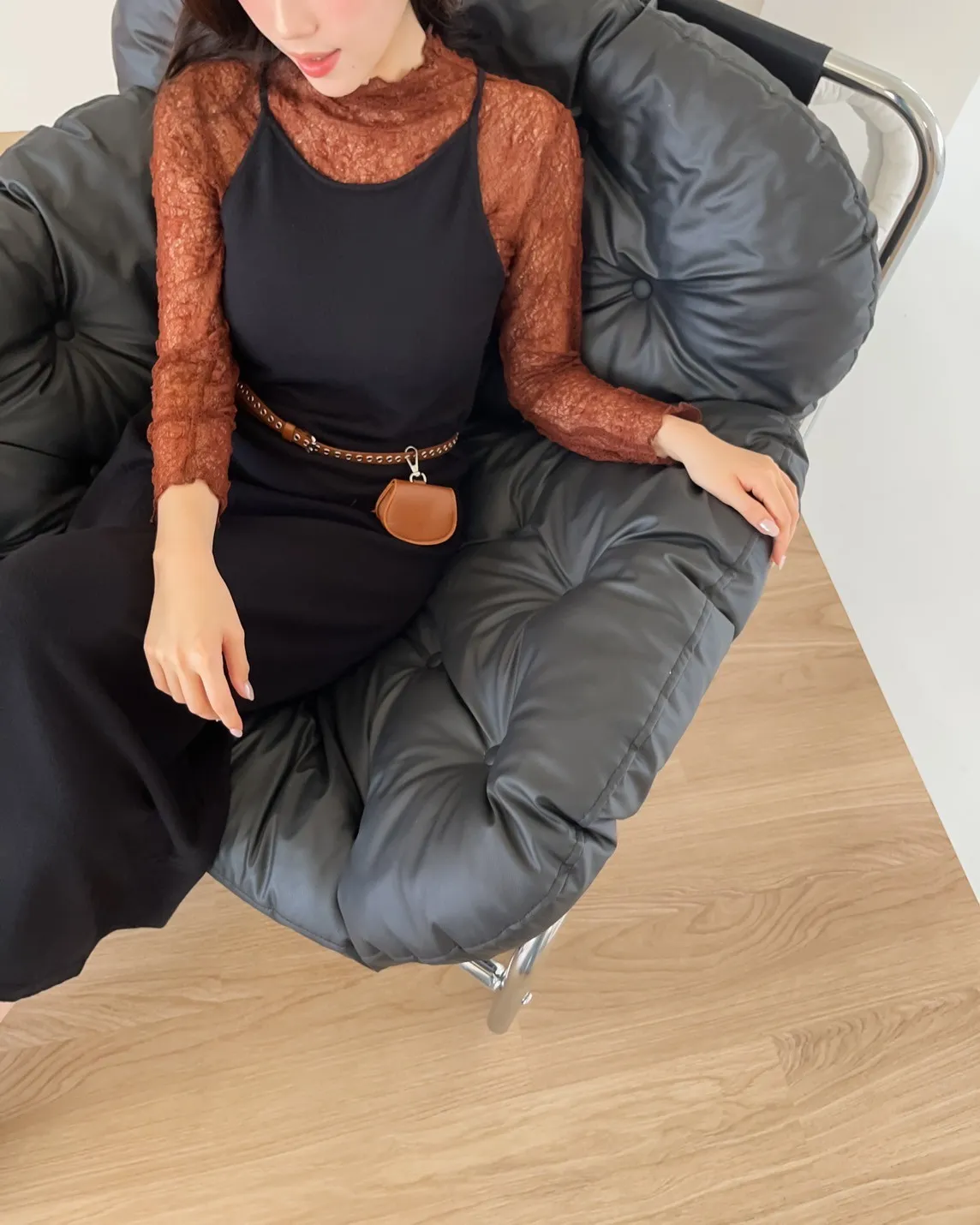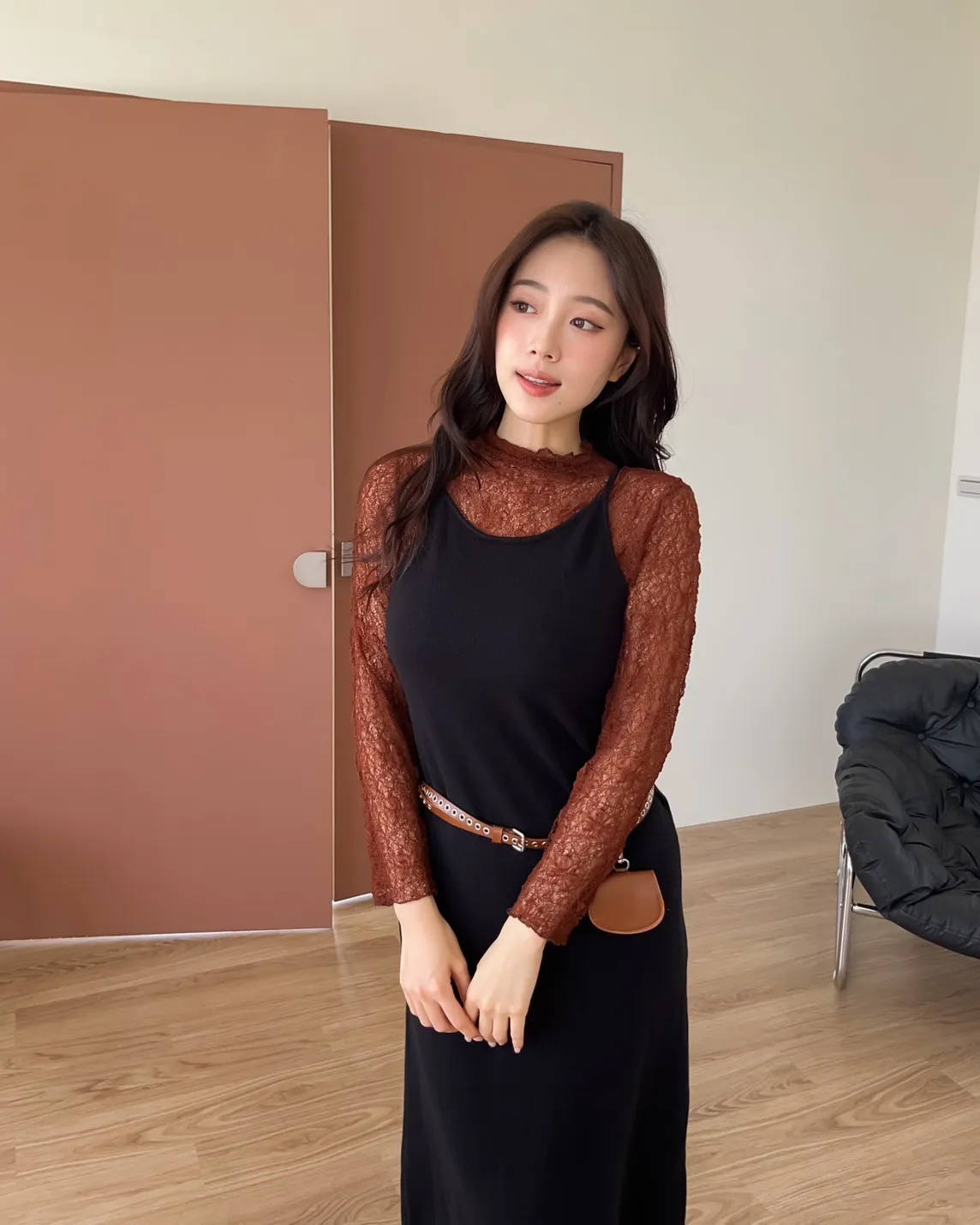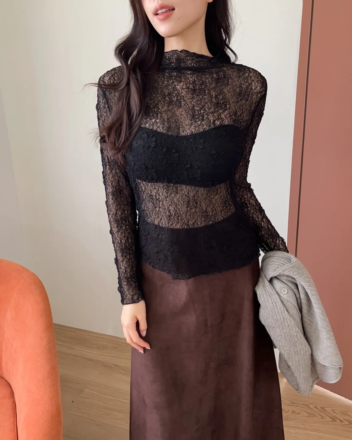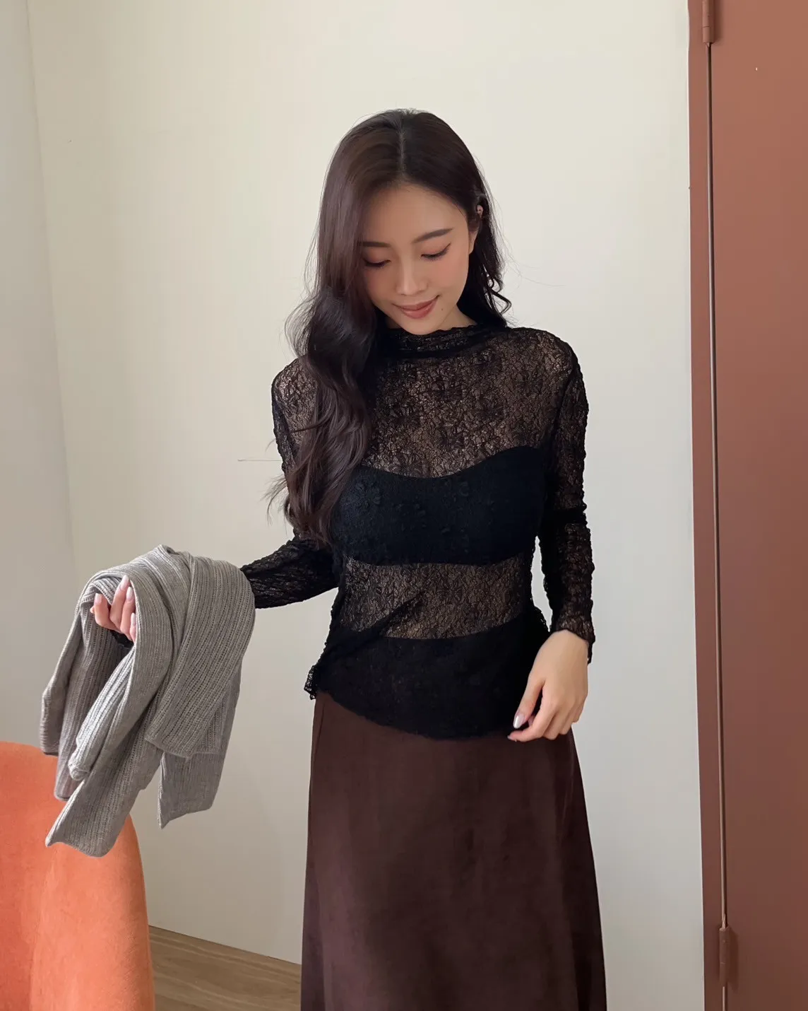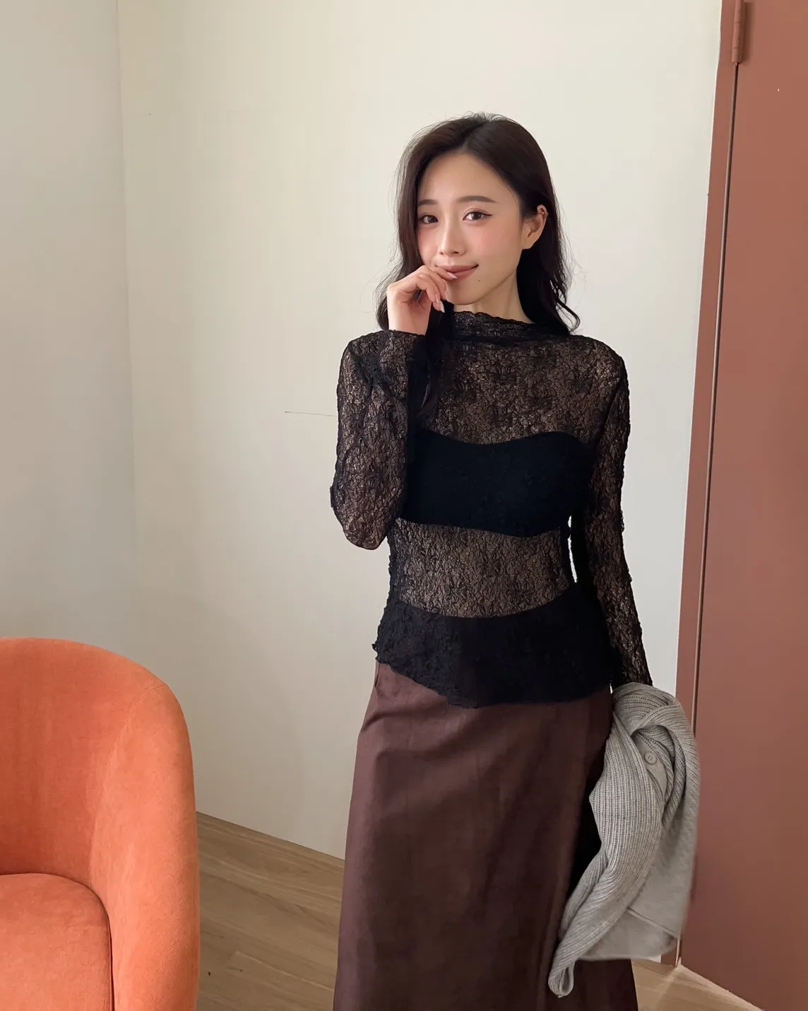 U0088毛線團立領透膚上衣(白/咖啡/紅/黑)