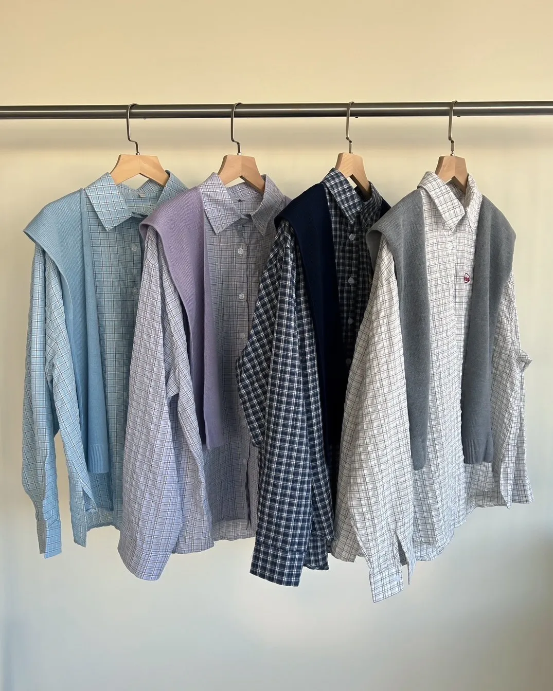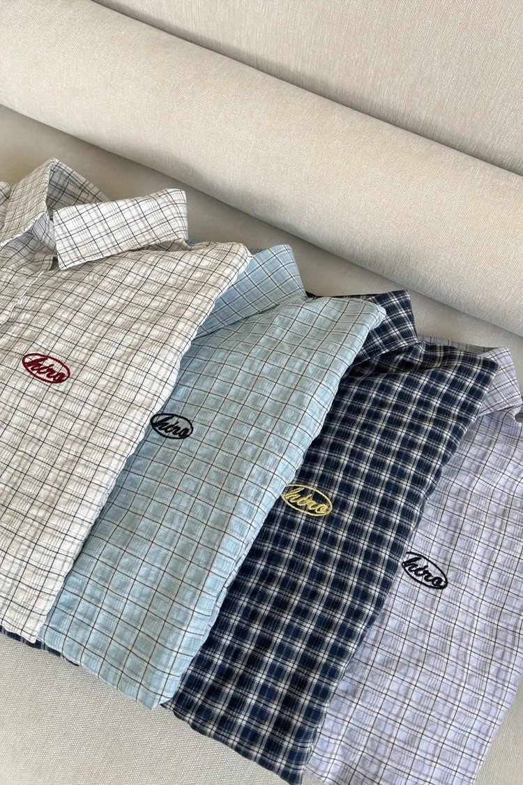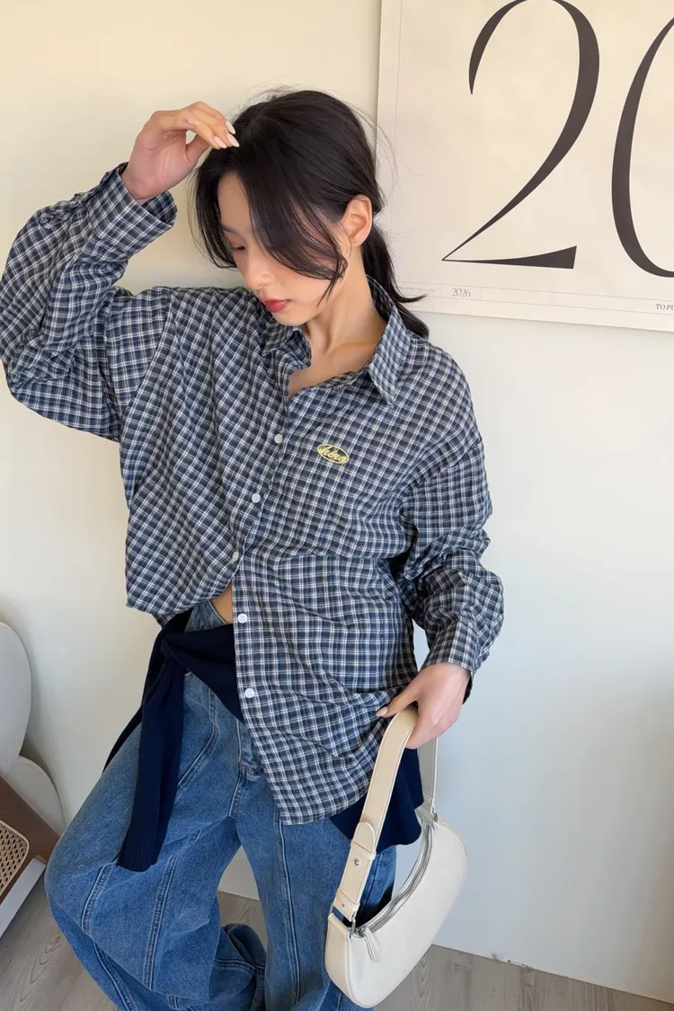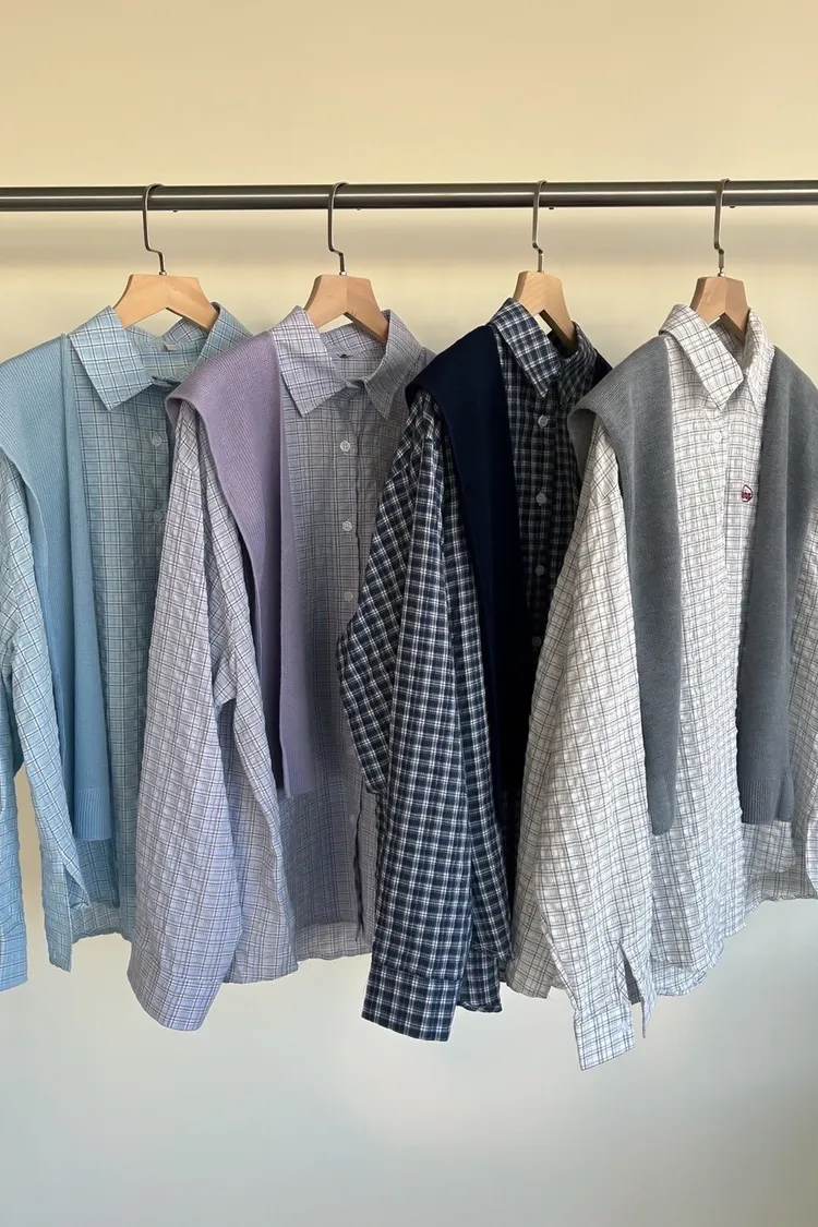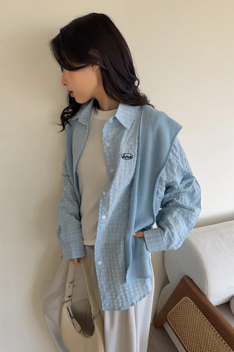 A0042(附披肩)刺繡細格紋泡泡襯衫(白/紫/淺藍/深藍)(售完不補)
