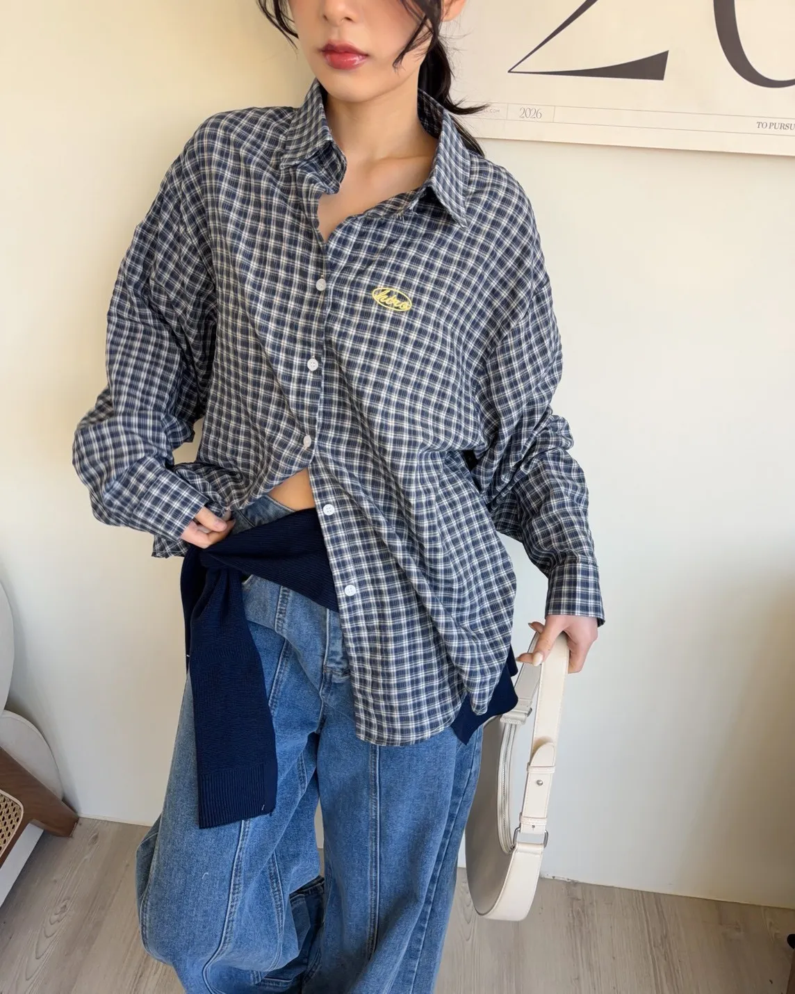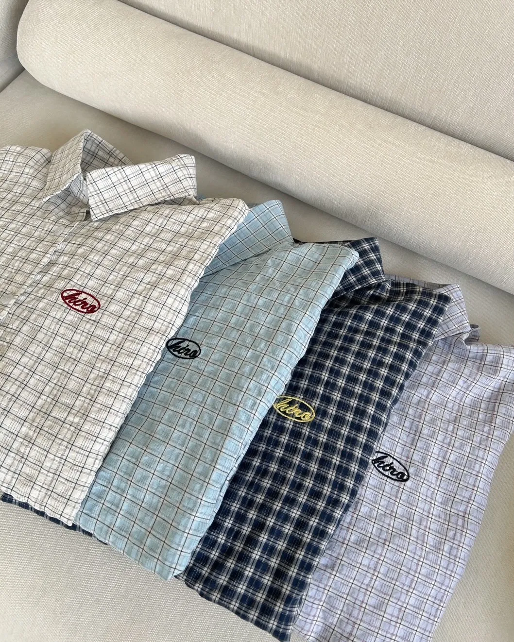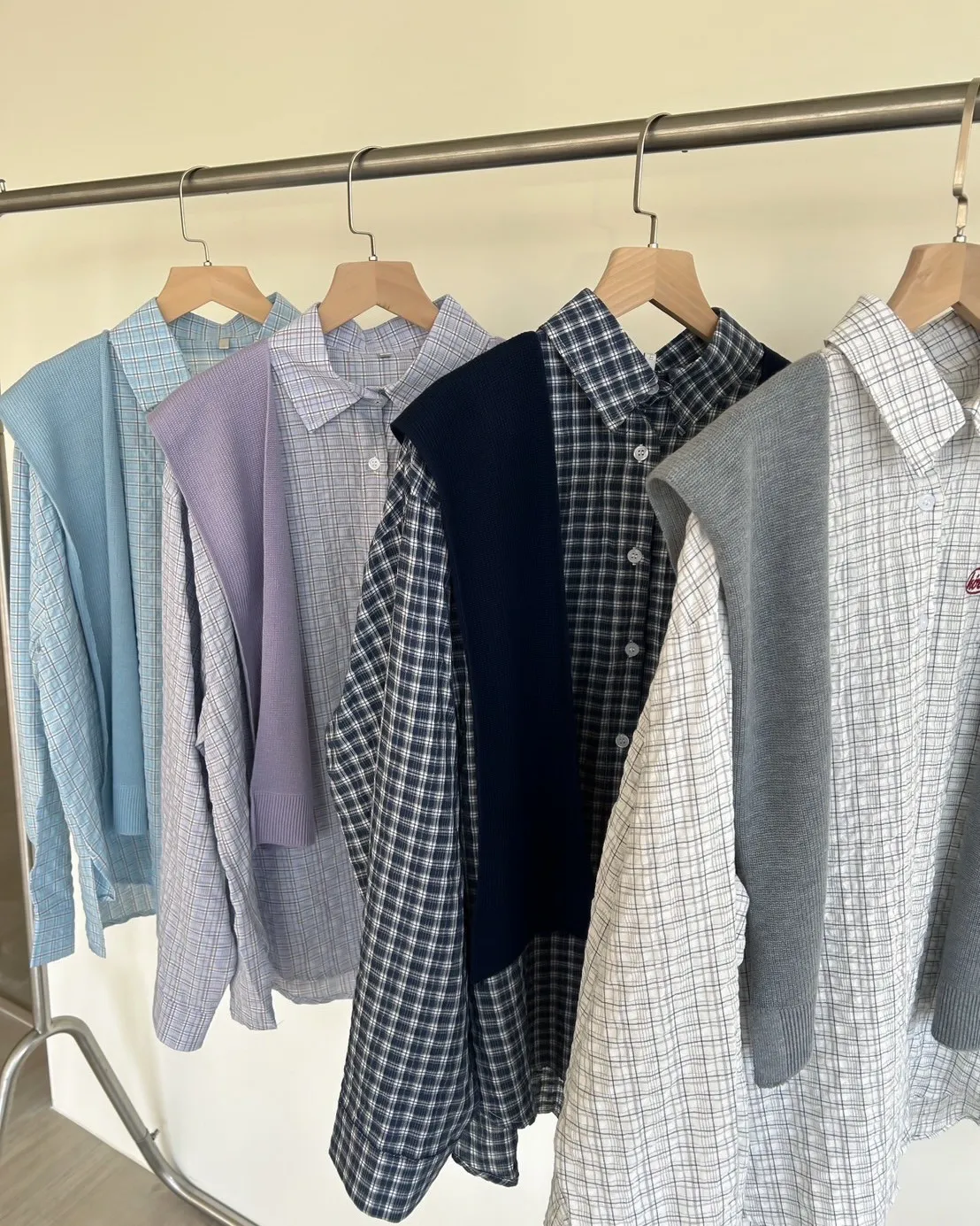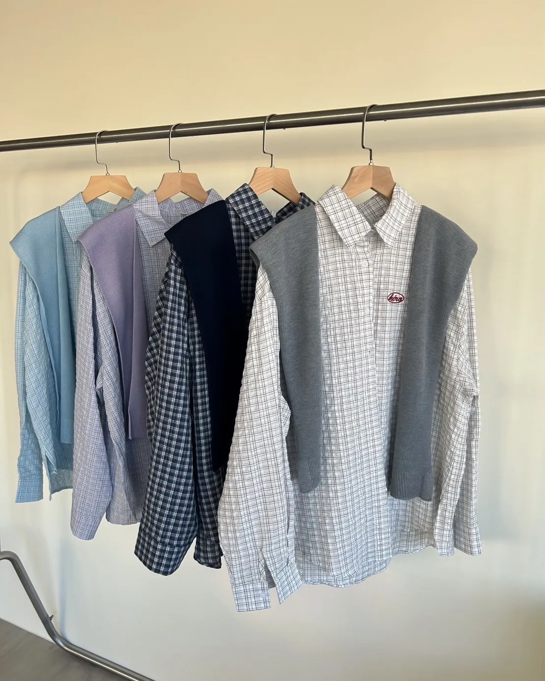 A0042(附披肩)刺繡細格紋泡泡襯衫(白/紫/淺藍/深藍)(售完不補)