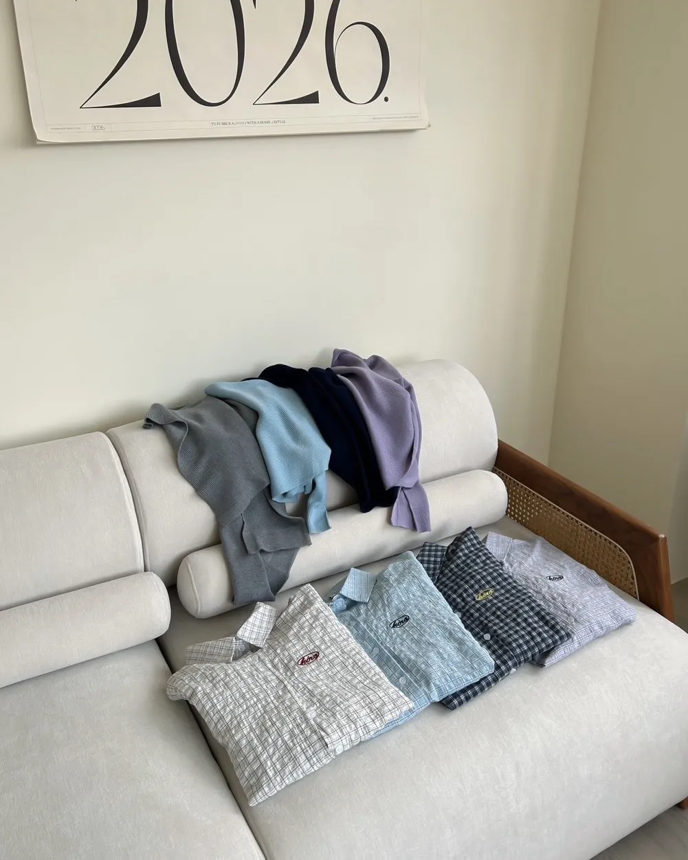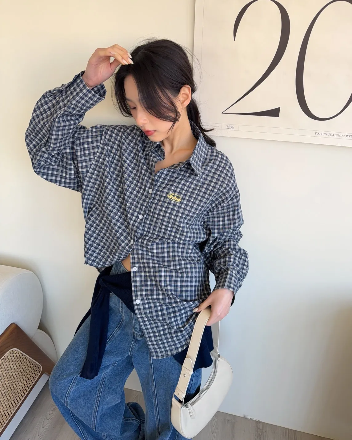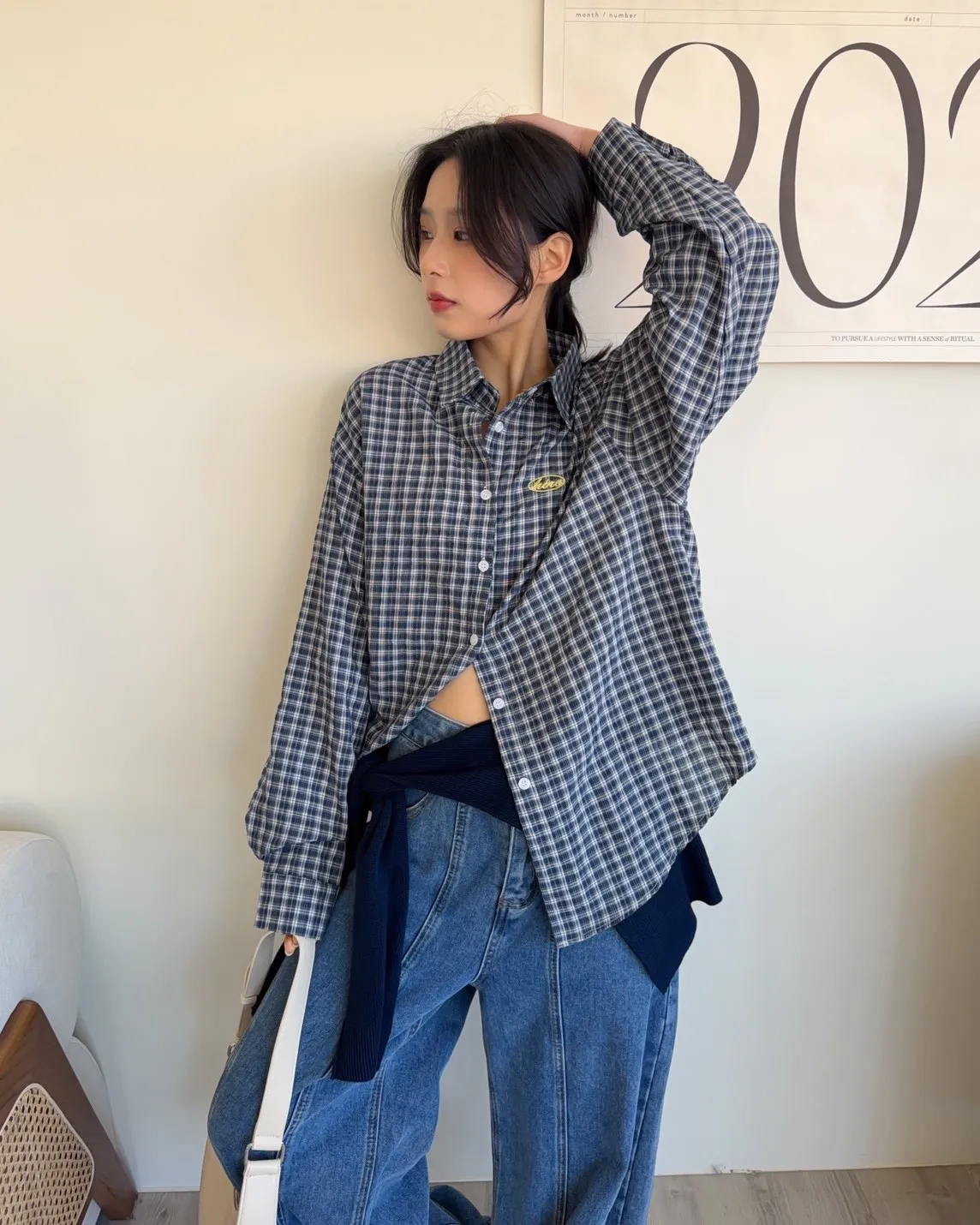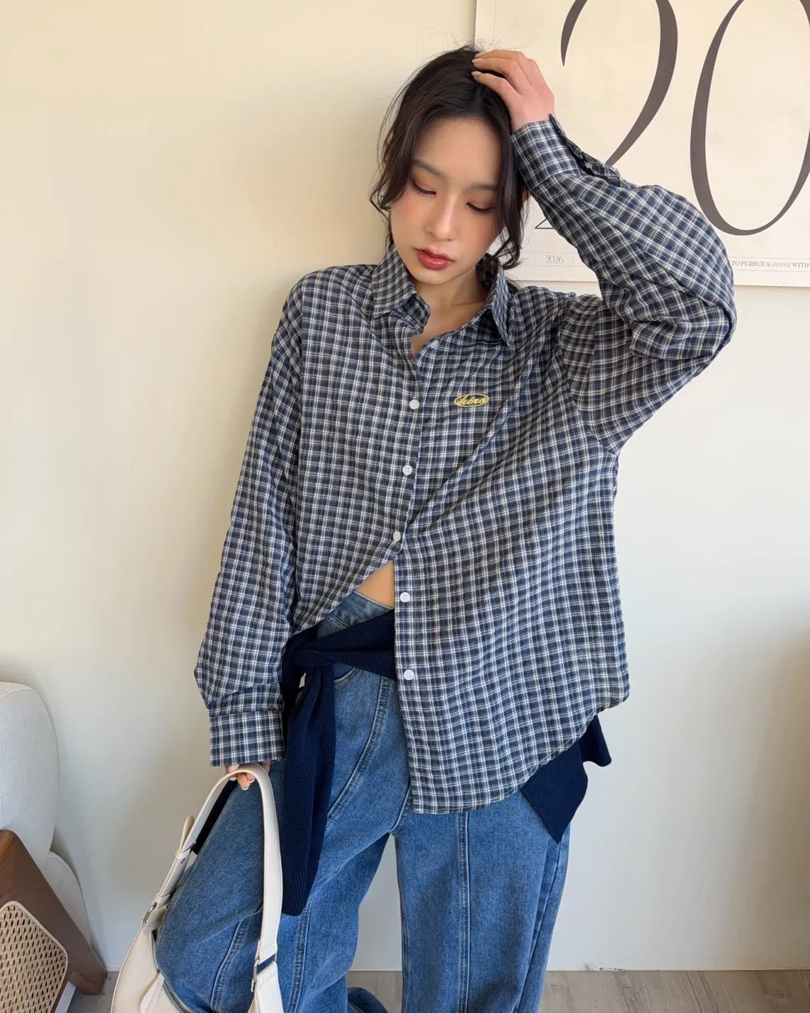 A0042(附披肩)刺繡細格紋泡泡襯衫(白/紫/淺藍/深藍)(售完不補)