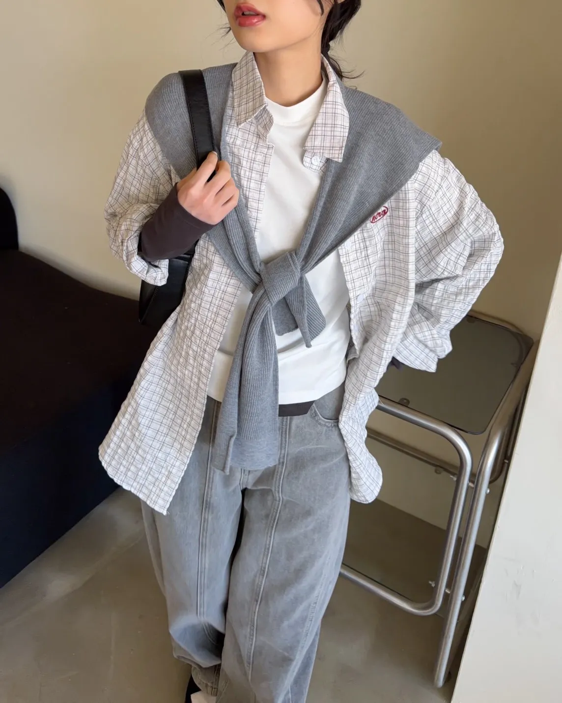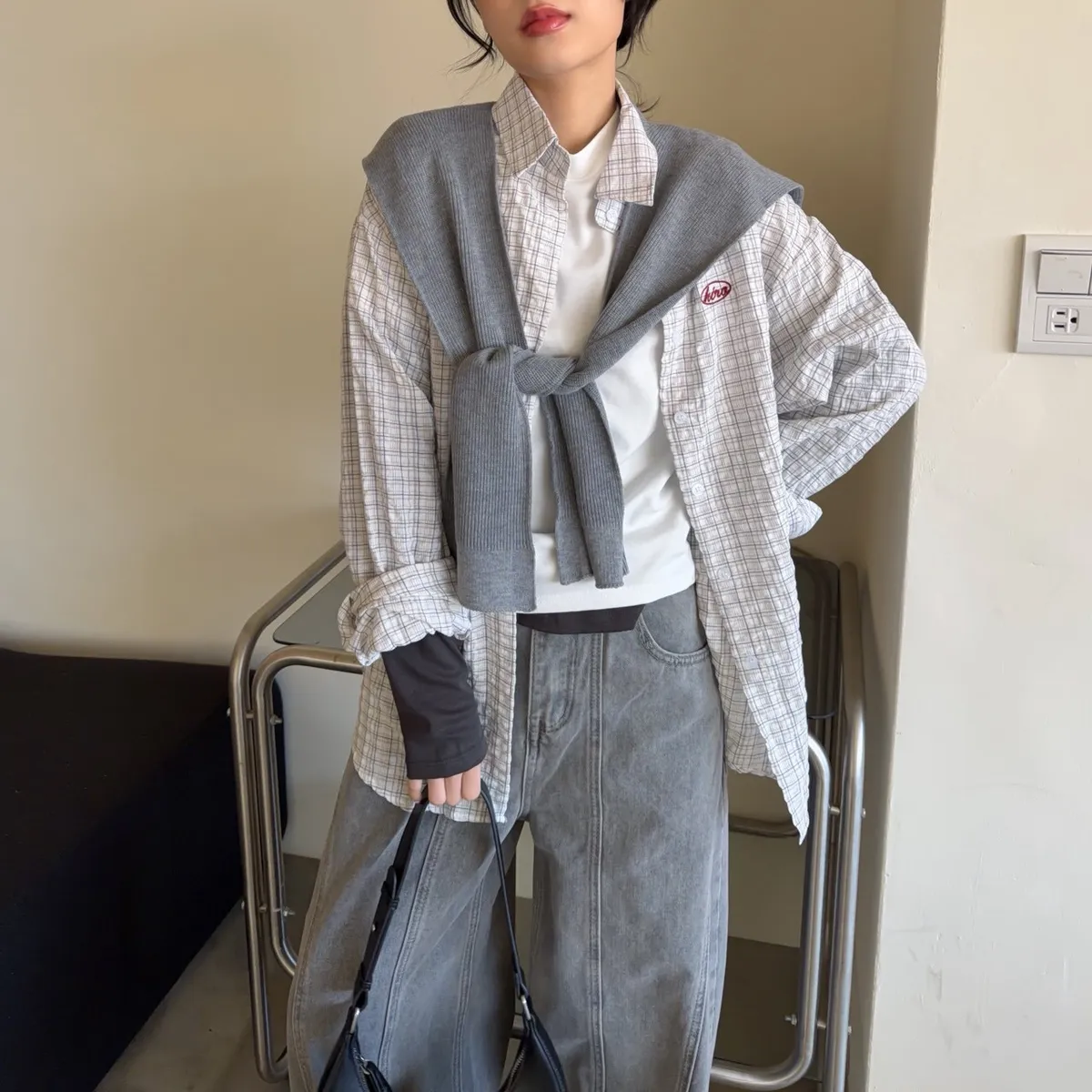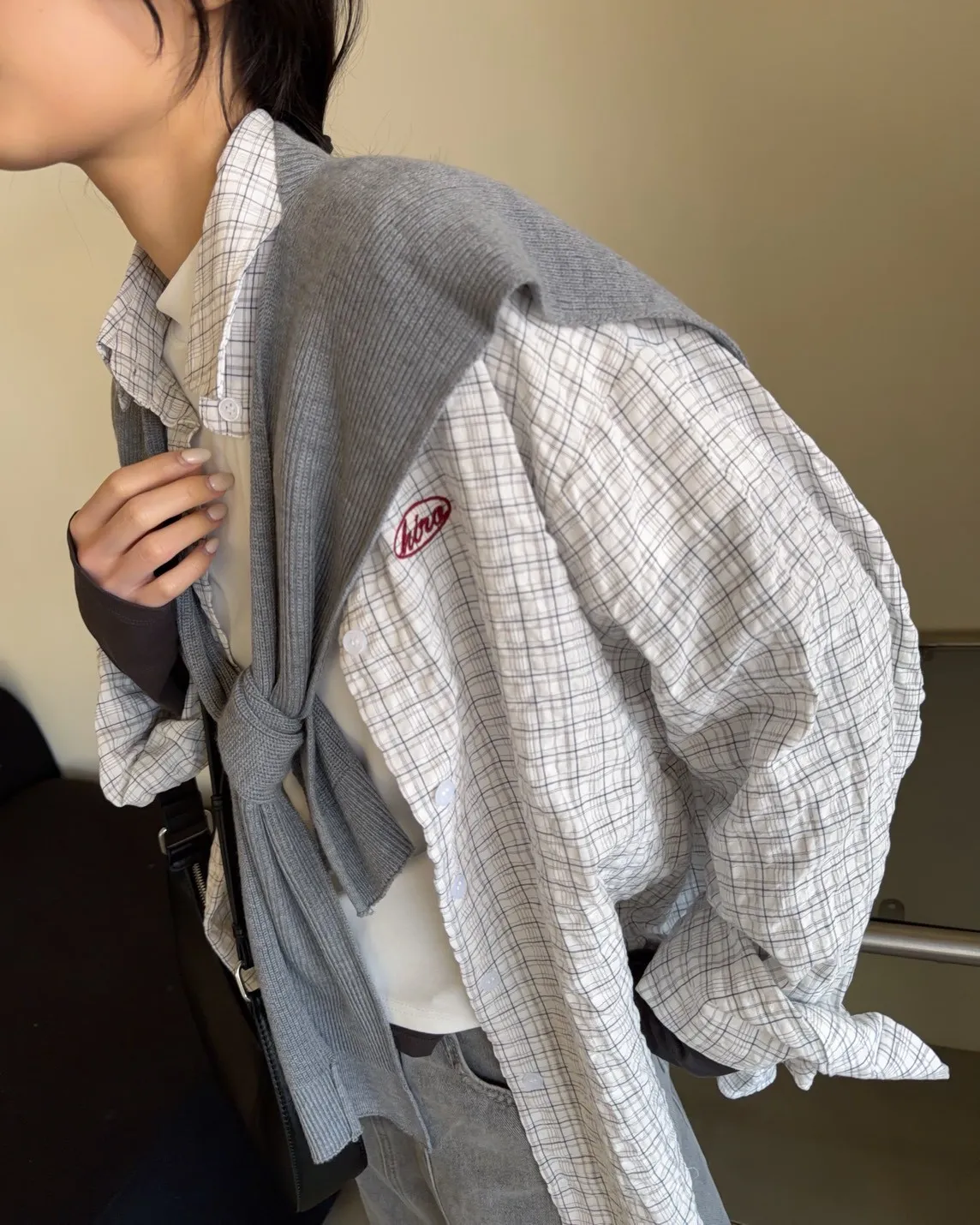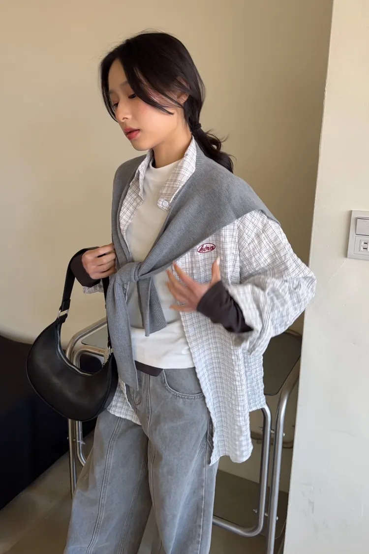 白色襯衫-紅色刺繡-灰色披肩