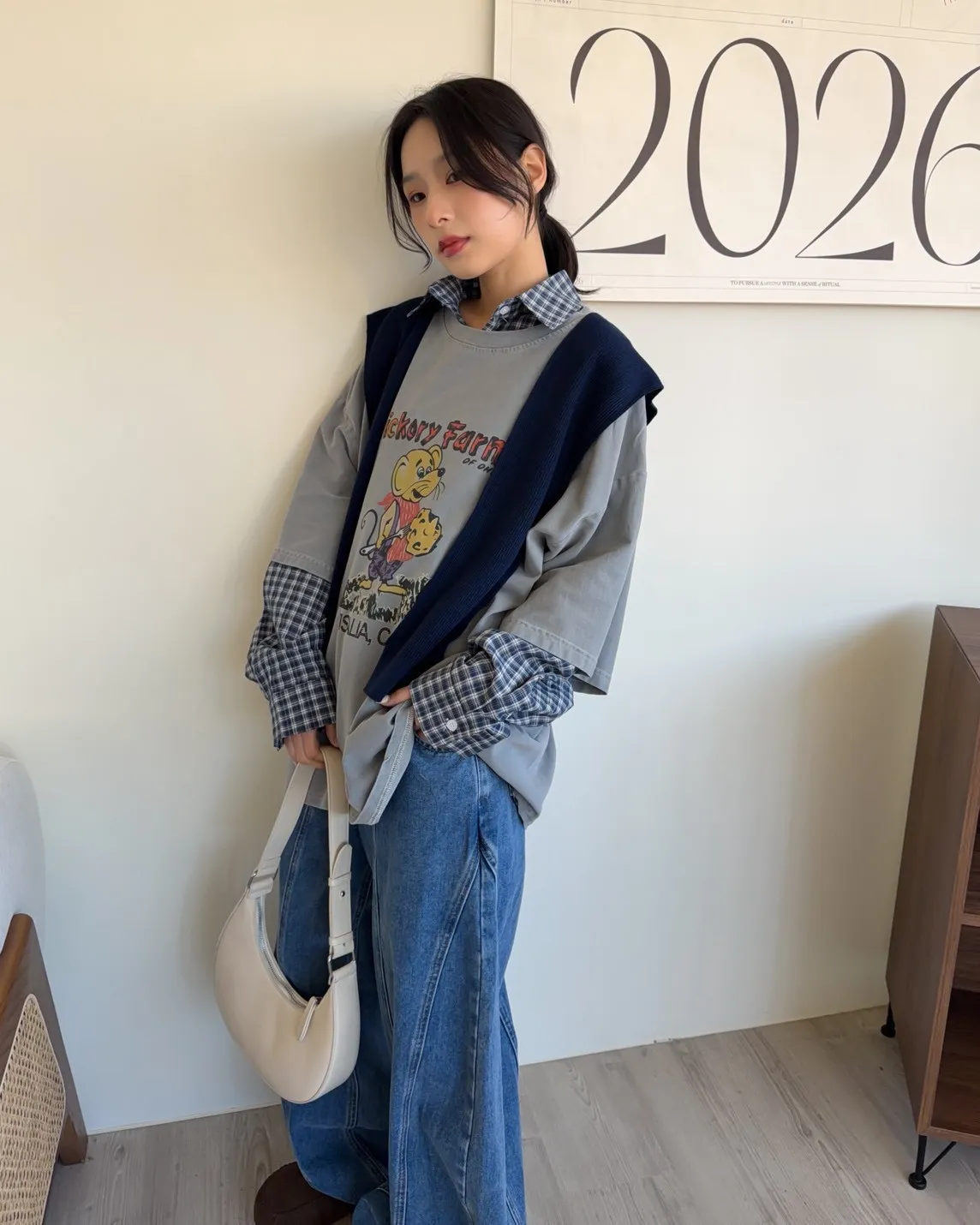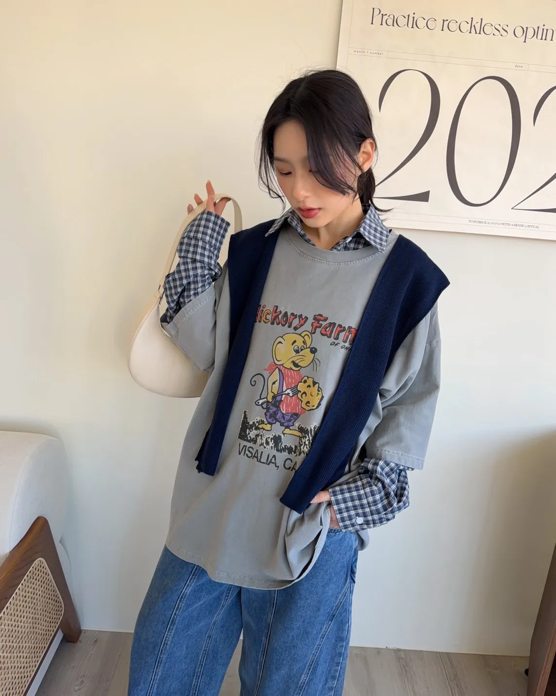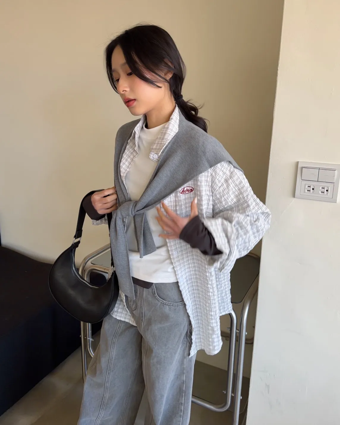 白色襯衫-紅色刺繡-灰色披肩